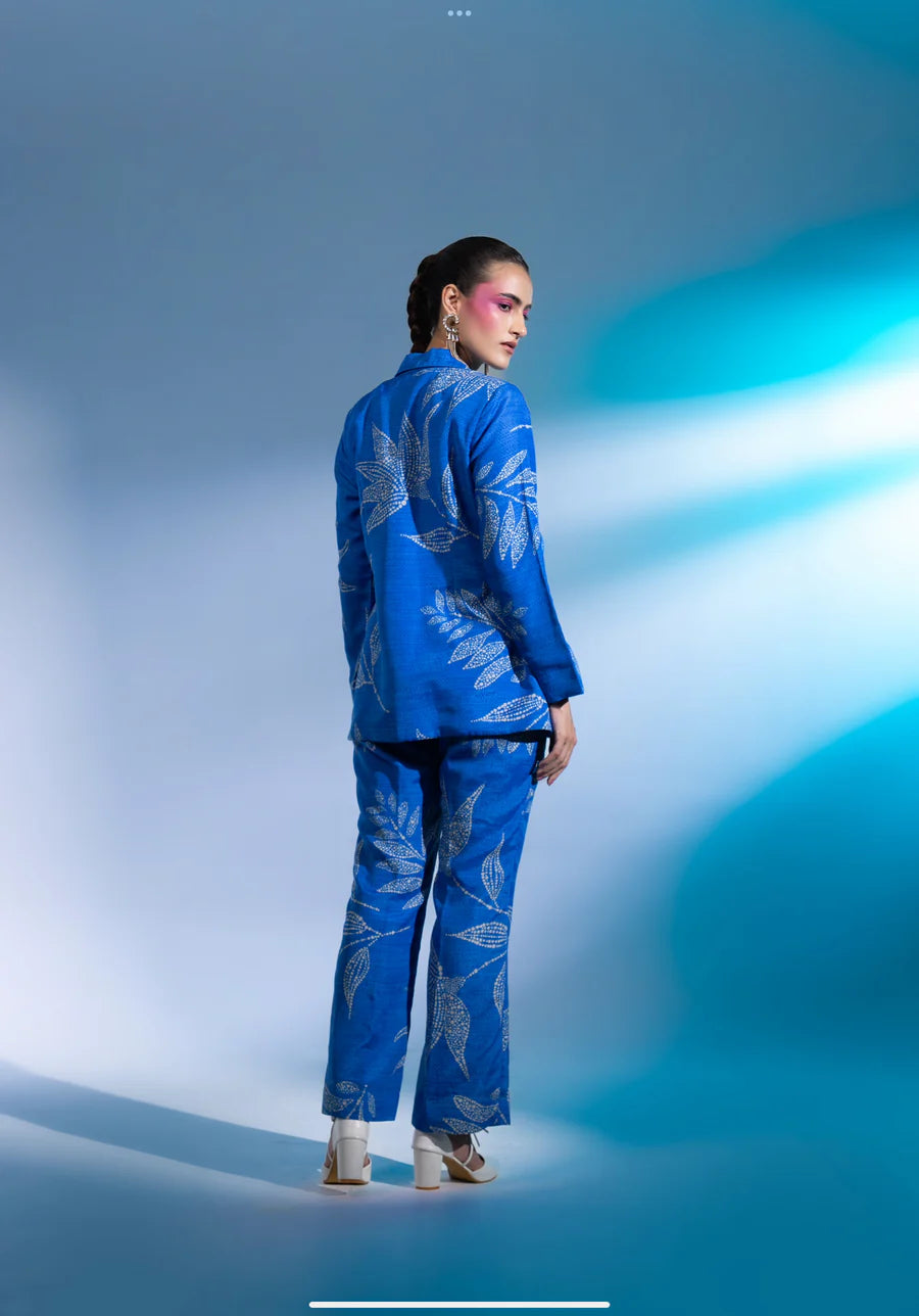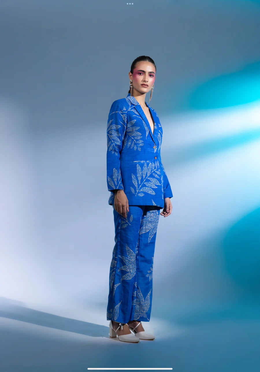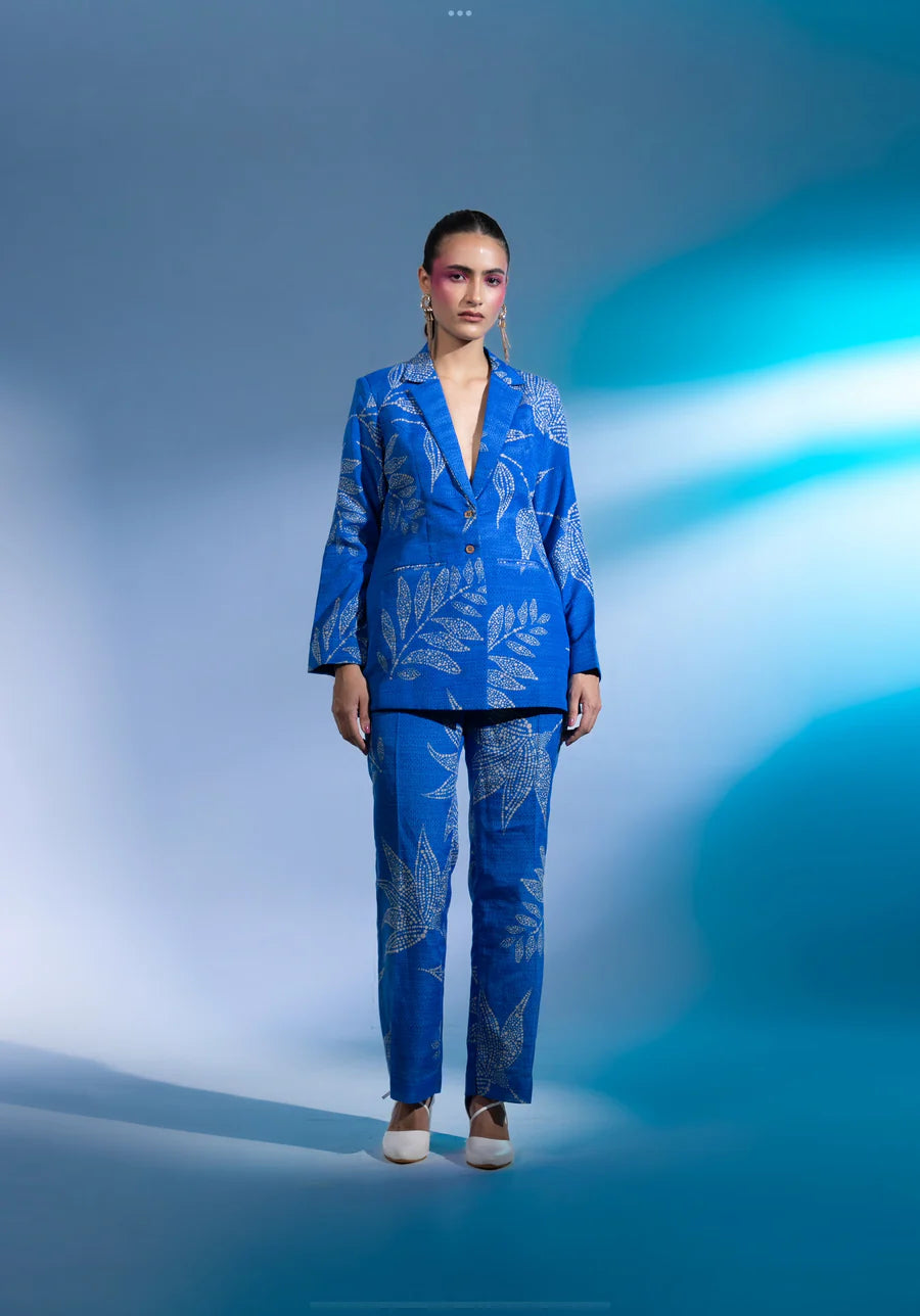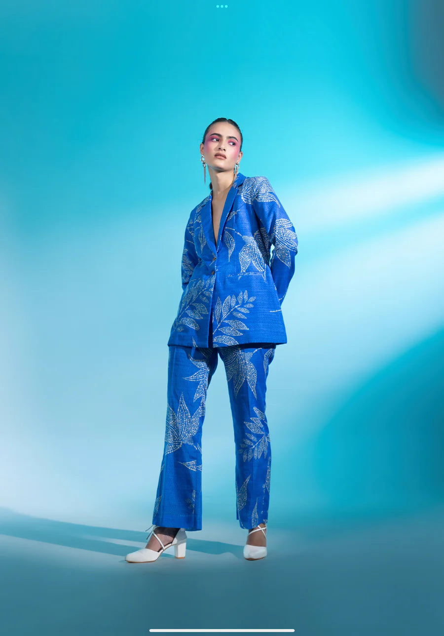 An electric blue Kota Doriya fabric blazer paired with straight pants offers a comfortable and versatile fit. This timeless and effortless ensemble allows you to style it in various ways, ensuring you always look different and stylish.