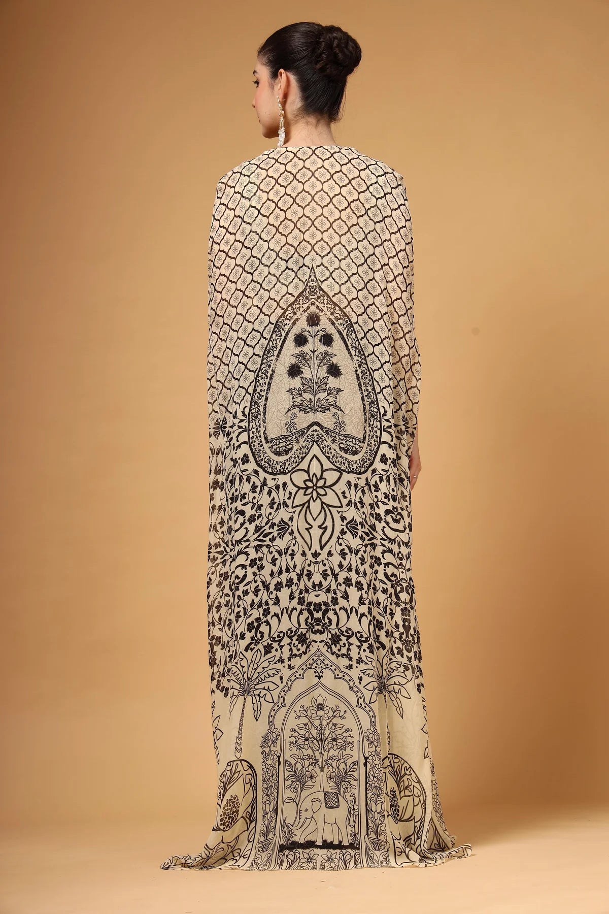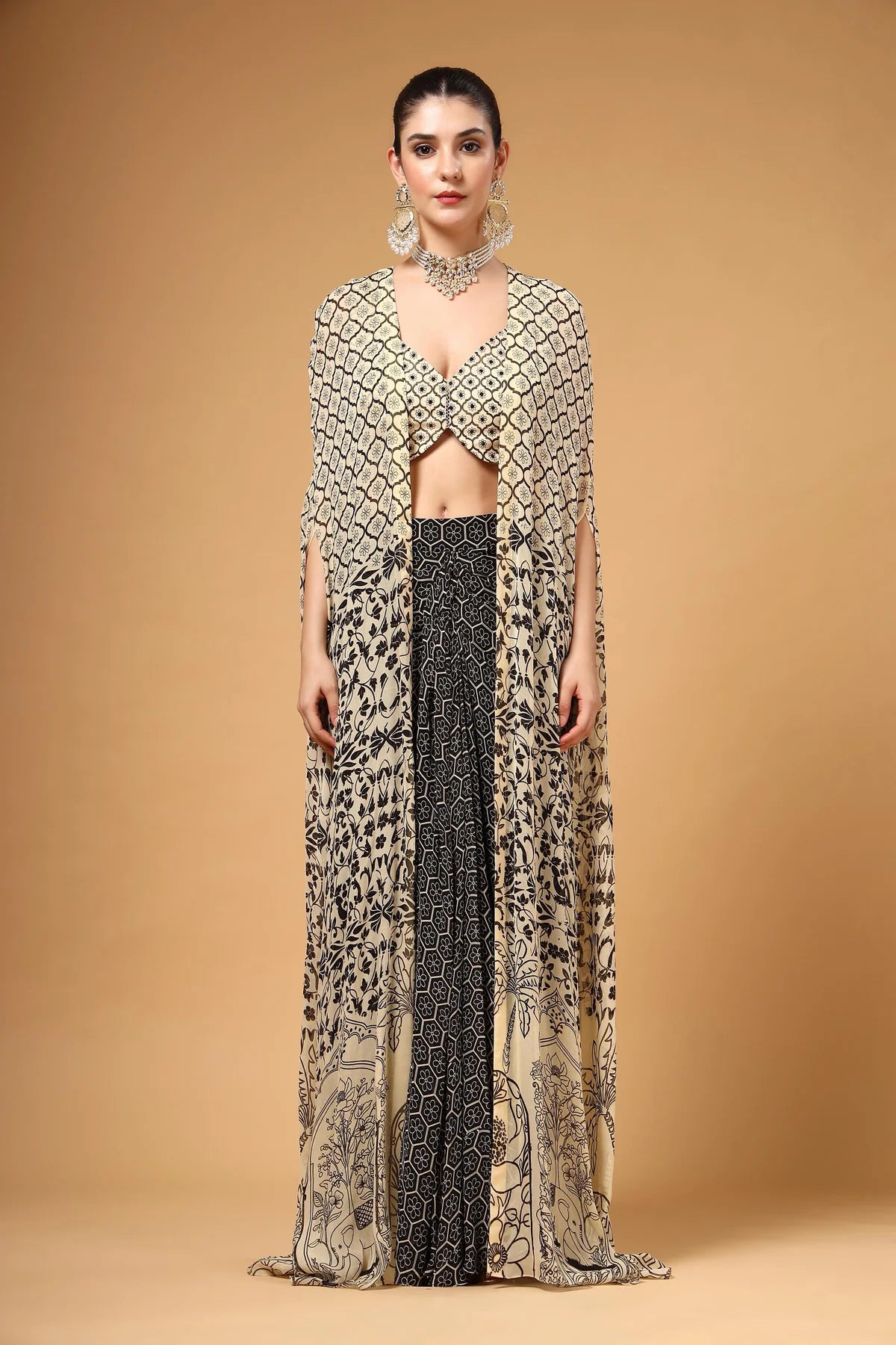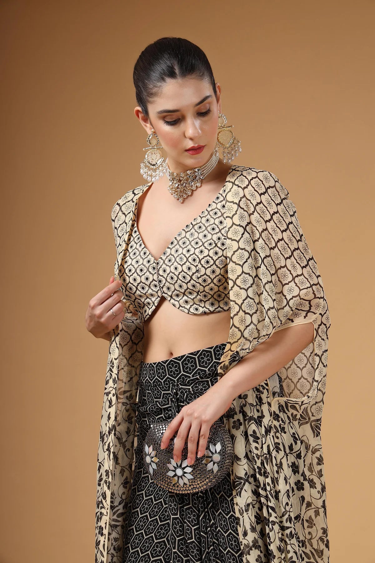A beautiful printed cape set featuring a blouse with sequin embroidery paired with a draped skirt. Lightweight, comfortable, and easy to carry, this ensemble perfectly balances glamour with effortless elegance.