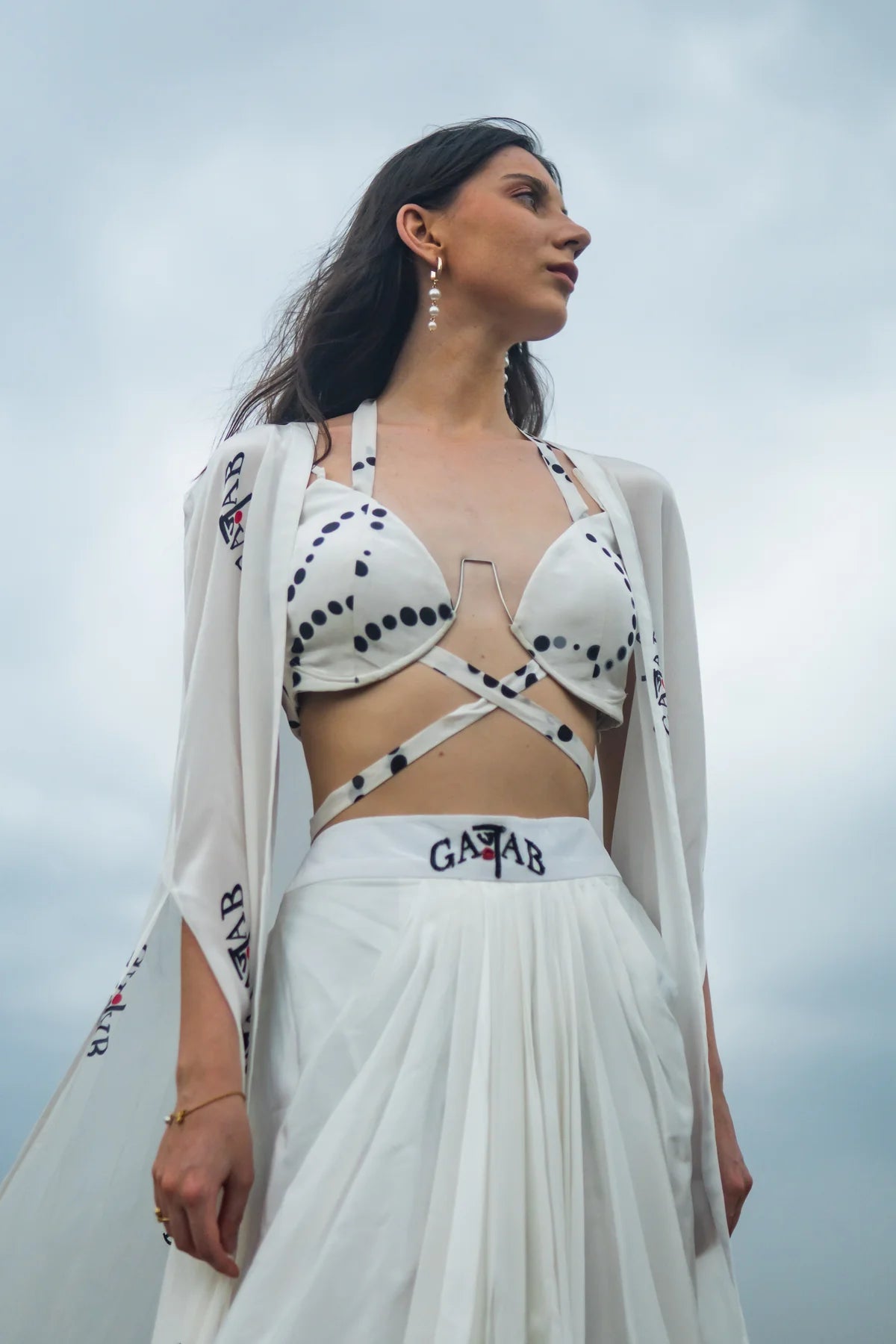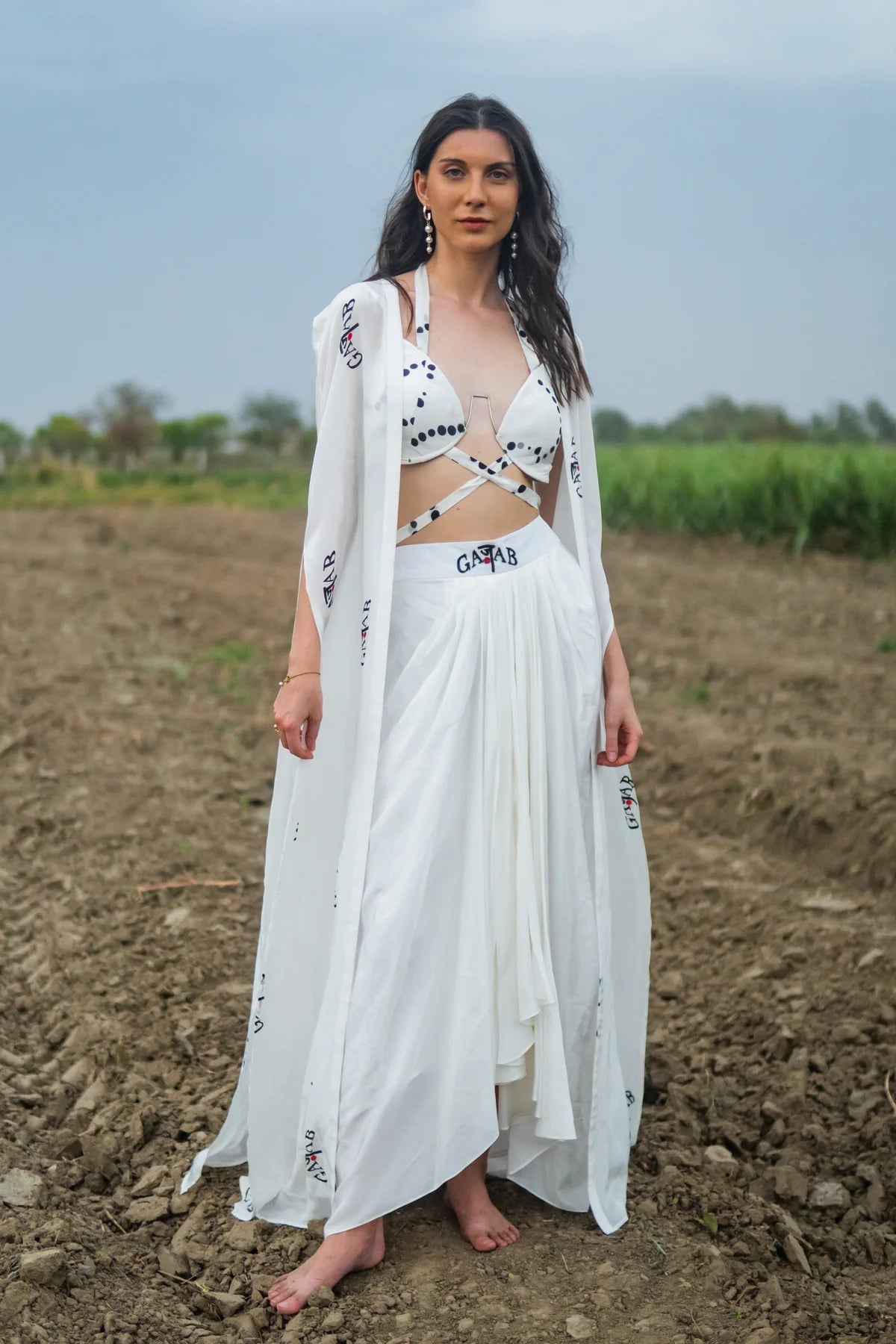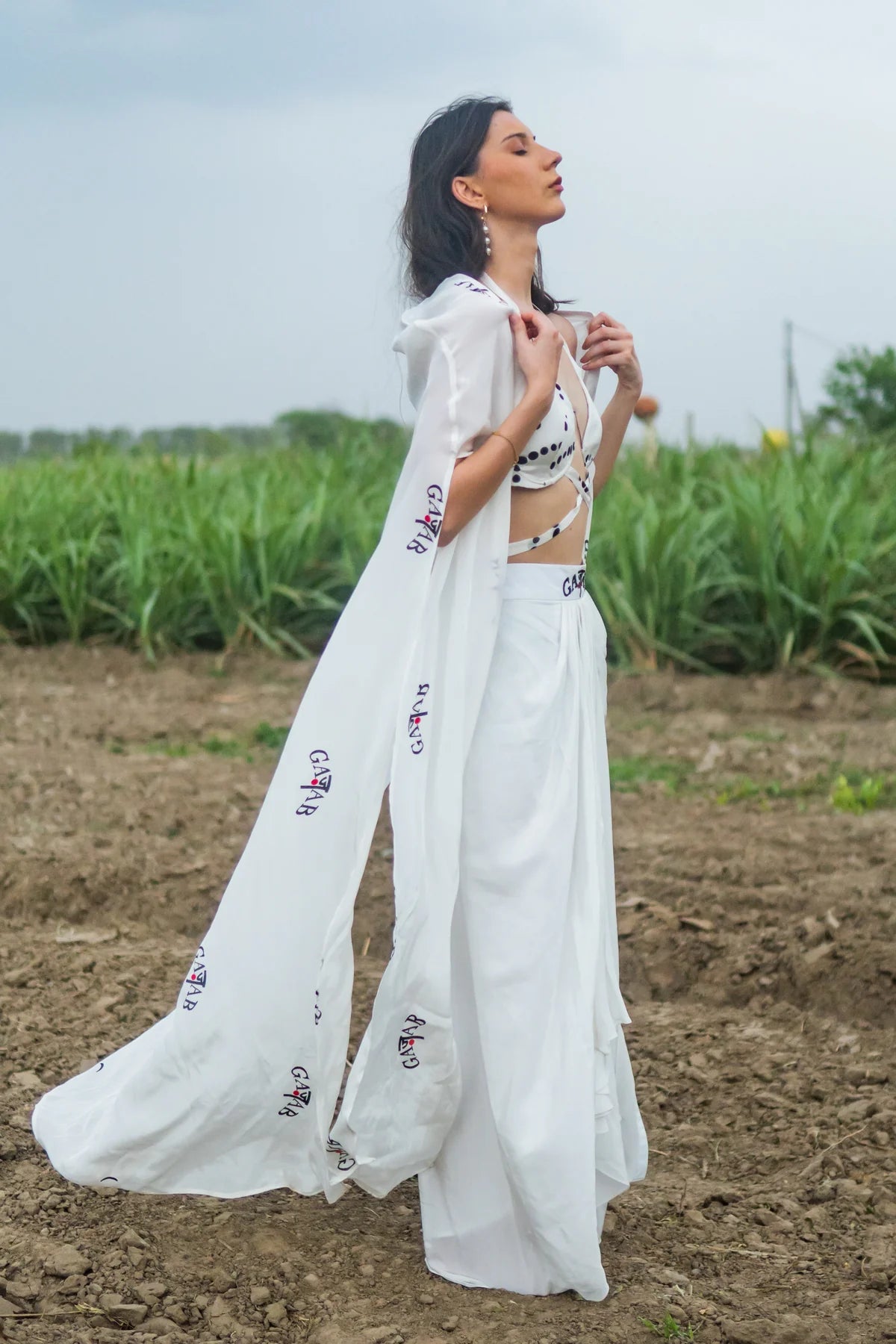 A structured blouse paired with a draped skirt and a complementing cape. The blouse features a string tie-up around the neck and an adjustable waist string to enhance the silhouette, adding a chic and contemporary touch. The skirt is adorned with bold and beautiful sequin embroidery on the waistband, creating a striking focal point. Crafted in a lightweight fabric, this ensemble is perfect for summer wear - stylish, comfortable and easy to carry.