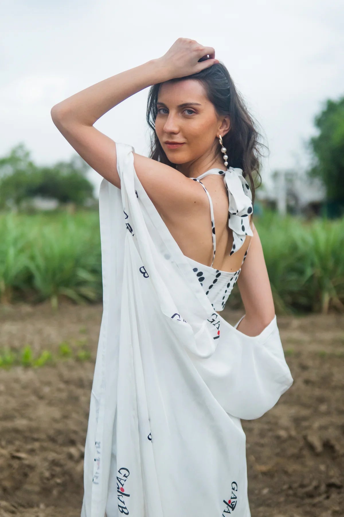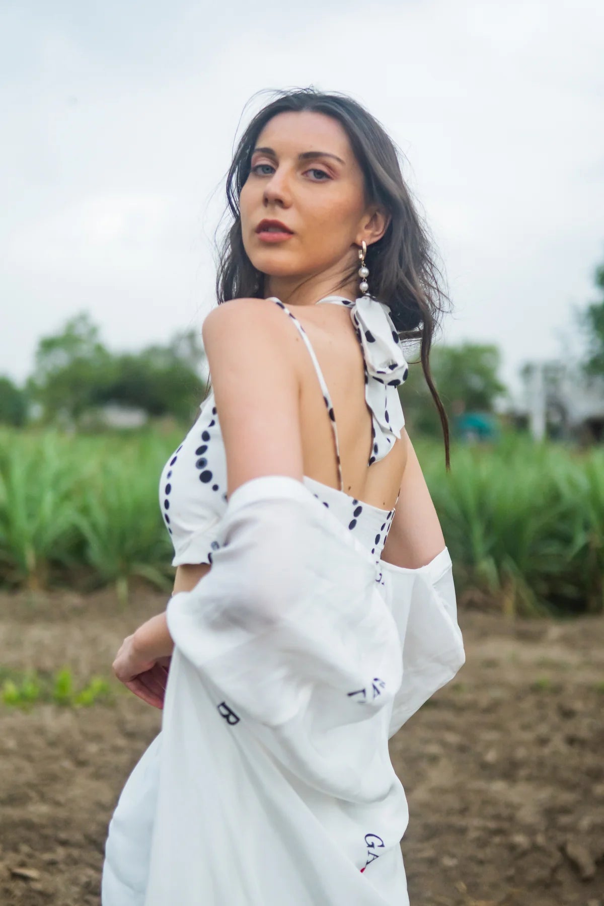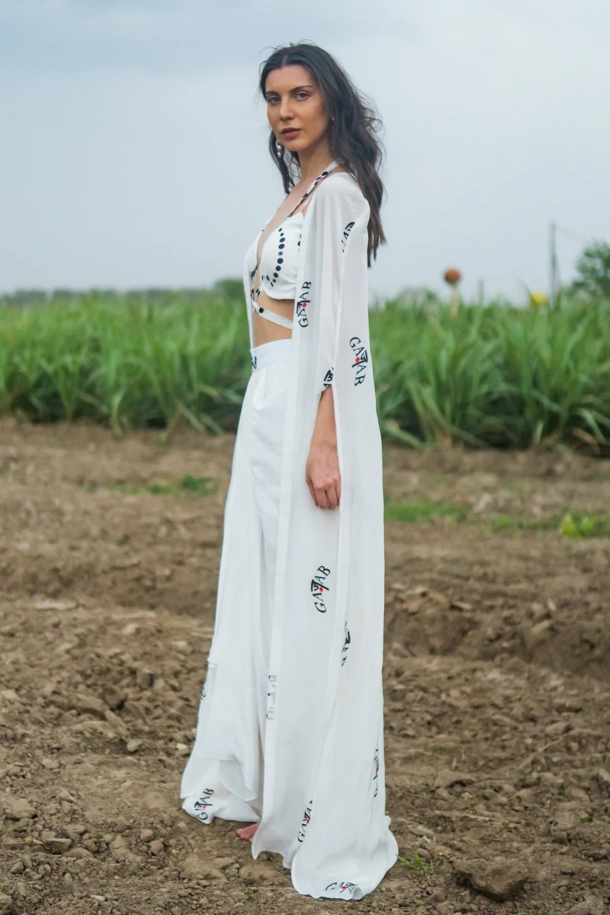 A structured blouse paired with a draped skirt and a complementing cape. The blouse features a string tie-up around the neck and an adjustable waist string to enhance the silhouette, adding a chic and contemporary touch. The skirt is adorned with bold and beautiful sequin embroidery on the waistband, creating a striking focal point. Crafted in a lightweight fabric, this ensemble is perfect for summer wear - stylish, comfortable and easy to carry.