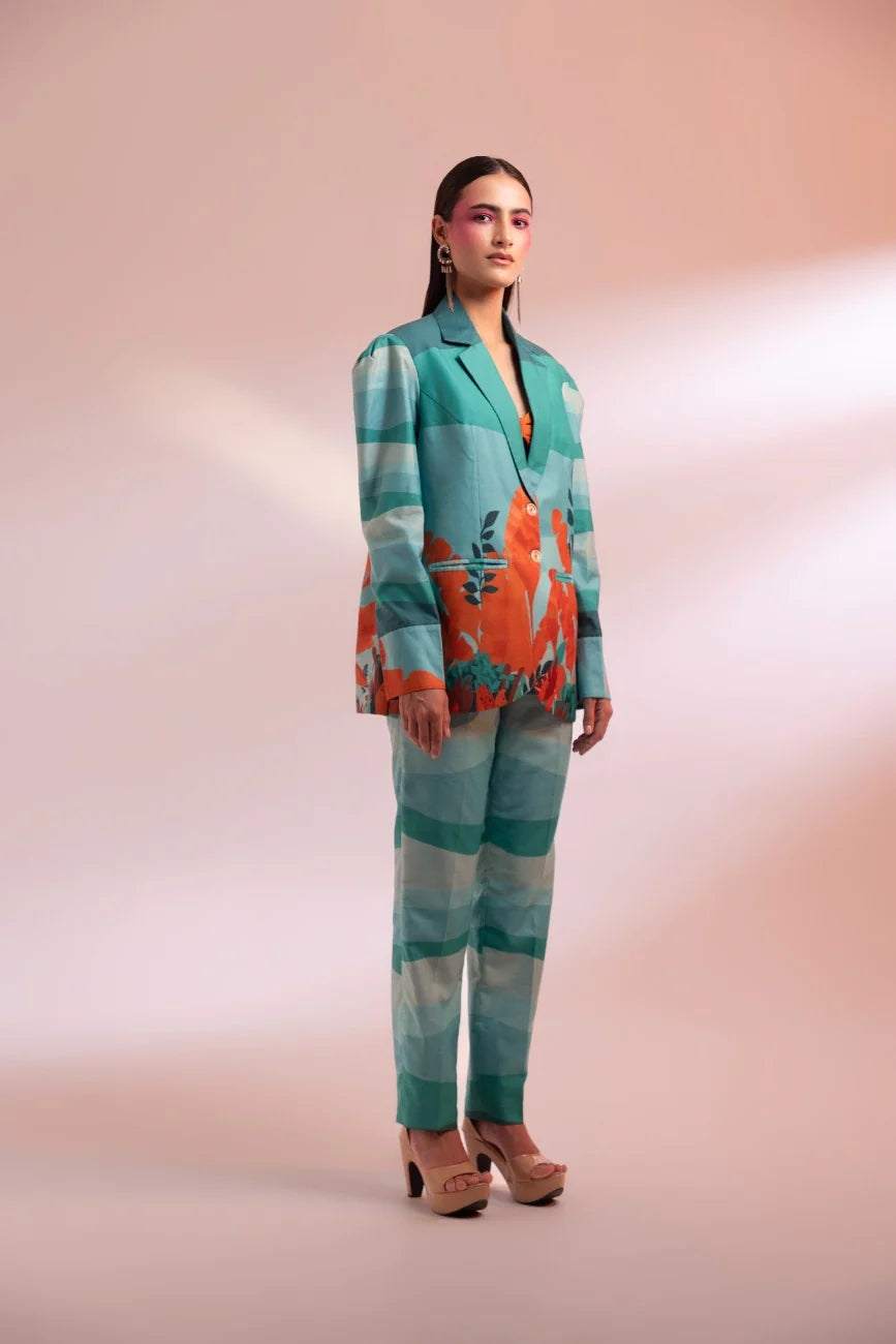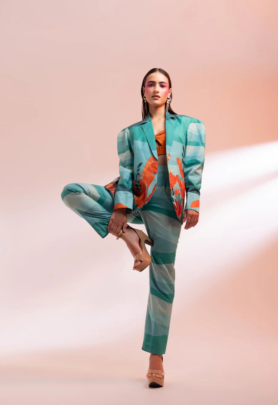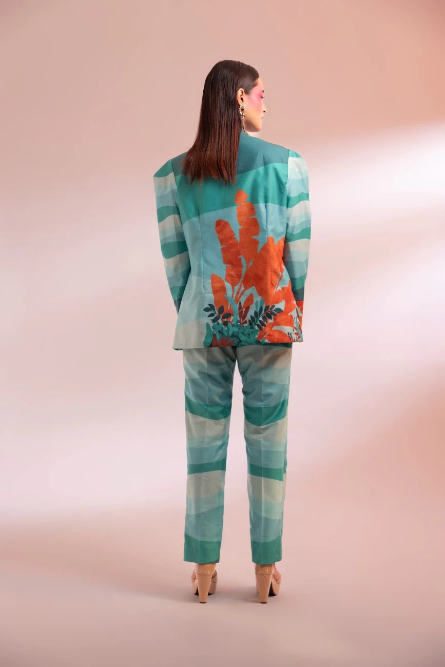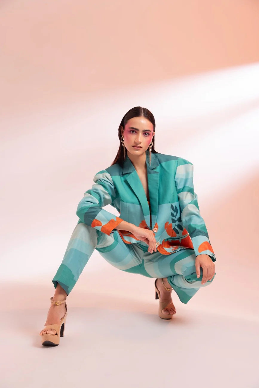A shades of green Chanderi silk lapel collar blazer with a tint of orange, paired with matching straight pants and a bustier, offers a unique and refreshing look. The distinct print placement ensures you stand out effortlessly, while the soothing colors add style and comfort.