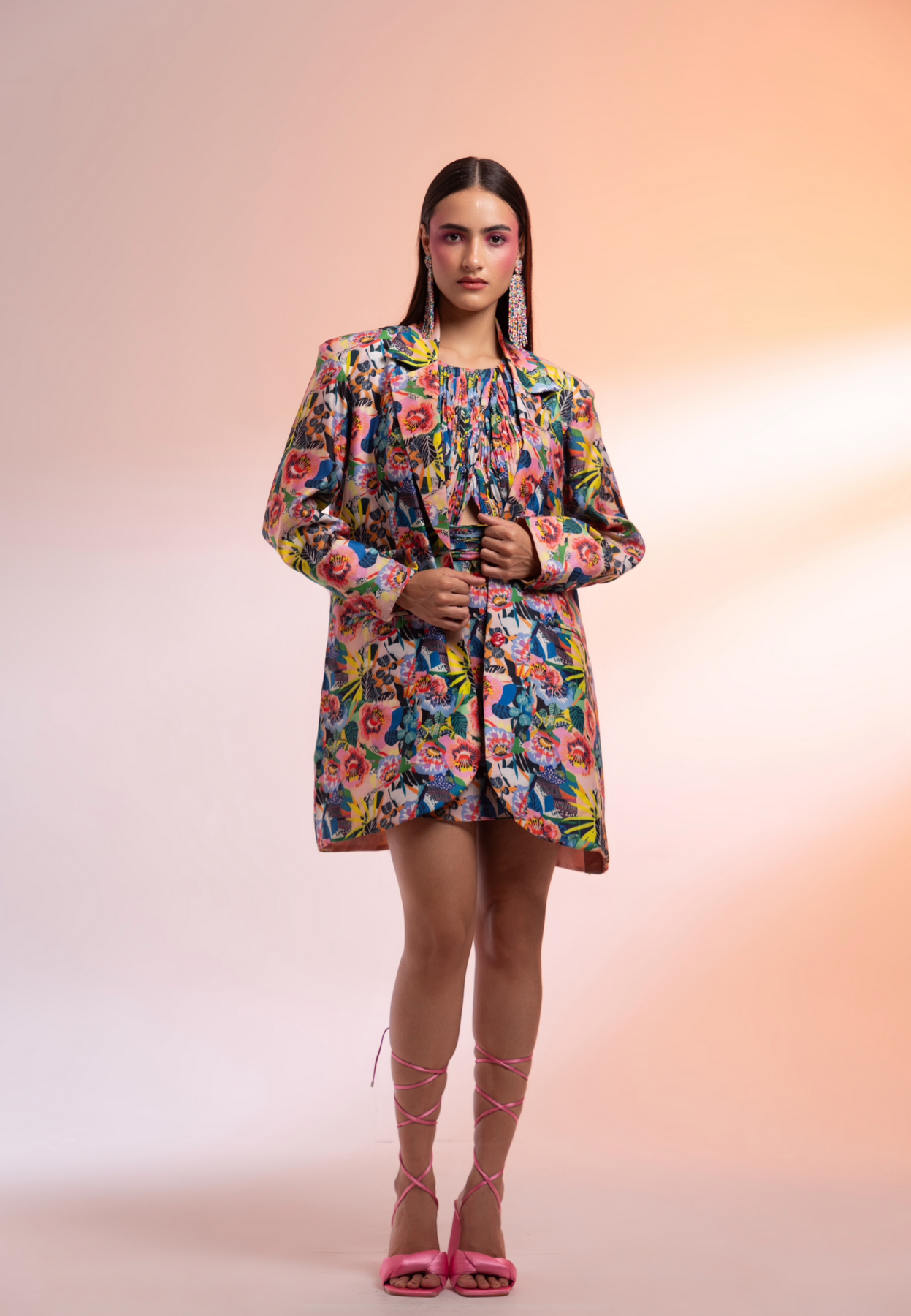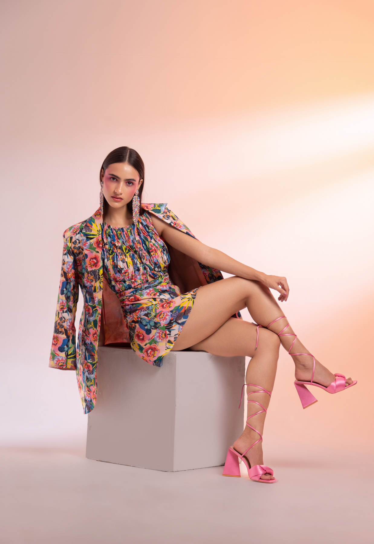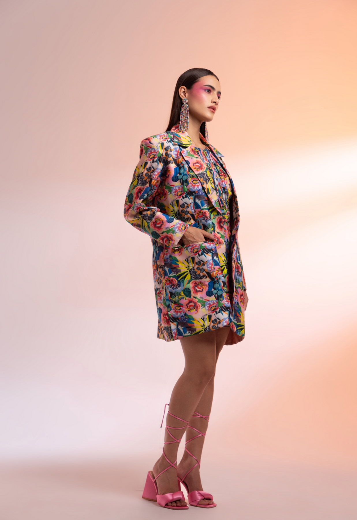 Elevate your wardrobe with Gazab by Miku Kumar’s colorful floral print Chanderi silk blazer, perfectly paired with a short pleated georgette dress. This luxurious anti-fit jacket exudes sophistication through its vibrant print and sumptuous silk, while the fitted dress enhances your silhouette with elegant charm. Together, they create a timeless look that effortlessly blends style and comfort for any occasion.