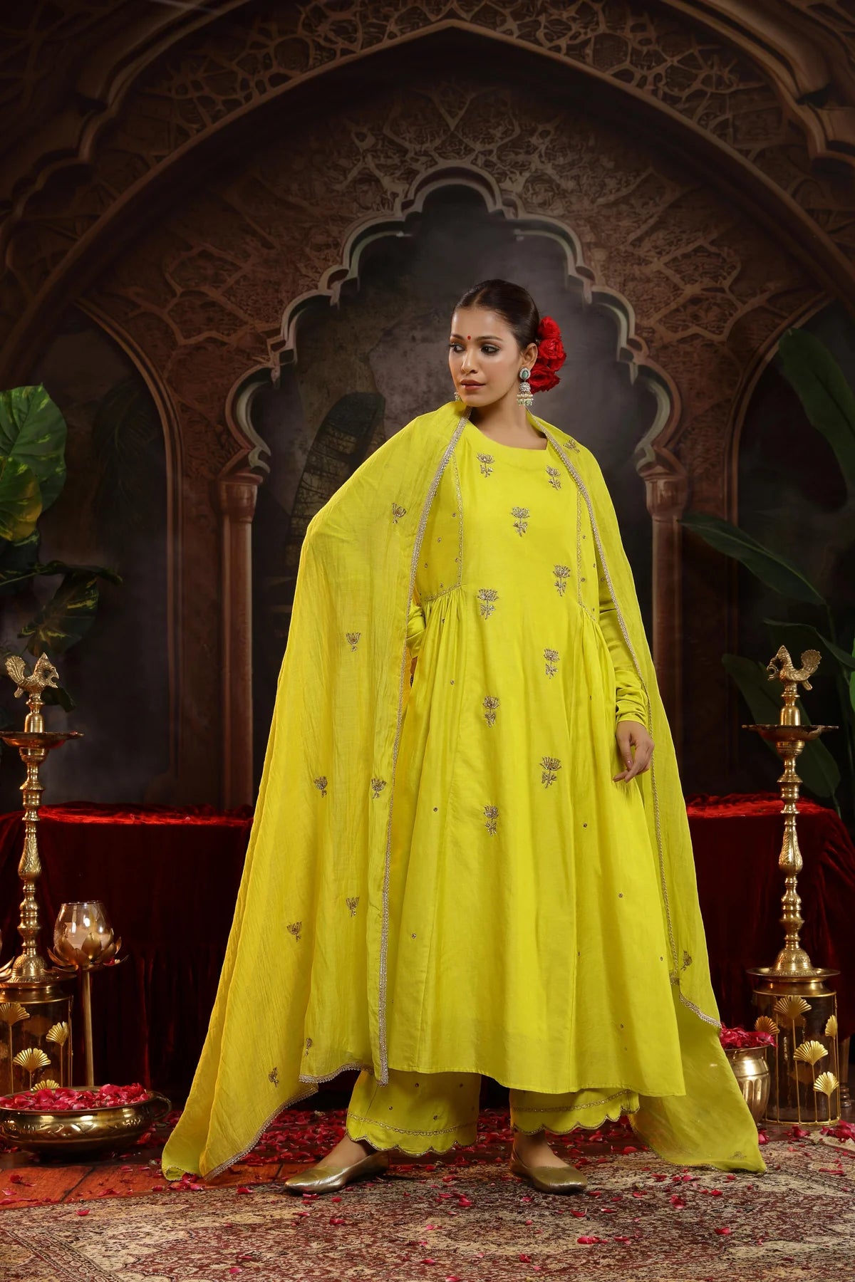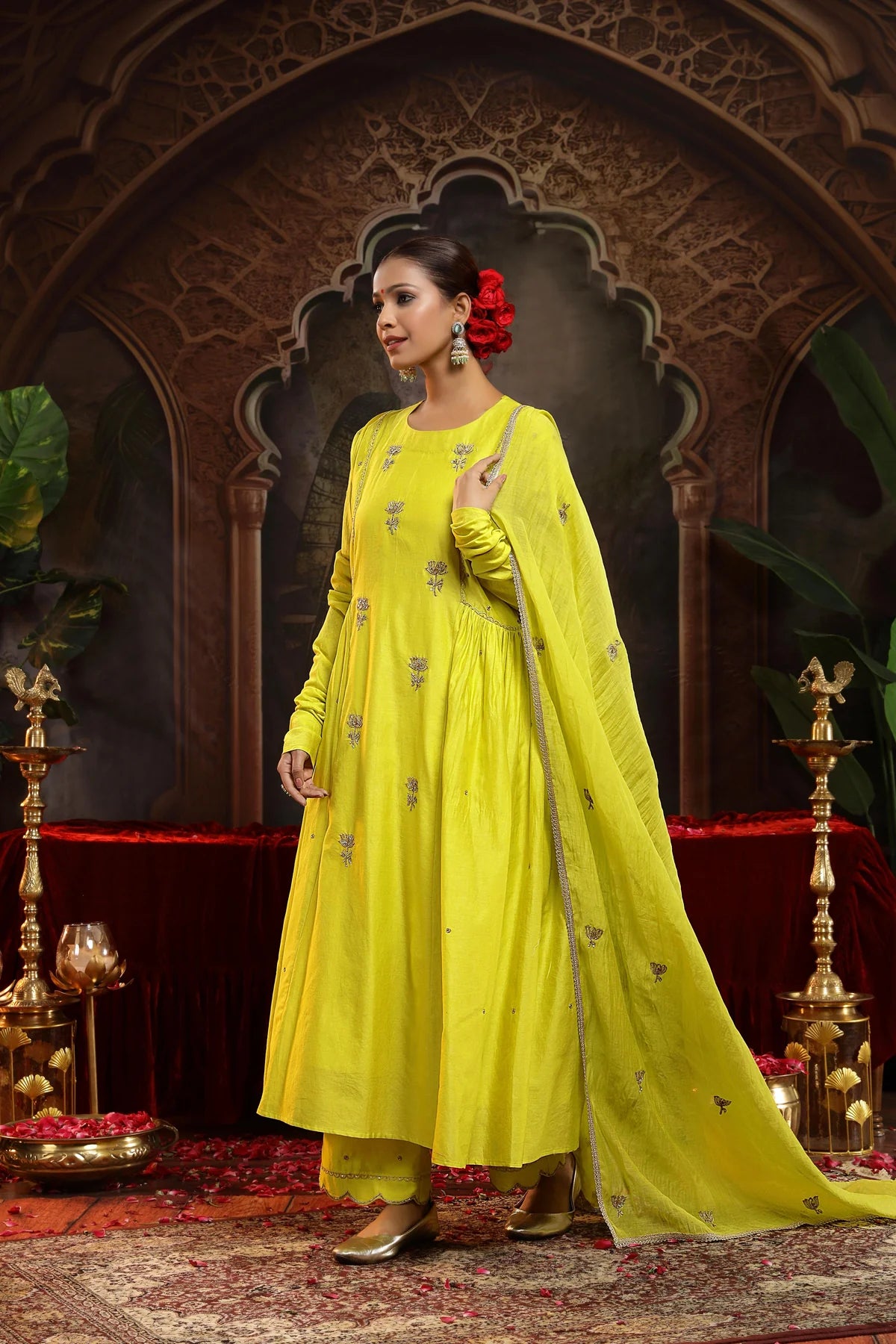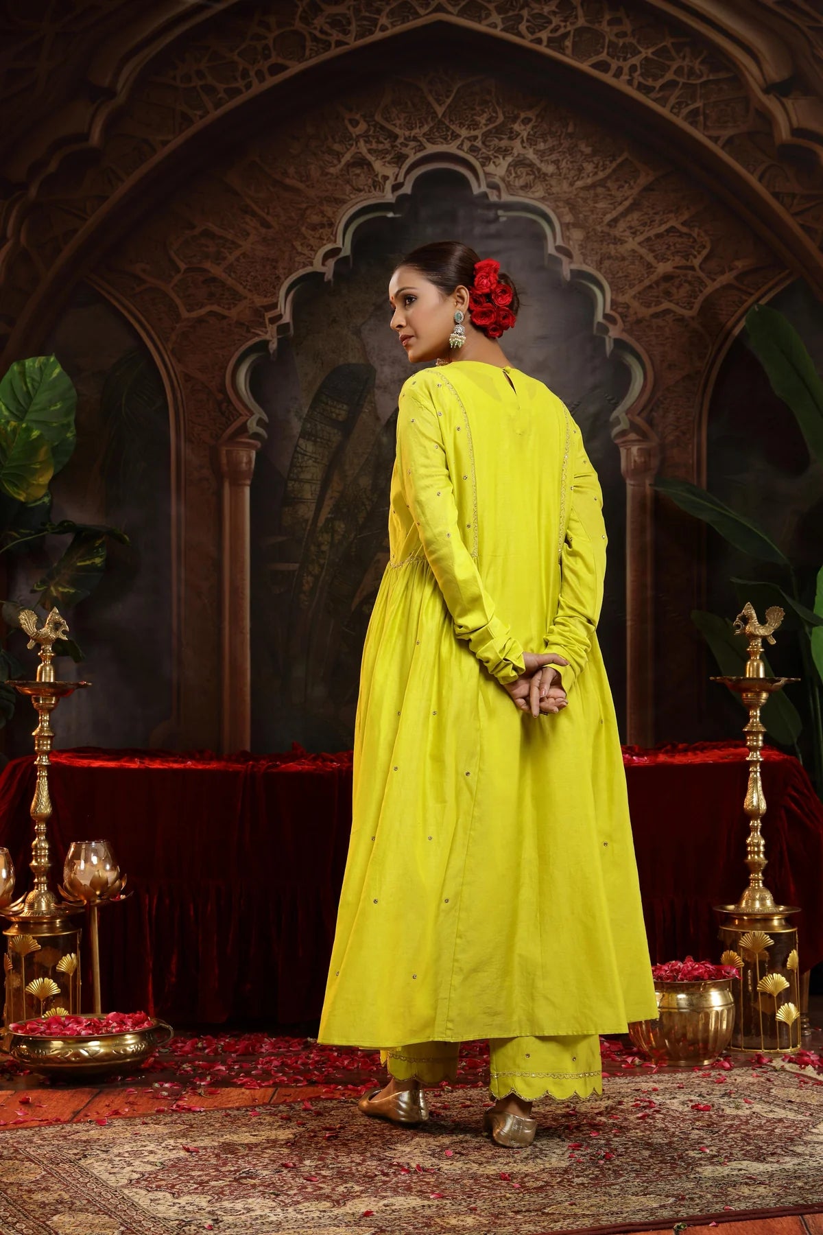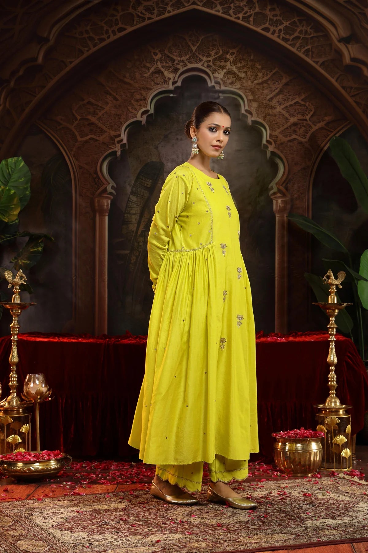 The chunnat at the waist gently cinches the silhouette, accentuating the curves while maintaining the flow of the A-line silhouette. The churidar sleeves in the suit is enhancing the overall elegance of the piece with their delicate detailing.