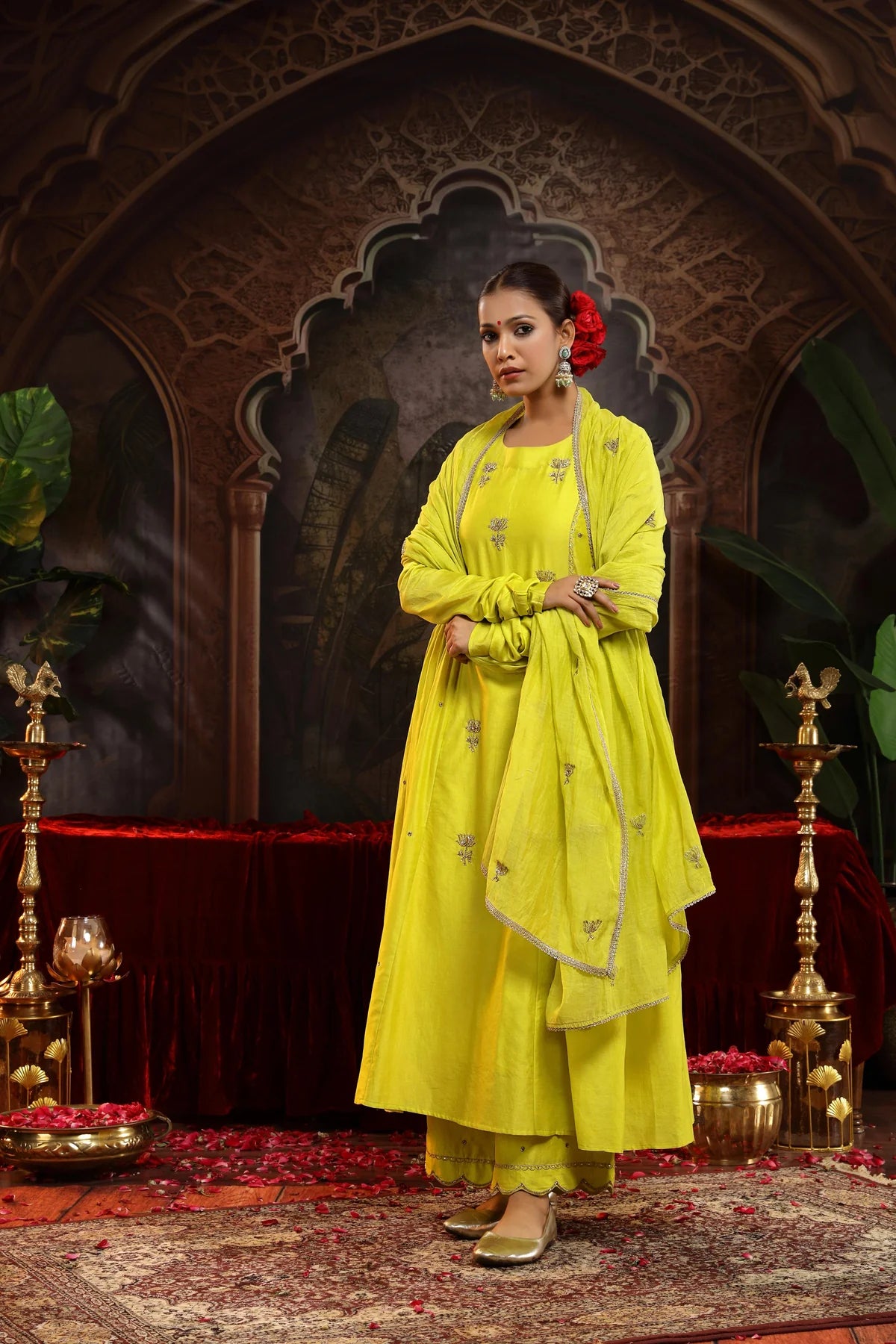 Paired with a scalloped palazzo, the ensemble exudes sophistication. The embroidery along the hem and the small booties on the palazzo add depth and texture, creating a seamless flow between the suit and pants. The outfit is completed with a matching dupatta, adding an extra layer of refinement and charm.