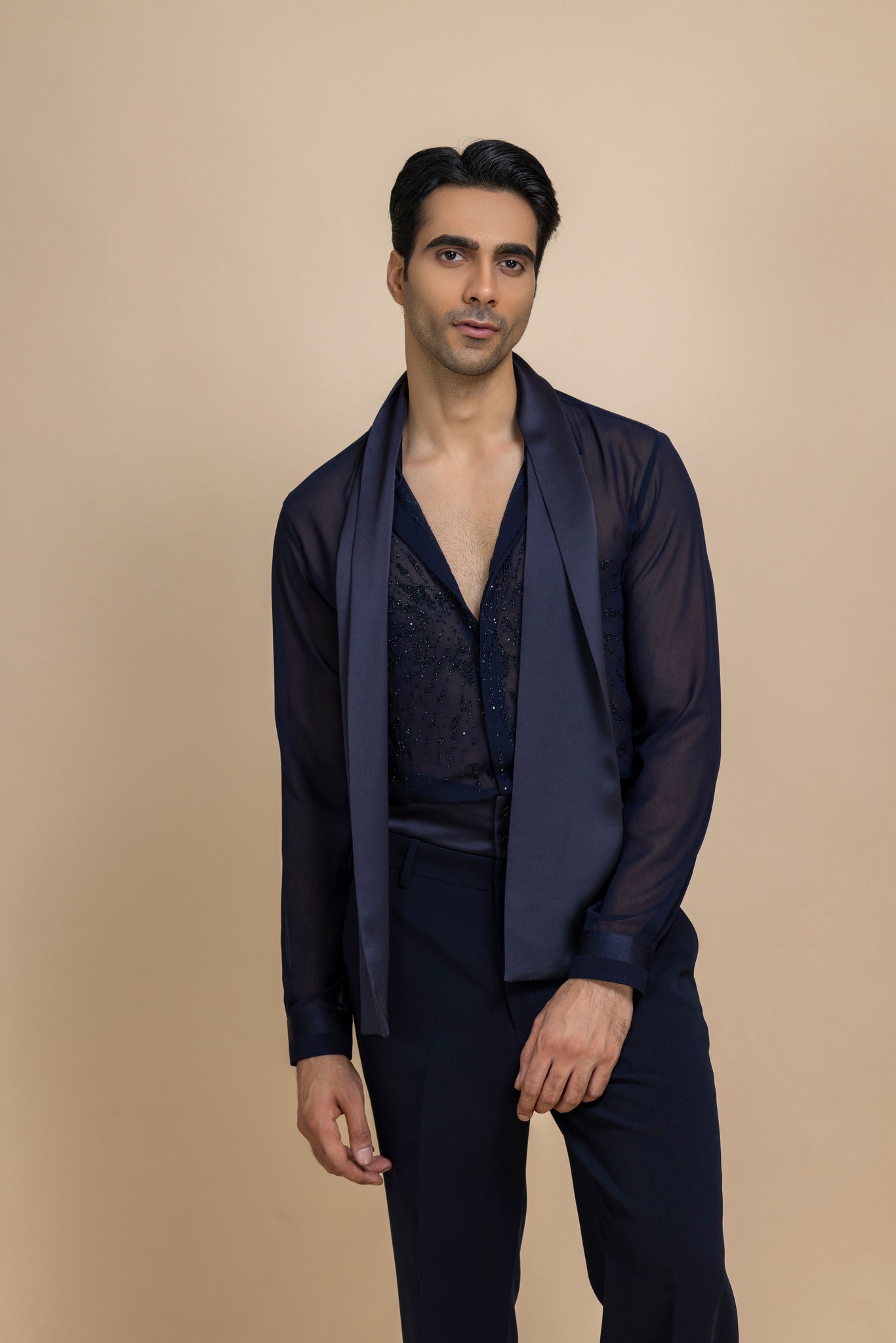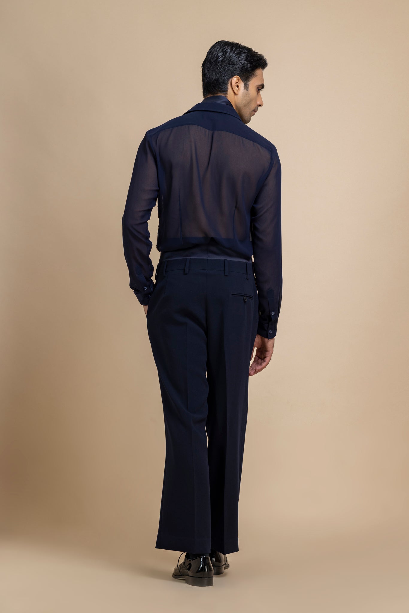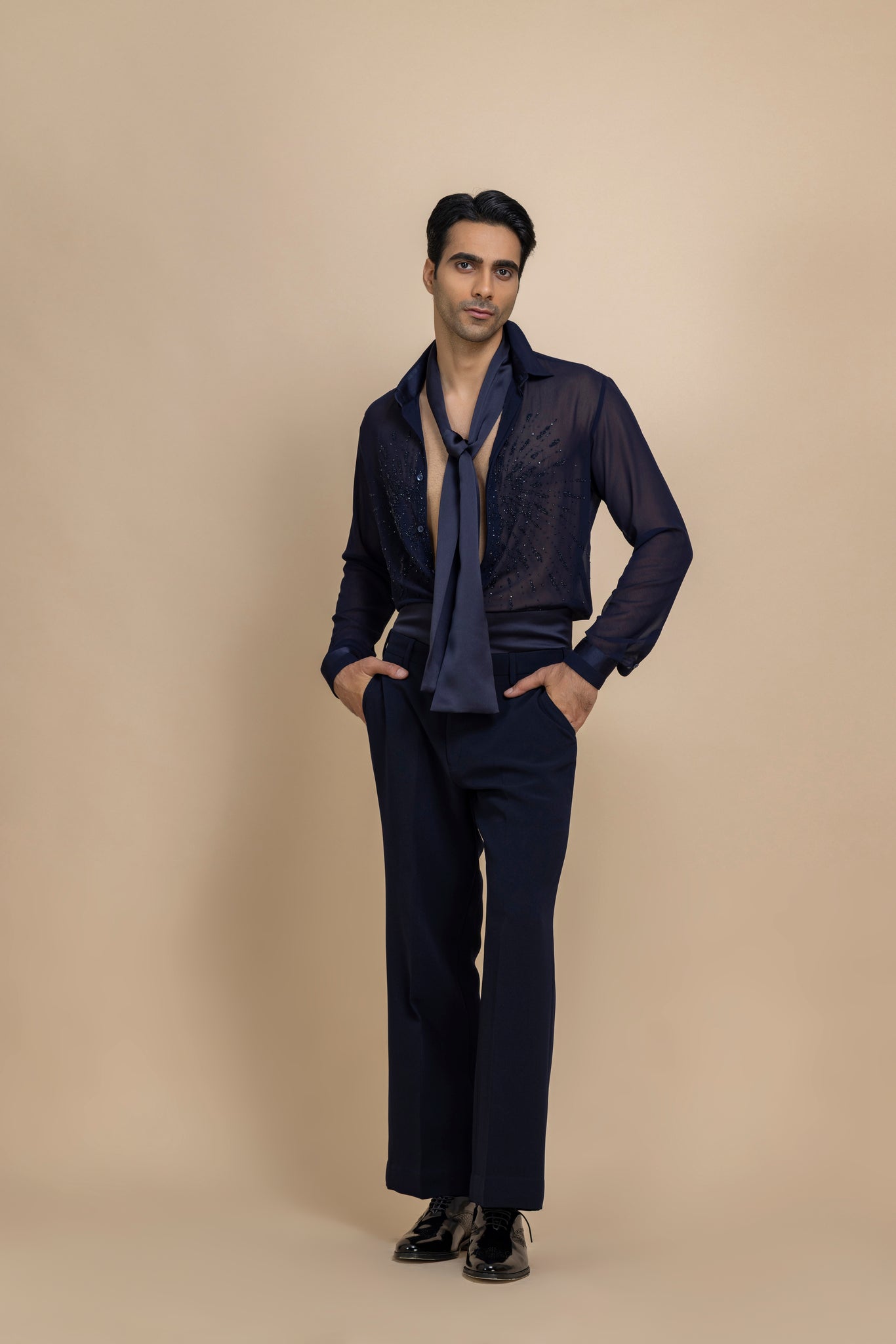 "This Indigo Blue Georgette Shirt Is Finely Hand-Embroidered With Detailing, Offering A Graceful Play Of Texture And Sheen. Paired With Tailored Japanese Crepe Trousers And Finished With A Luxurious Silk Satin Scarf, The Ensemble Exudes Effortless Sophistication — Perfect For Evening Gatherings, Festive Soirées, Or Elevated Day-To-Night Dressing."