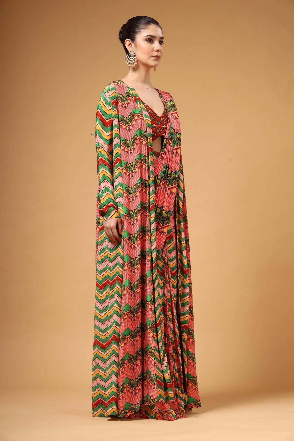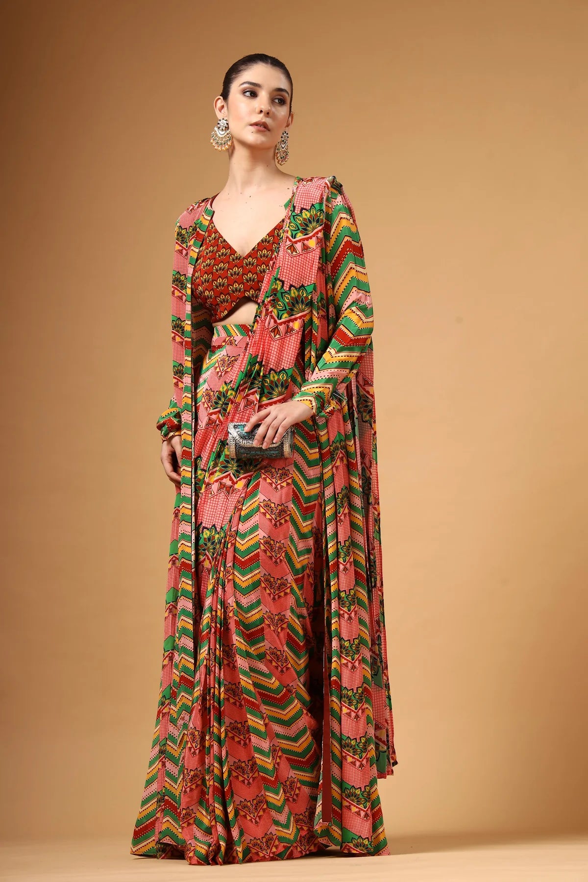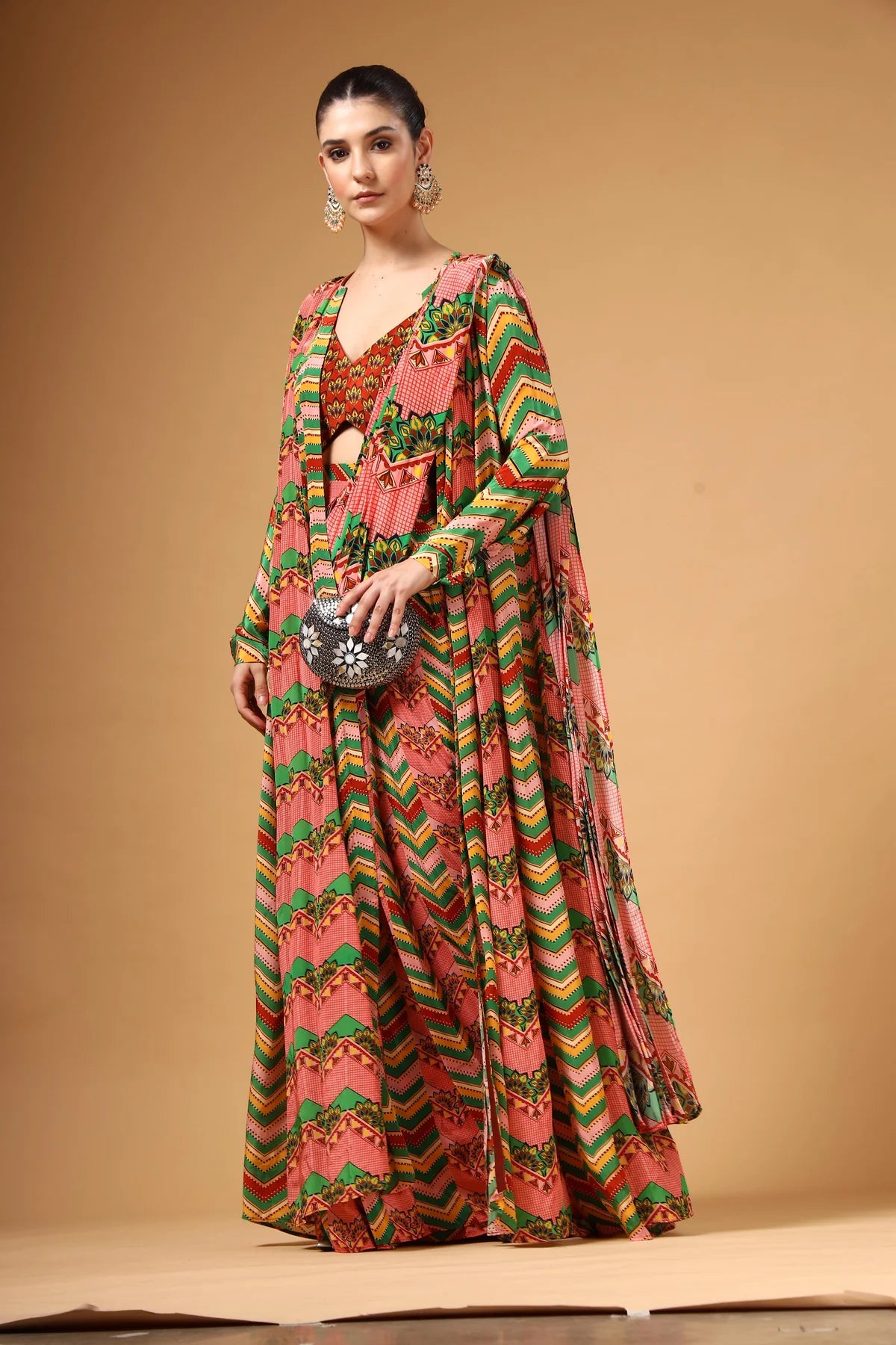 A vibrant multicolour long jacket paired with a sleek cut-sleeve blouse and a pre-draped saree — a perfect balance of modern style and trendy appeal. Lightweight and effortlessly comfortable, this versatile ensemble can be styled in multiple ways, making it an ideal choice for destination events and celebrations.
