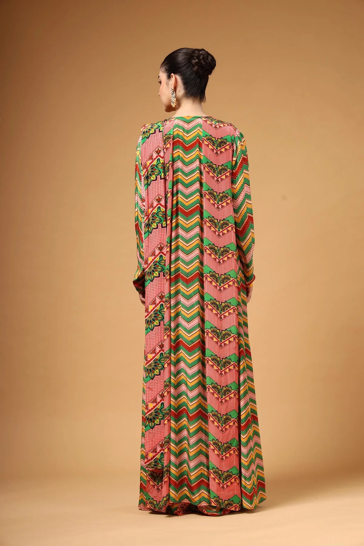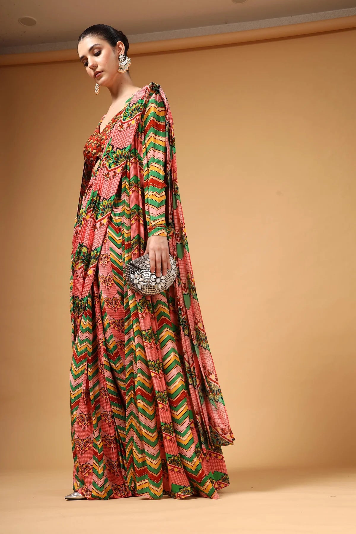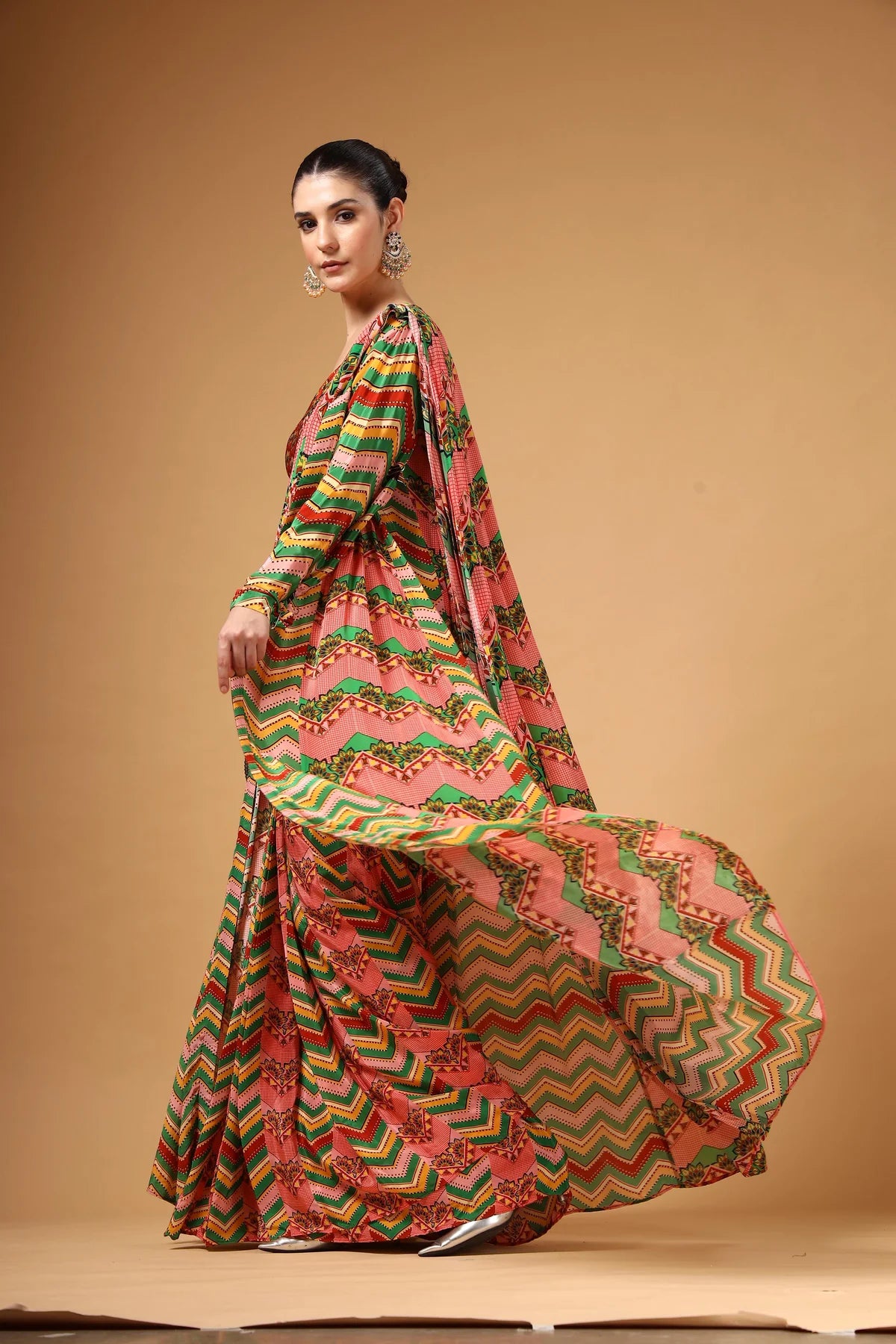 A vibrant multicolour long jacket paired with a sleek cut-sleeve blouse and a pre-draped saree — a perfect balance of modern style and trendy appeal. Lightweight and effortlessly comfortable, this versatile ensemble can be styled in multiple ways, making it an ideal choice for destination events and celebrations.
