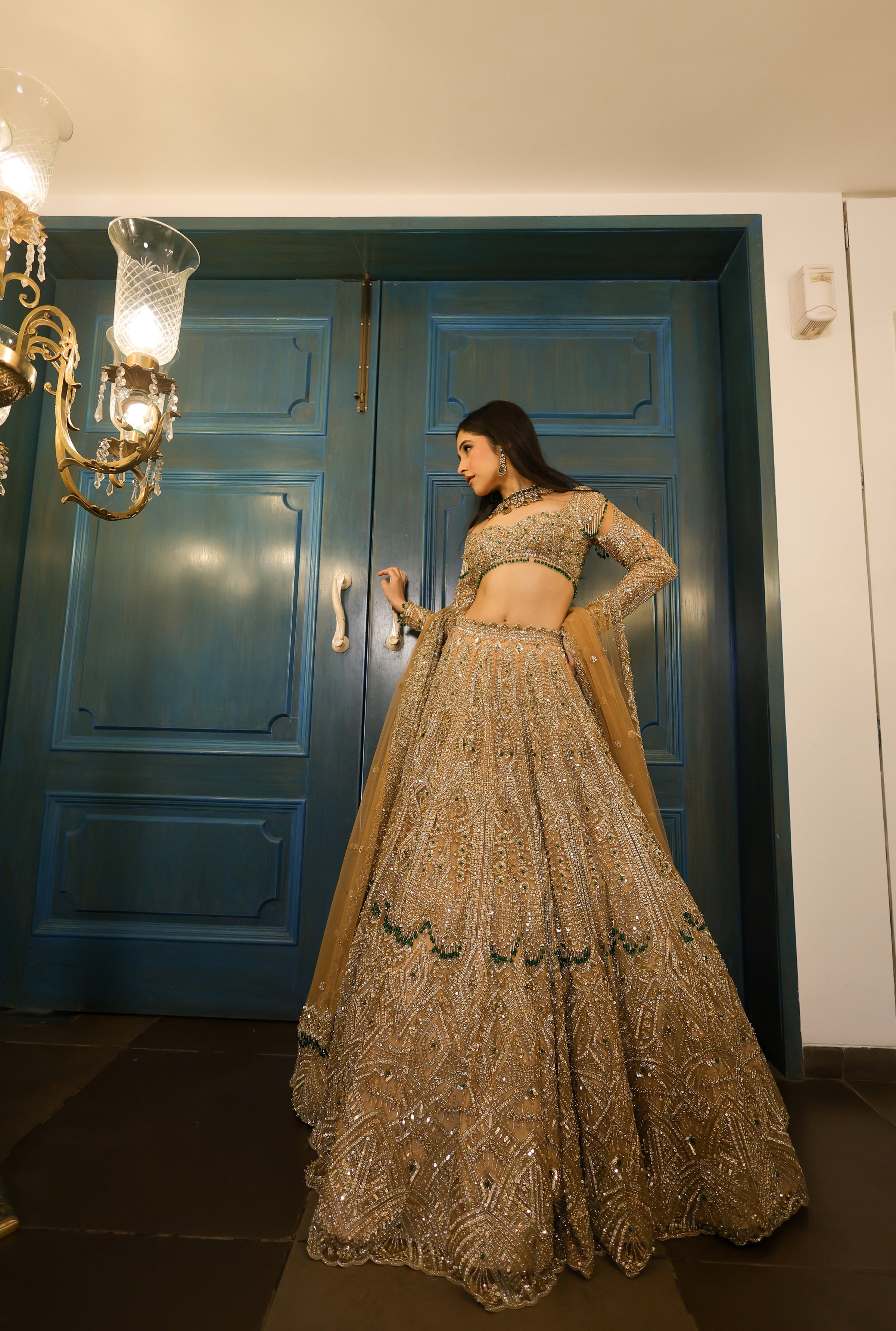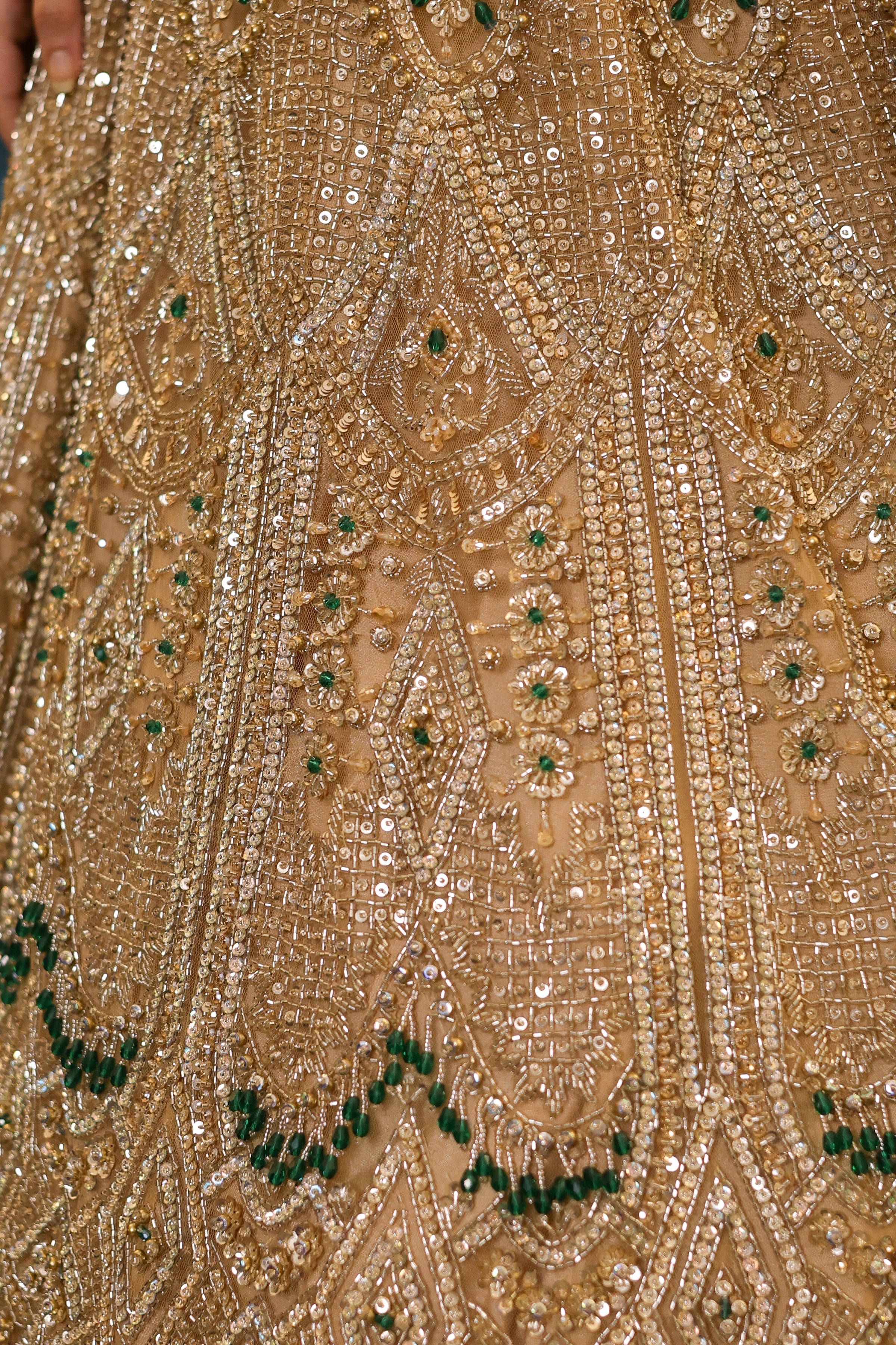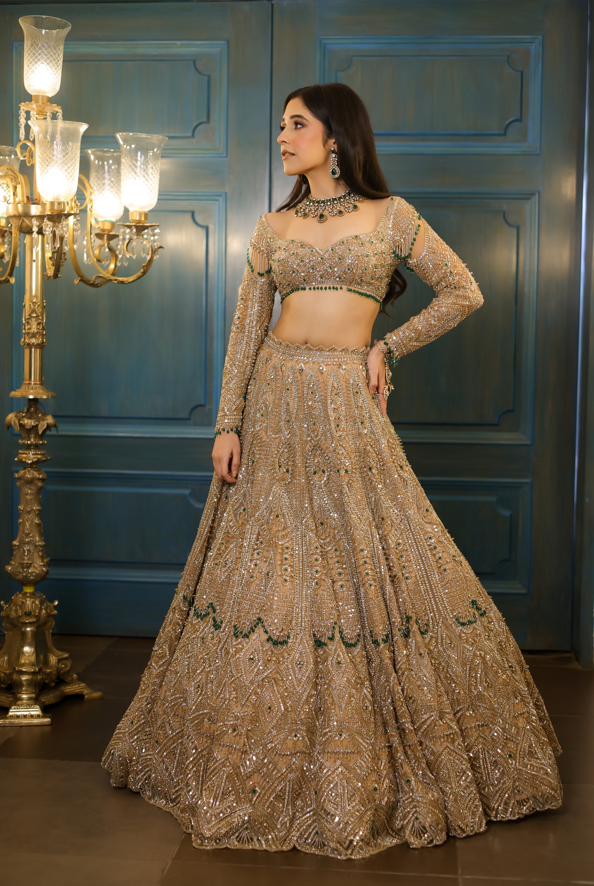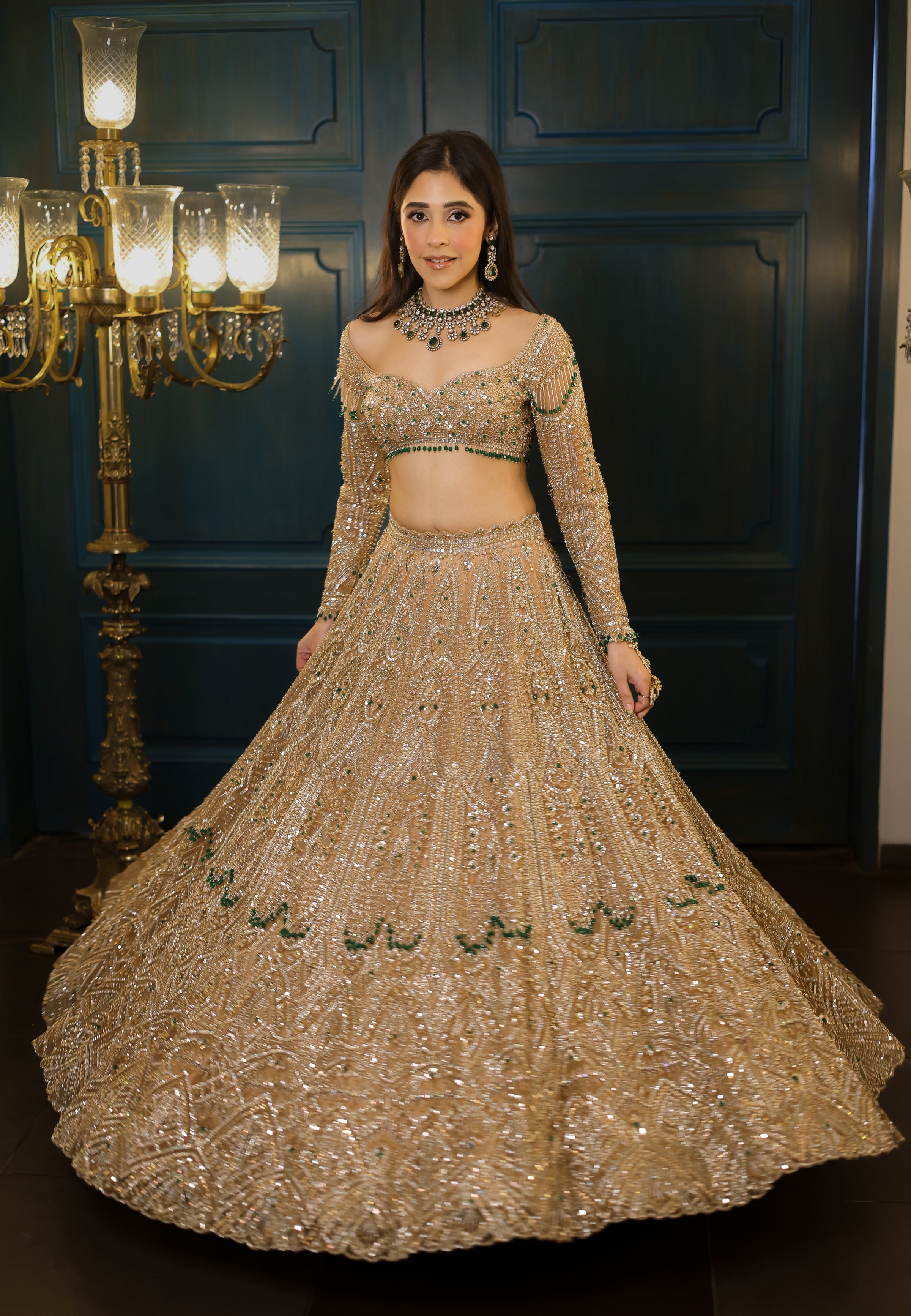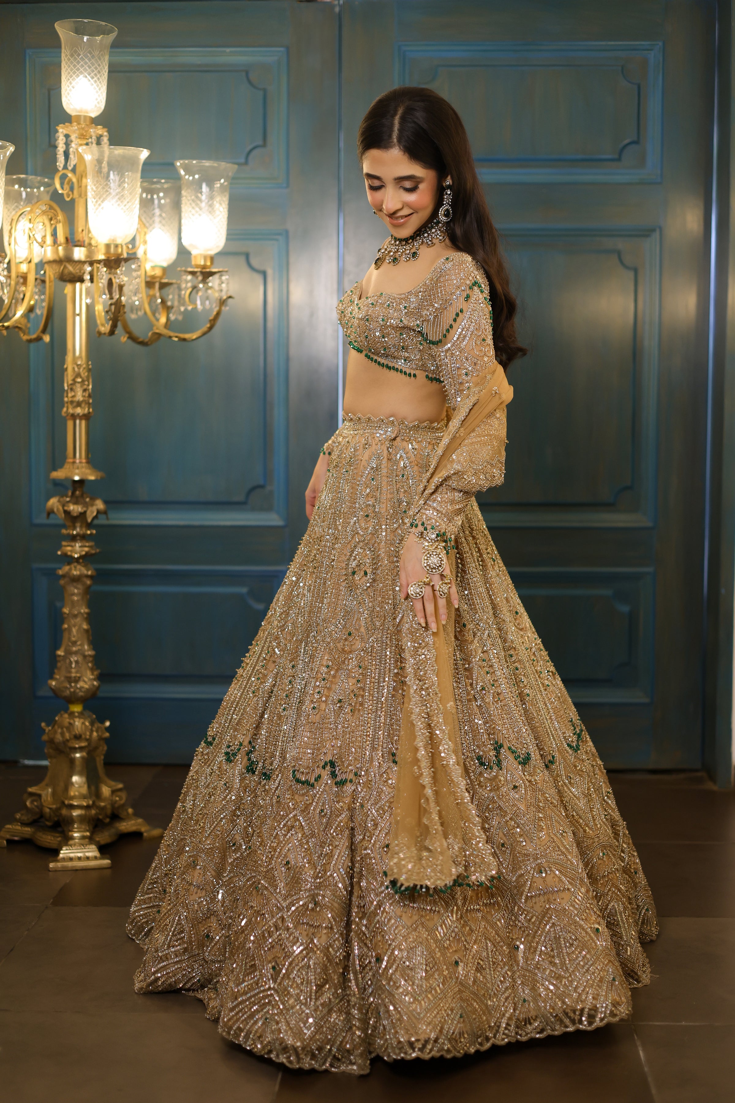 Striking gold lehenga featuring all over geometric and floral embroidery in gold with emerald accents. Paired with a matching gold full sleeves blouse with dangling crystals and a matching embellished dupatta