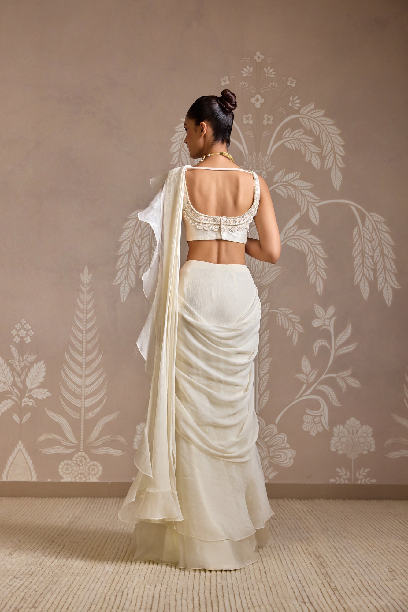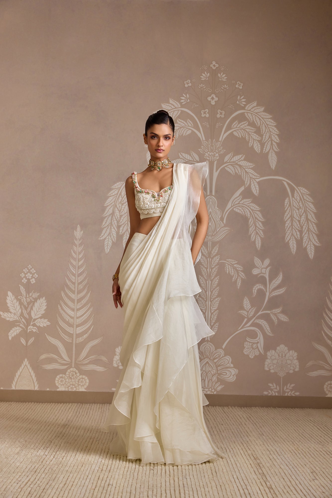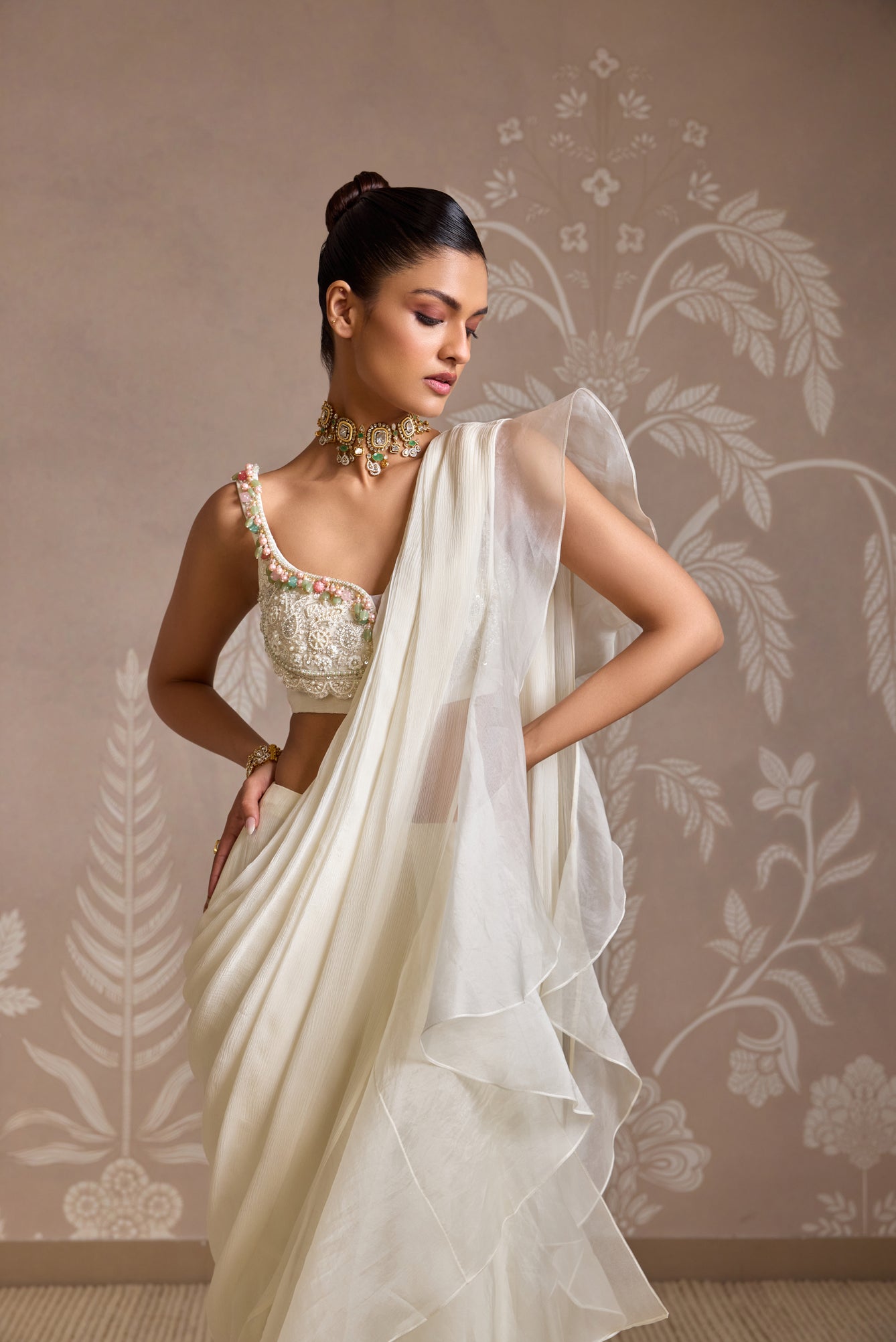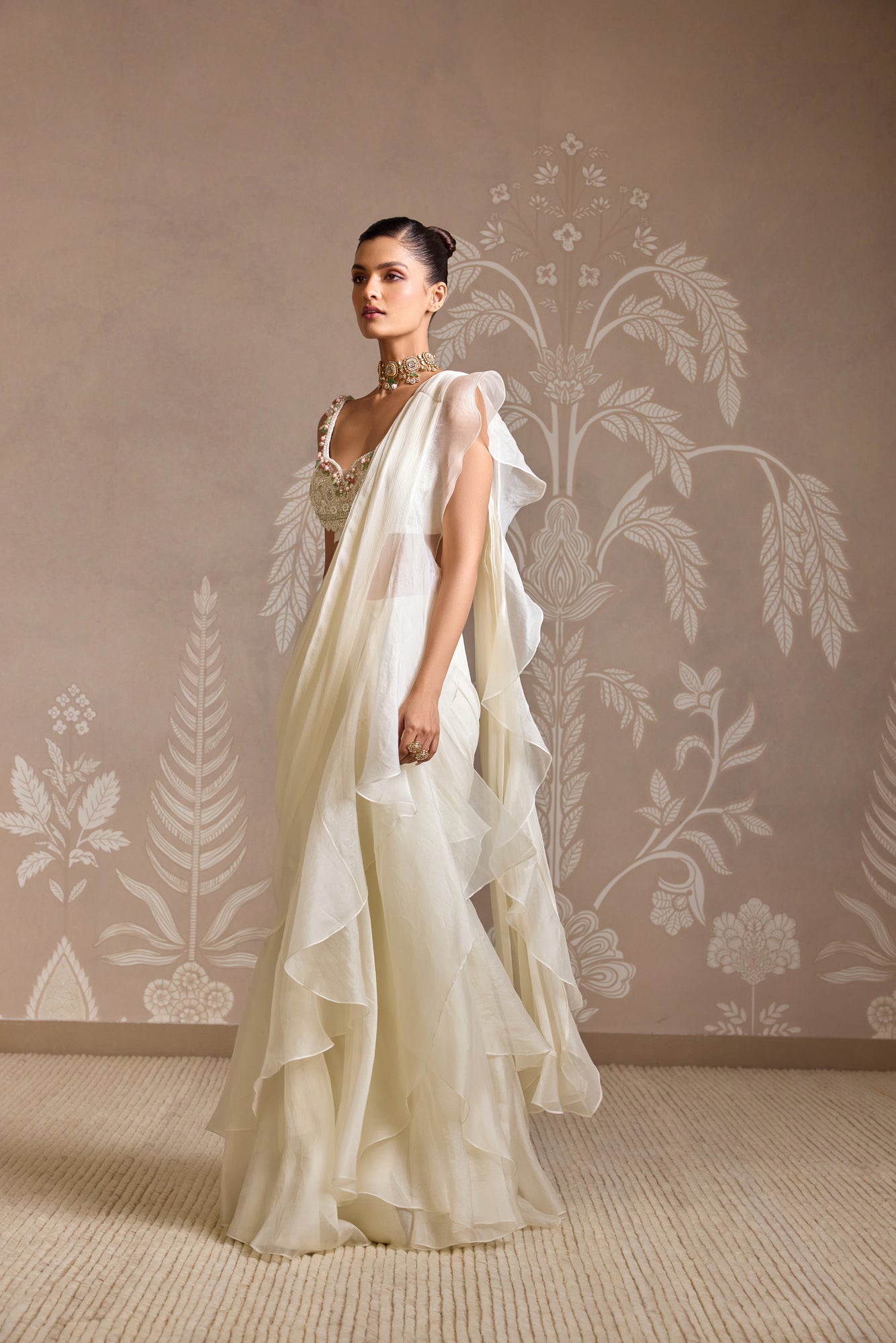 Placement Embroidered Sleeveless Raw Silk Blouse and Chiffon Drape Saree with Organza Ruffle