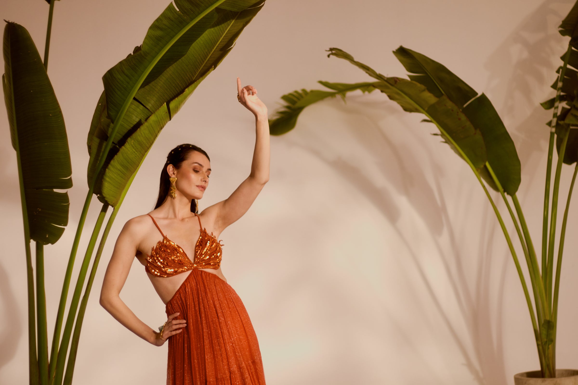 Aloha 3-Tiered Gown - Leaf Applique Embroidered 3-Tiered Back Knot Gown