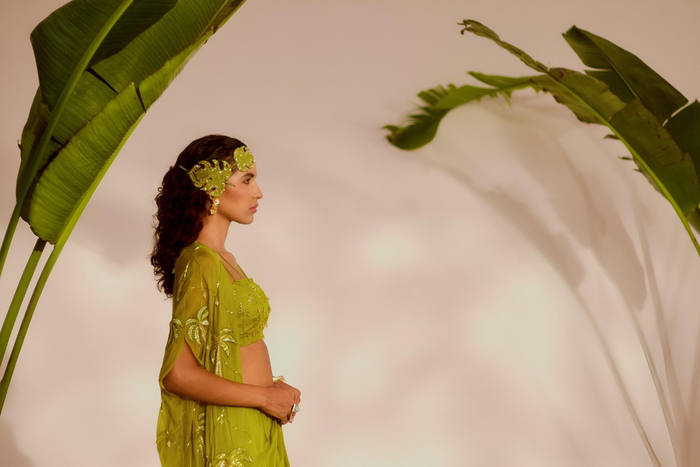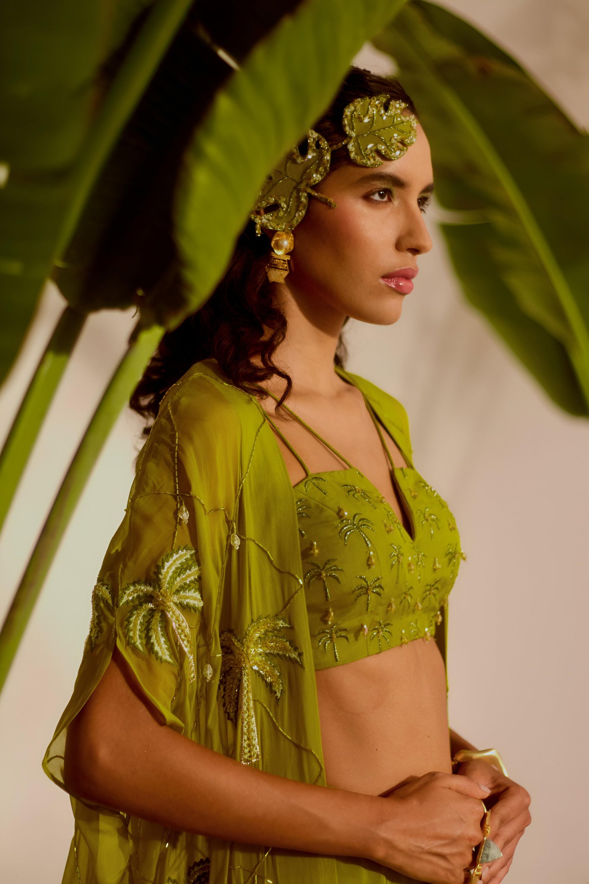 Areca Cape And Drape Skirt Set - Palm Tree Embroidered Asymmetrical Cape With Drape Skirt And Embroidered Bustier