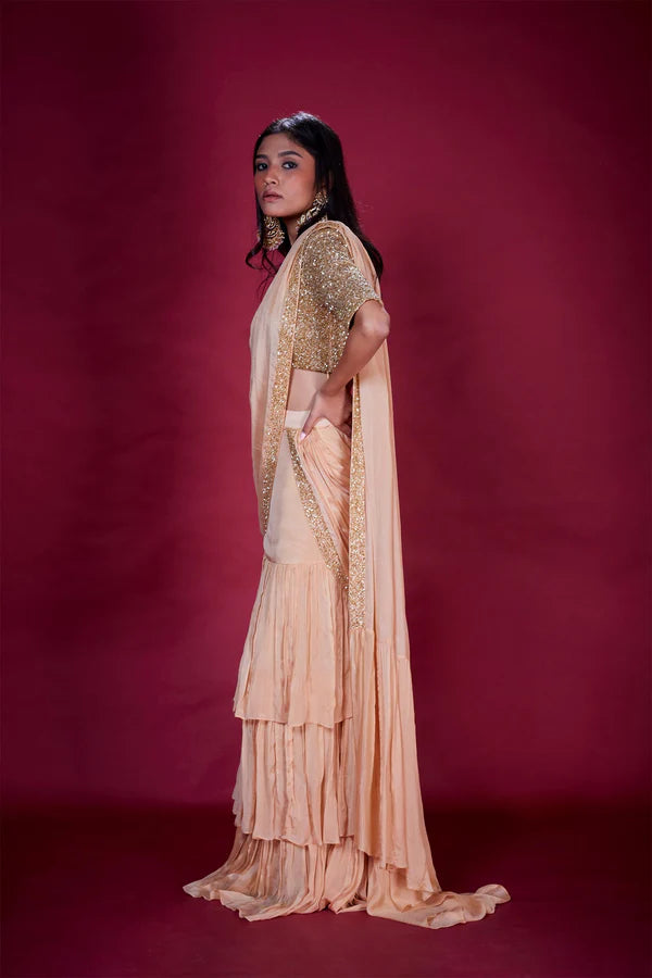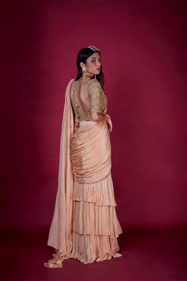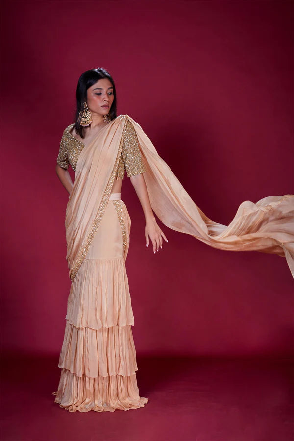 Amp up your ethnic wardrobe with a 3 layered pre draped saree which offers glitz, fluidity and drama. The saree has been paired with a V-neck hand embellished blouse. Kundan choker & gold clutch would be a cherry on top to complete the look.