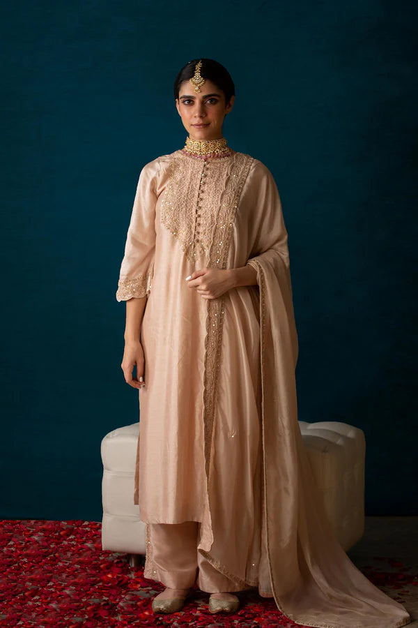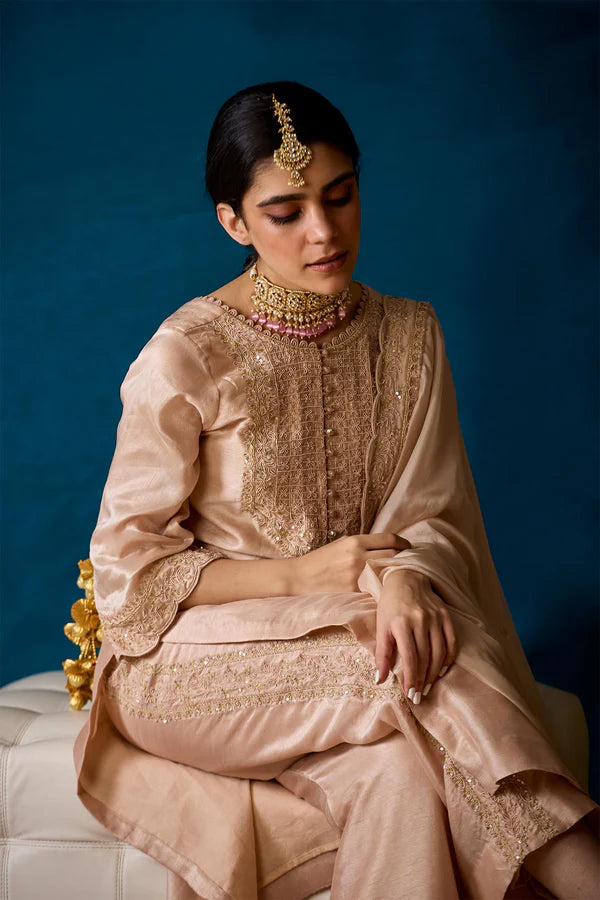 A subtle nude silk kurta with high slits- hand embroidered using detailed zardozi, dori & sequins work. The side seams of the palazzos are surely here to add glamour to the simplicity. Pin the dupatta on the side & pair it up with bright colour juttis to add colour!