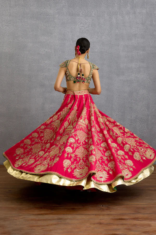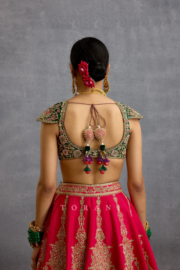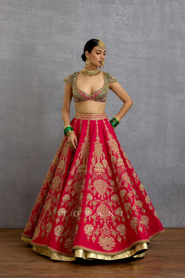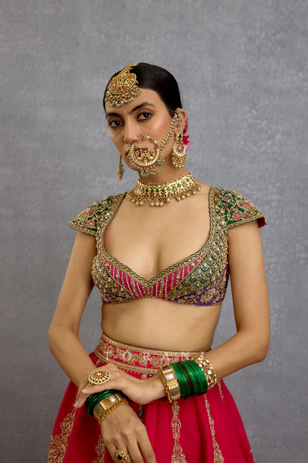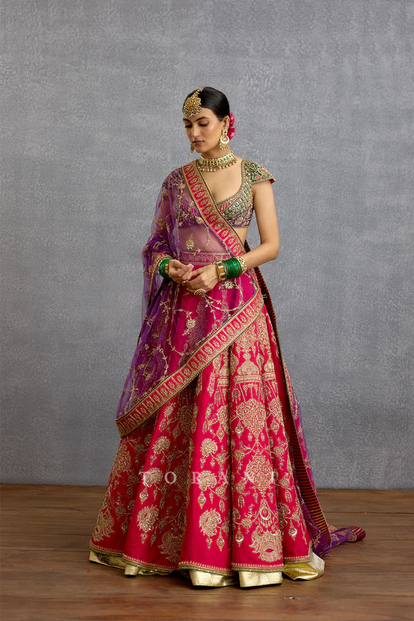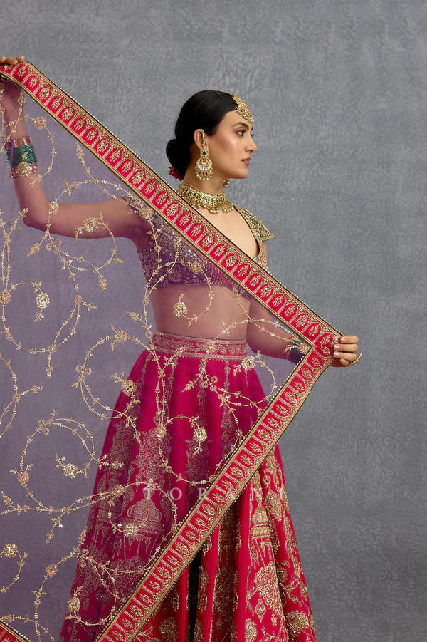 The Gul-Rang Malika Lehenga Set offers a burst of colours to your momentous occcasions. Featuring intricate Indian artistry embroidered upon gorgeous jewel tones, the set is crafted with jeni silk, organza and net fabrics. The ensemble includes a lehenga, blouse, shoulder odhni and veil odhni.