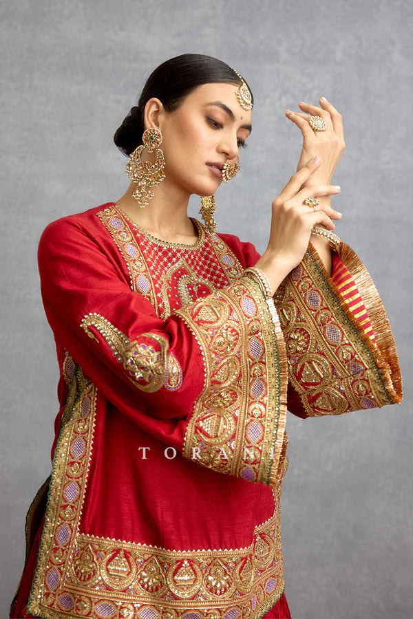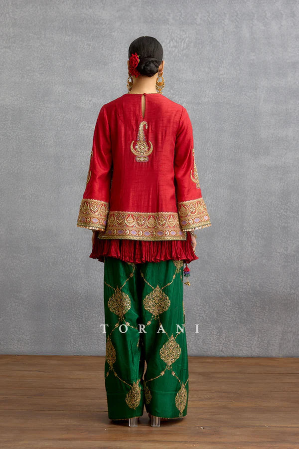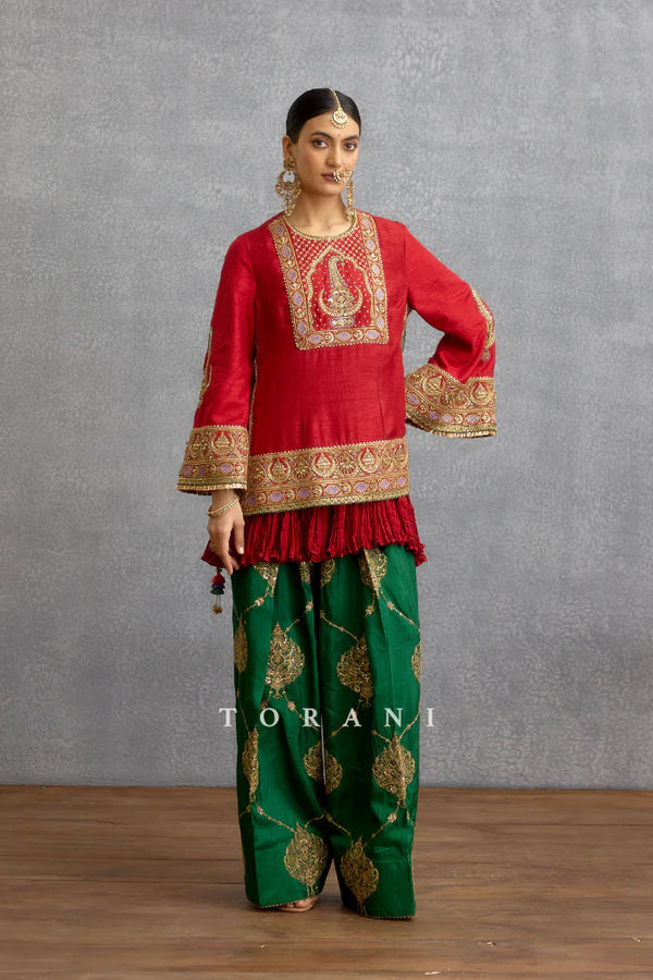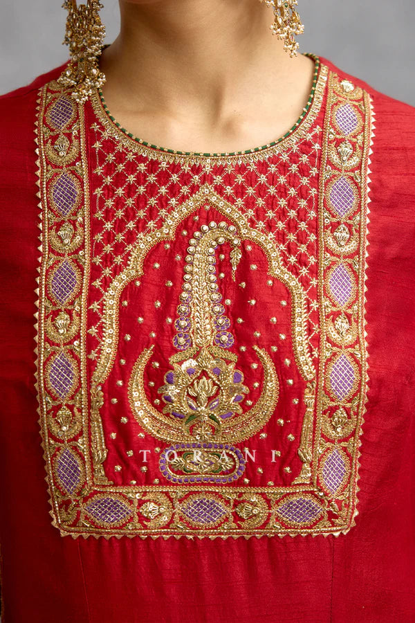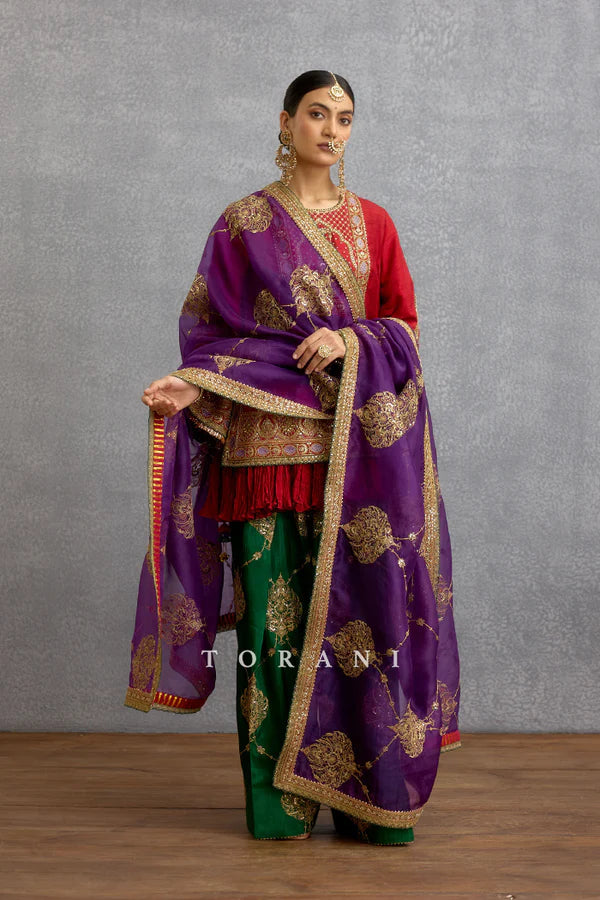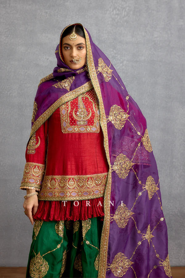 The Mehrang Rukhsar Kurta Set boasts a timeless combination of red, green and purple- classic jewel tones that echo the legacy of Mughal art and artisans. The set features a short kurta, pants and an odhni, all embroidered with bespoke motifs in gold. The little detail of this ensemble makes it a festive must-have for your wardrobe.