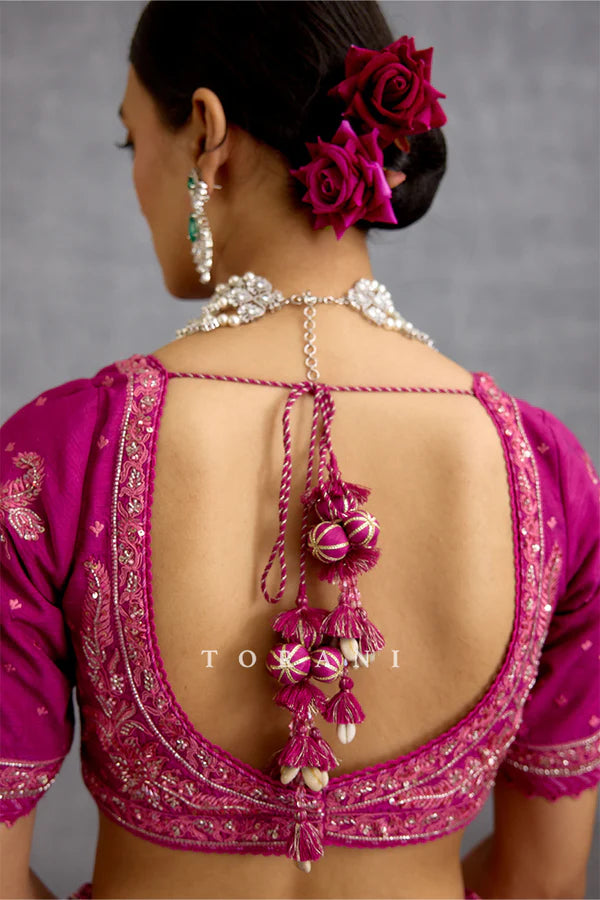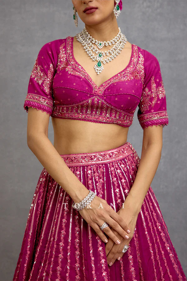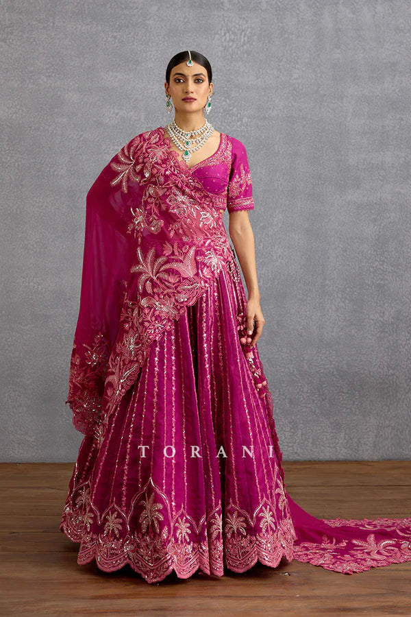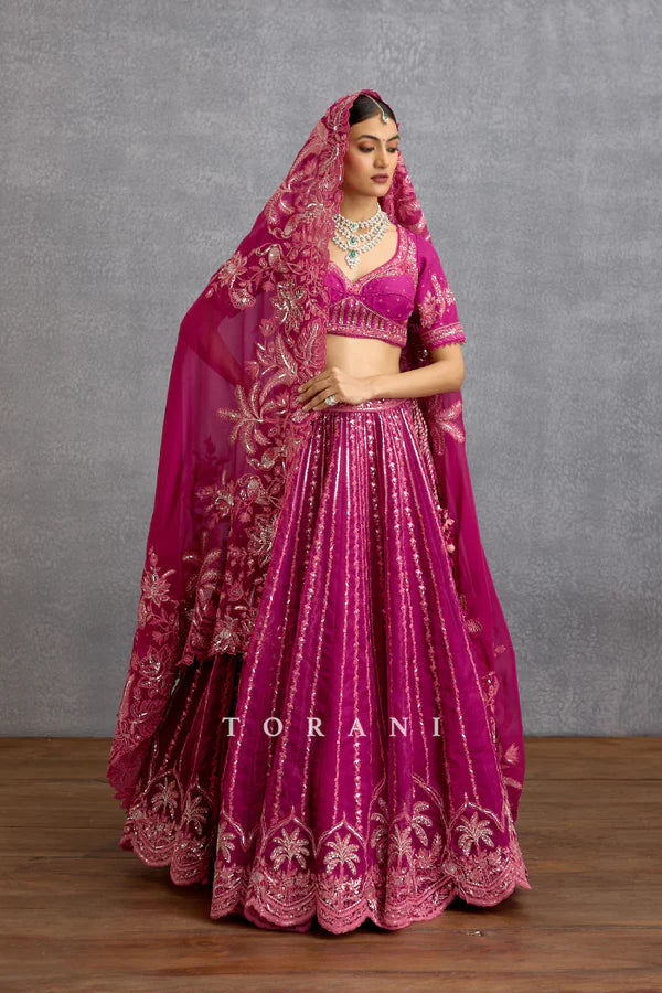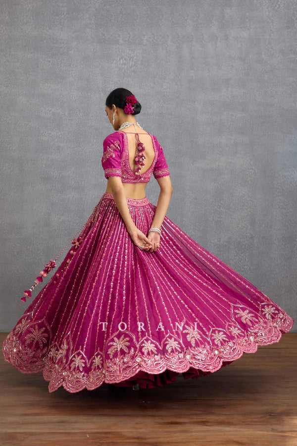 The one-of-a-kind Padmaraga Wrija Lehenga Set is crafted with a combination of jeni silk and organza fabric in a bright and gorgeous magenta shade. It features intricately hand and dori embroidery, decorating the set with delicate tropical prints
