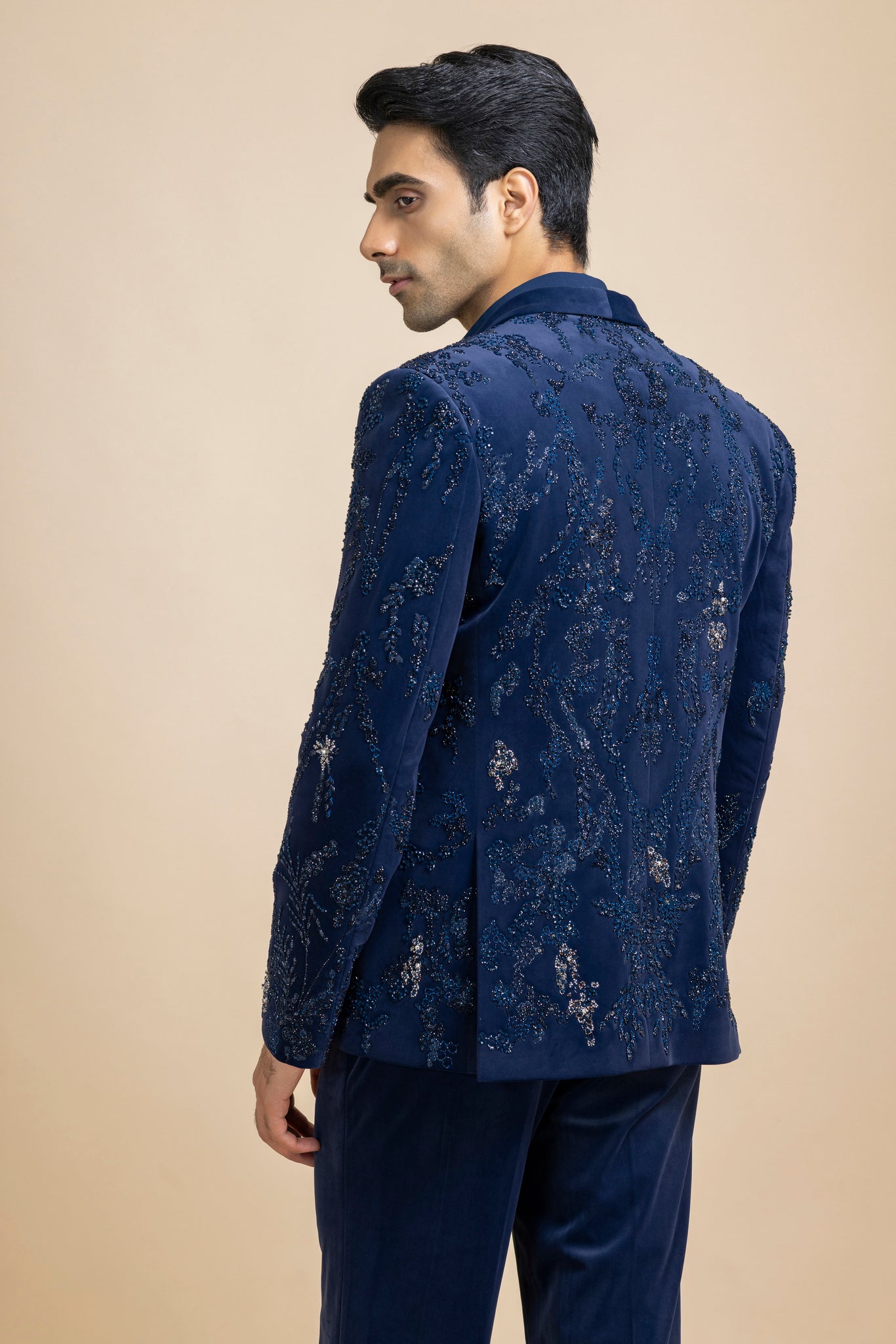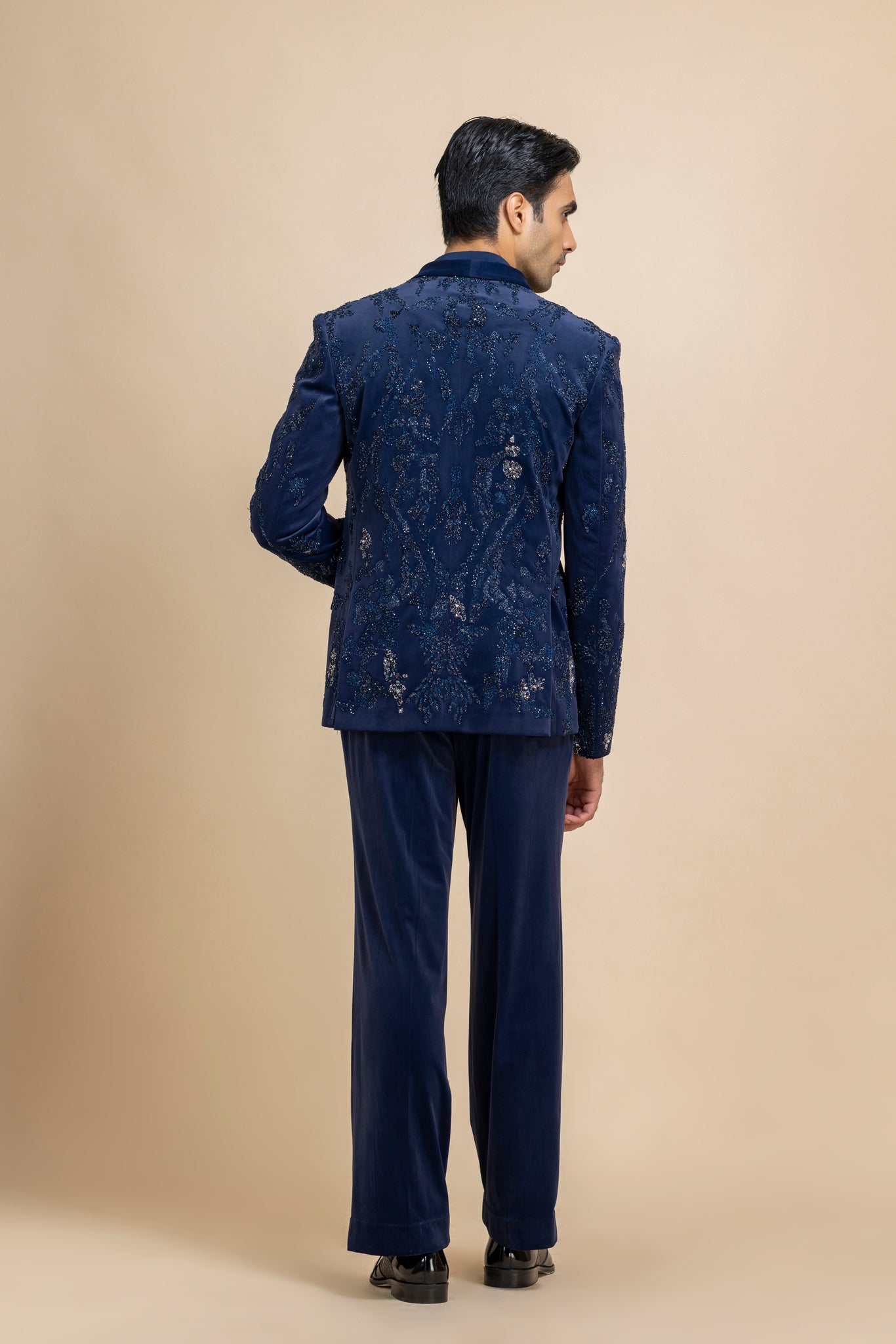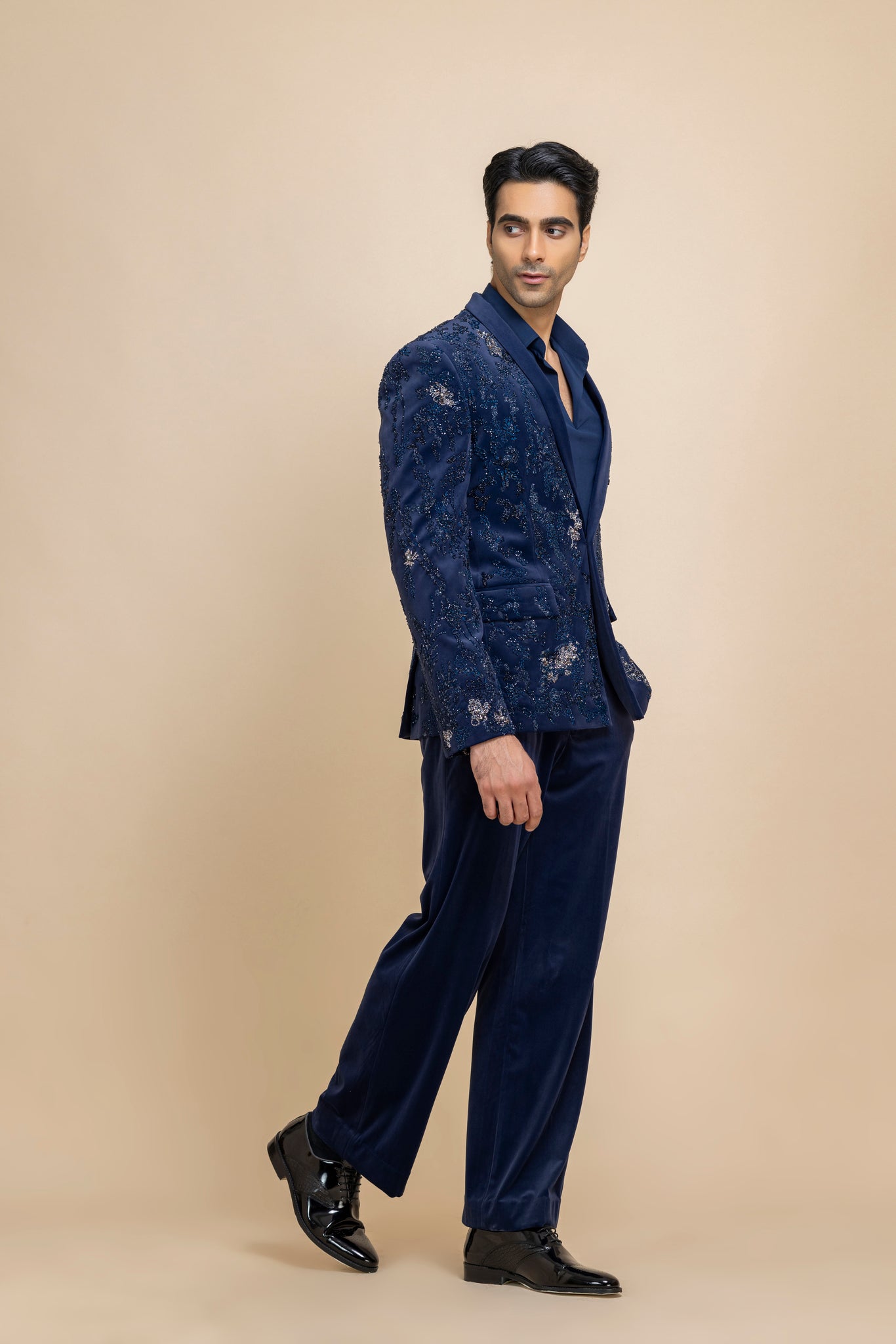 "This Cobalt Blue Velvet Blazer And Pant Set Is Intricately Highlighted With Fine Hand Embroidery, Exuding A Regal Charm And Elevated Craftsmanship. Paired With A Lycra Crepe V-Neck Shirt, This Ensemble Strikes The Perfect Balance Between Contemporary Tailoring And Timeless Couture — Ideal For Evening Soirées, Festive Gatherings, Or Statement Occasions."