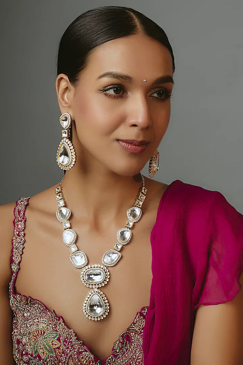 Gold Finish Kundan Polki & Zircon Long Necklace Set