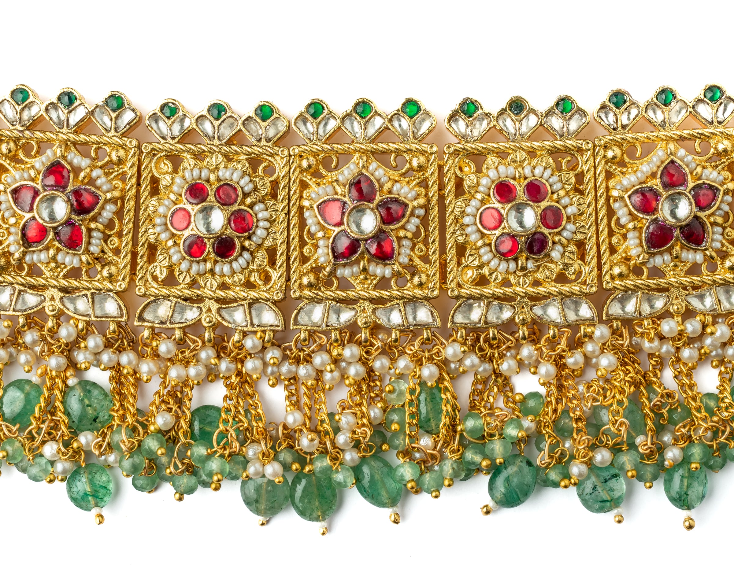 Elegant handcrafted gold-tone choker set with intricate Kundan work, red & green stone embellishments, and pearl drops. Paired with matching earrings for a regal ethnic charm.