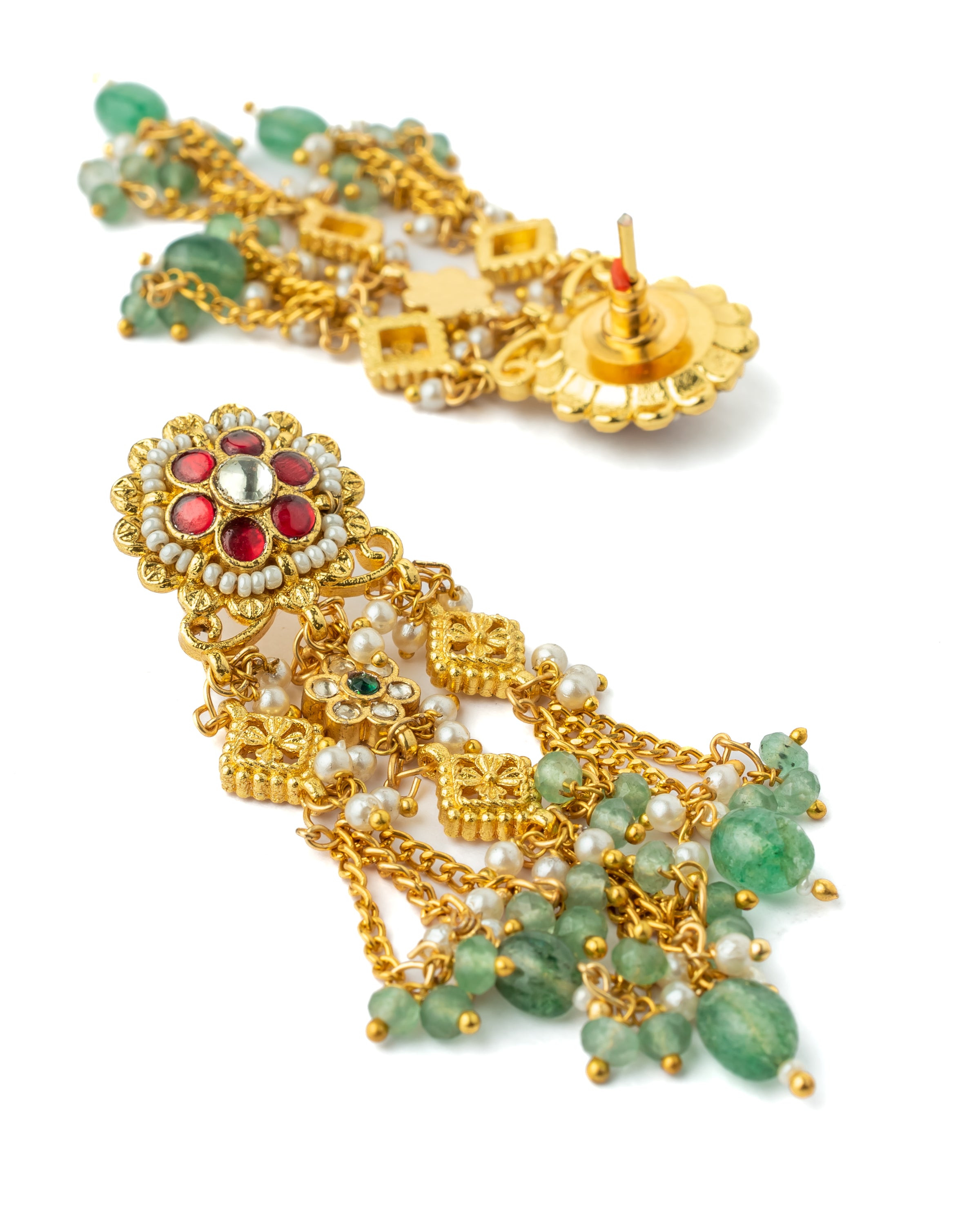 Gold Plated Green Womens Kundan, Polki Necklace Set with Pair of Earrings