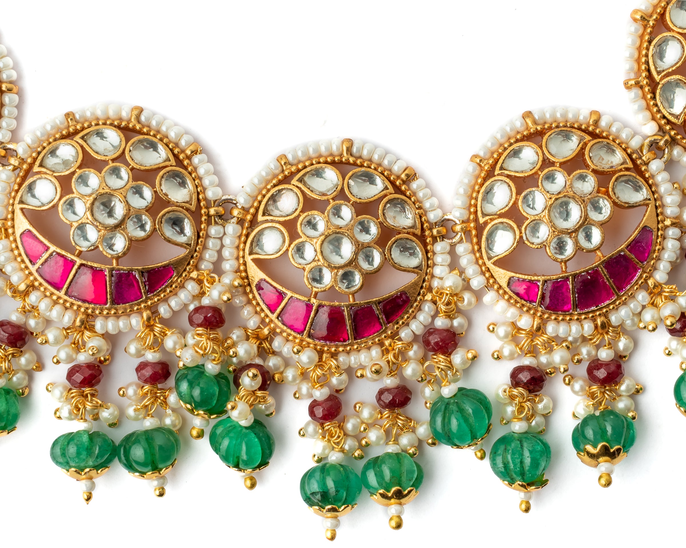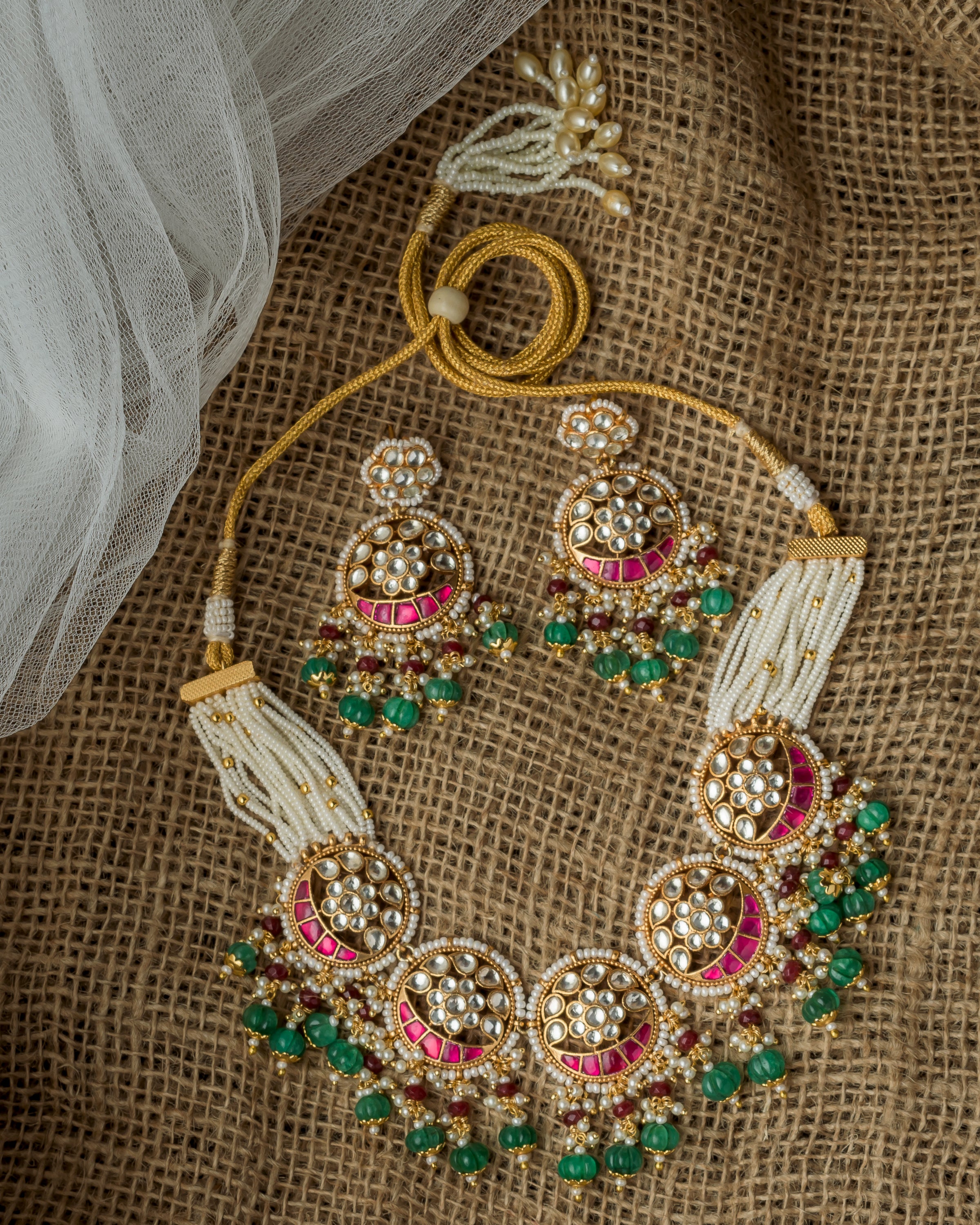 Stunning Kundan necklace set with pearl strands, sparkling white stones, and vibrant green and pink gemstones. Handcrafted for a regal touch, perfect for weddings and festive occasions.