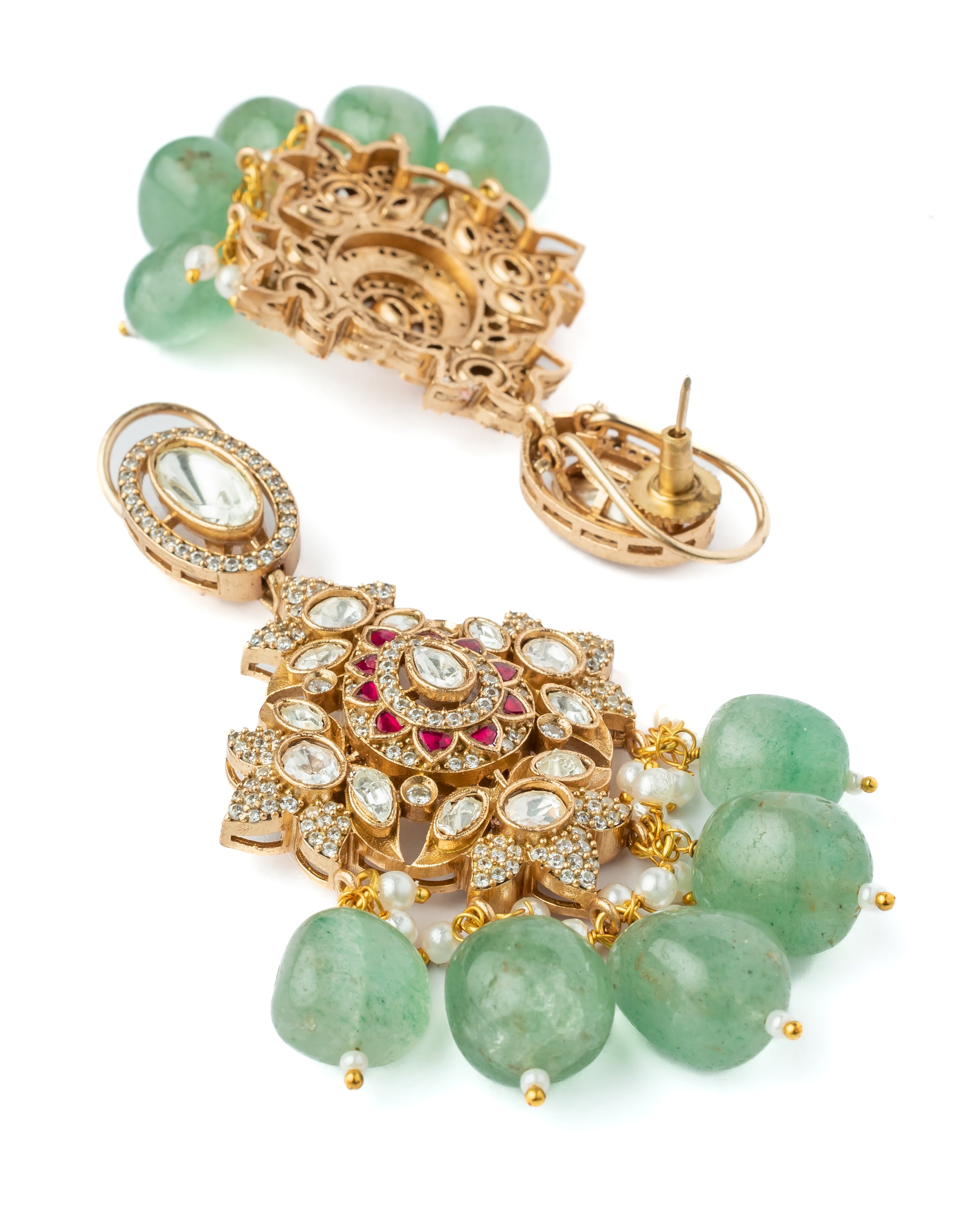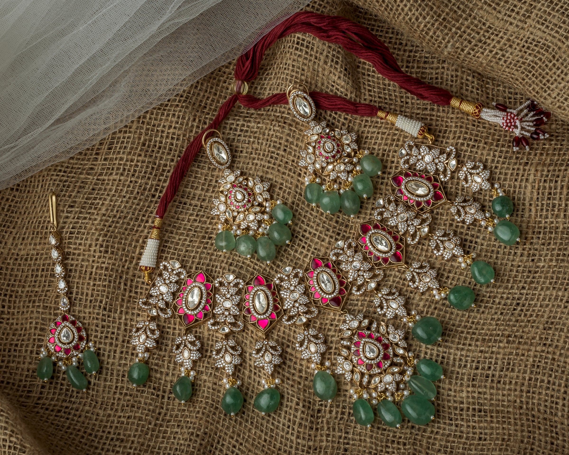 Elegant Kundan bridal set featuring a stunning necklace, matching earrings, and a maang tikka. Embellished with pearls, white stones, and green drops, perfect for weddings and grand occasions.