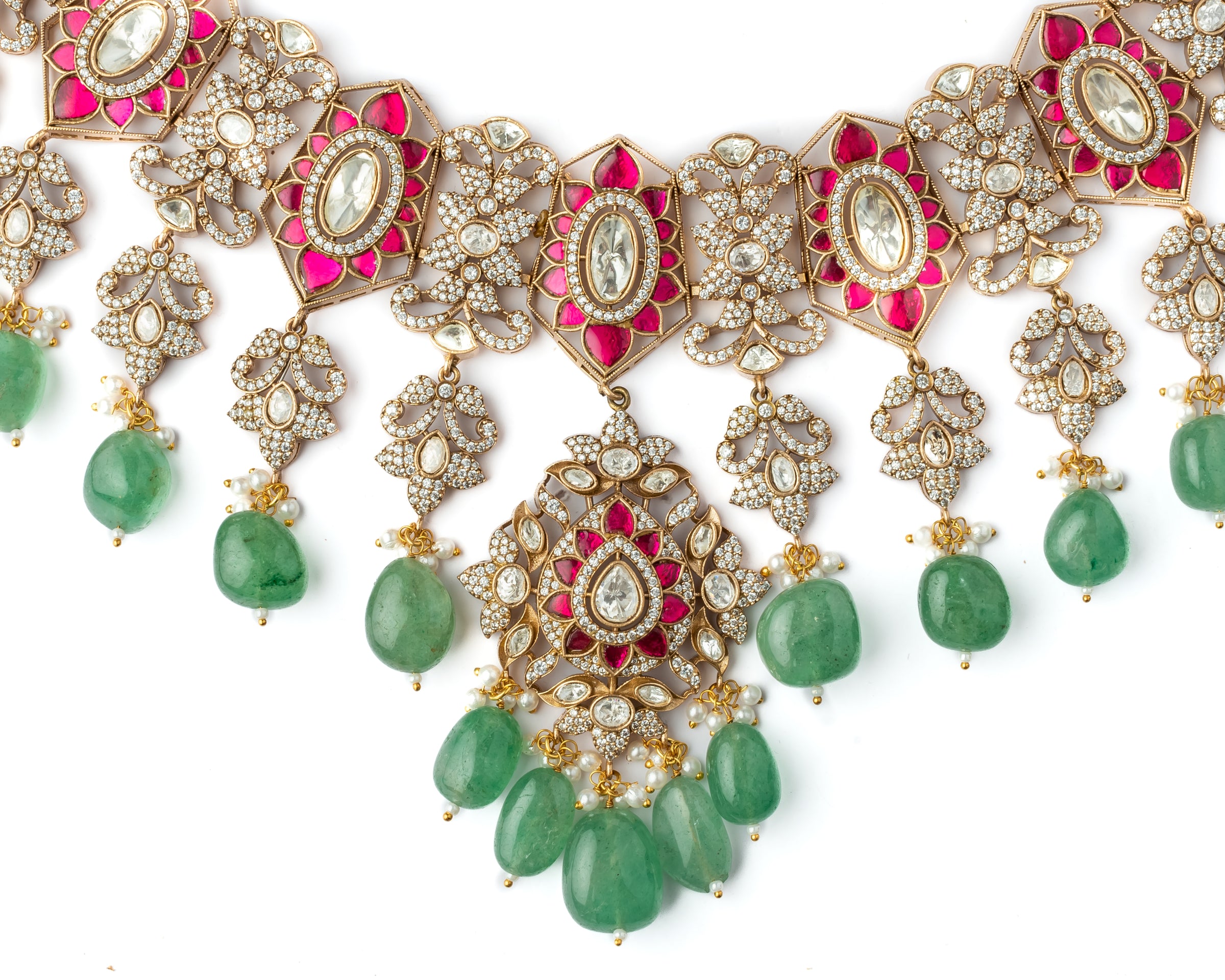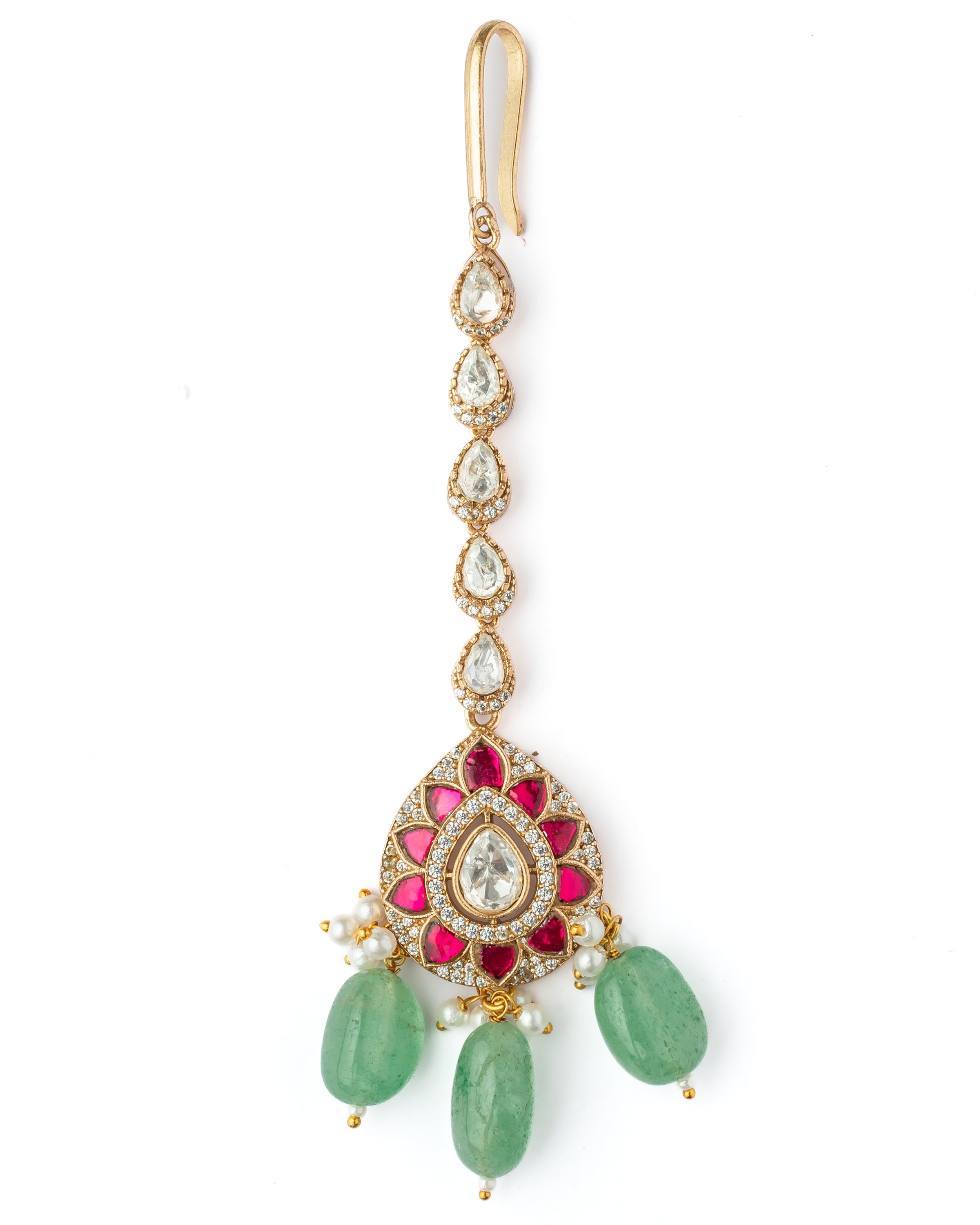 Gold Plated Multicolored Womens Kundan, Polki Necklace Set with Pair of Earrings & Maangtikka