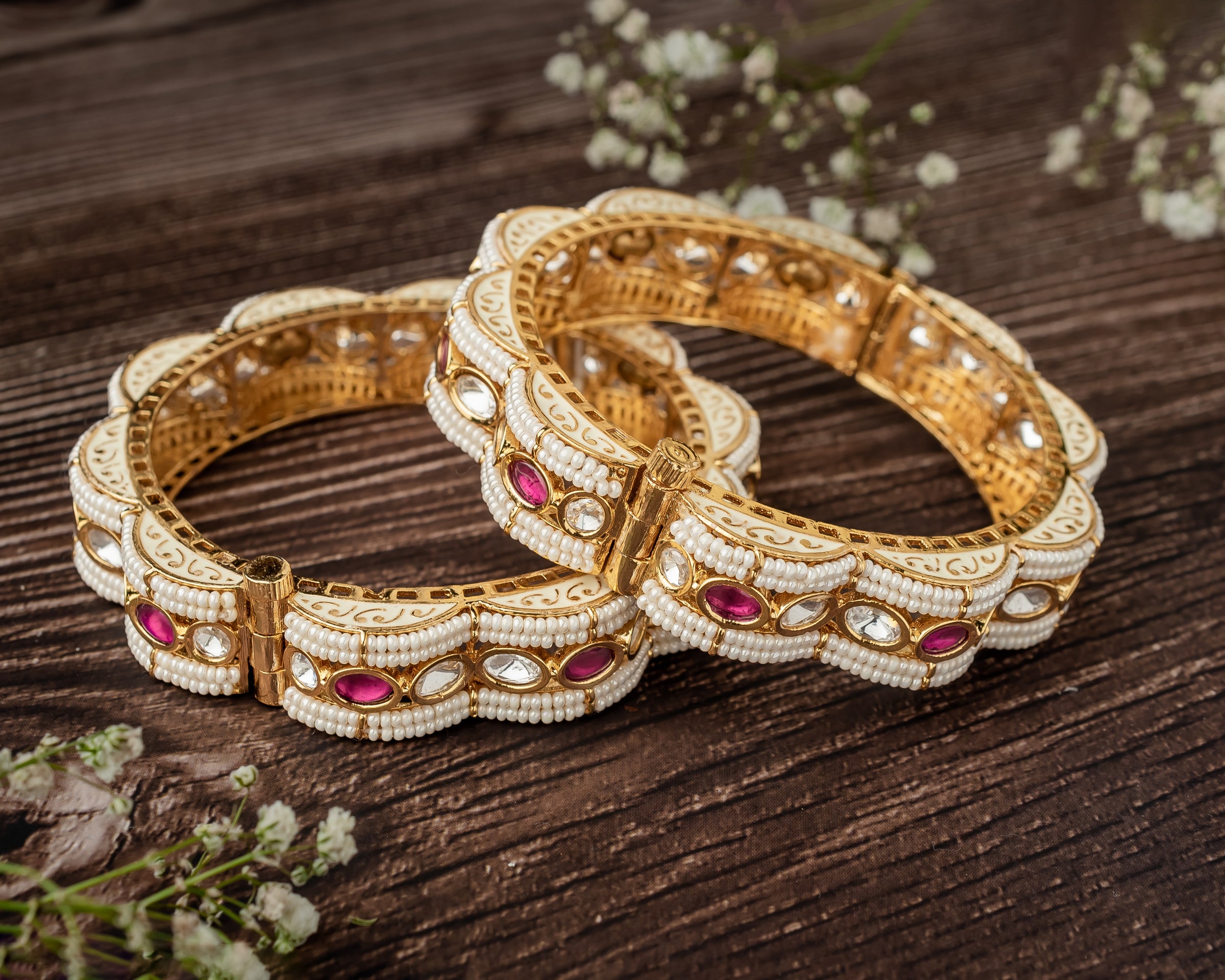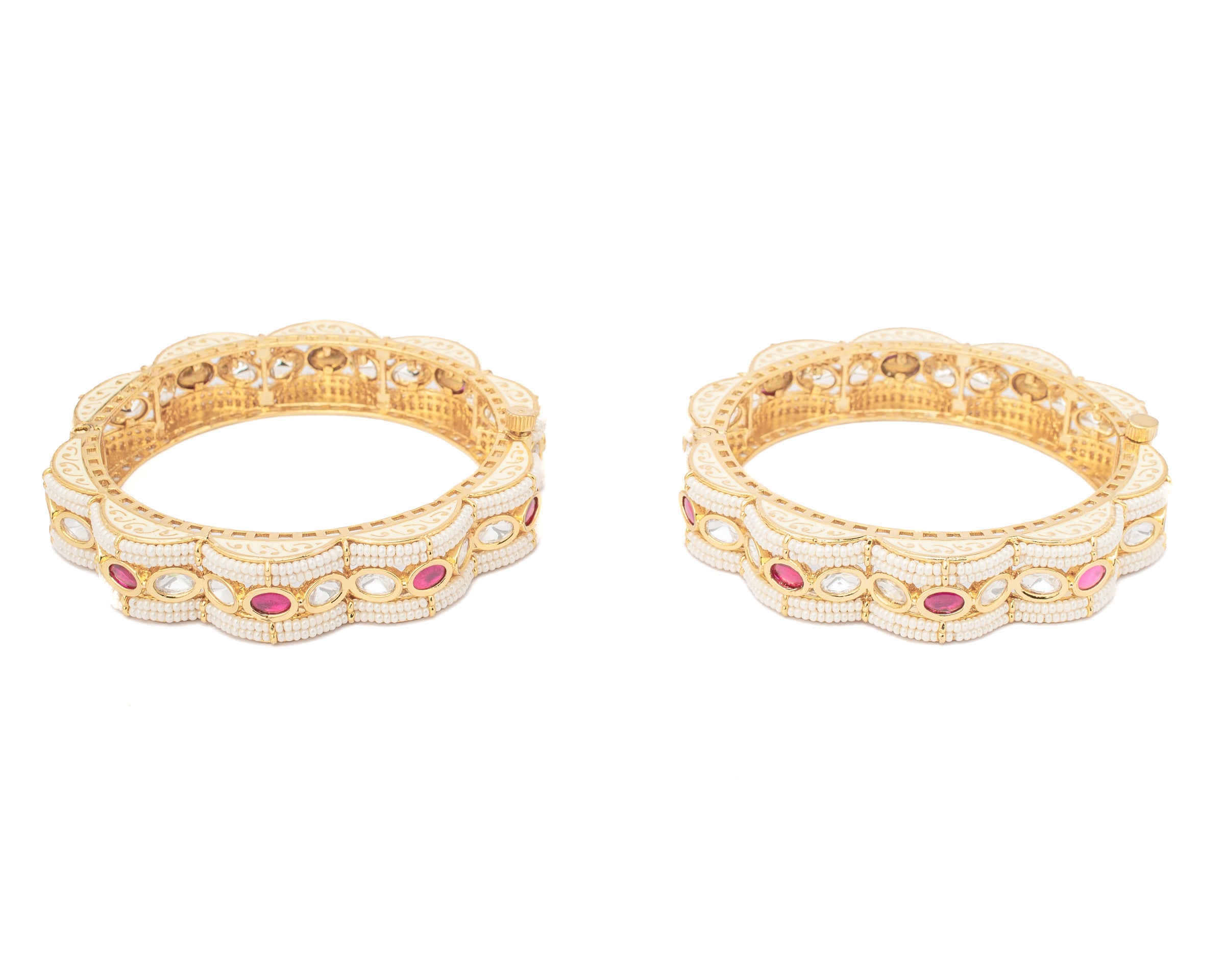 Elegant gold bangles with scalloped designs adorned with sparkling white stones & vibrant pink accents. These timeless accessories exude grace, making them perfect for weddings or festive celebrations.