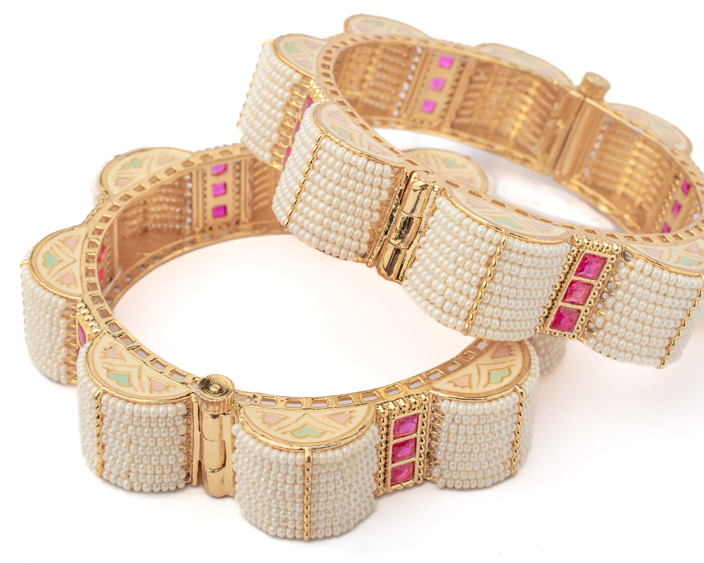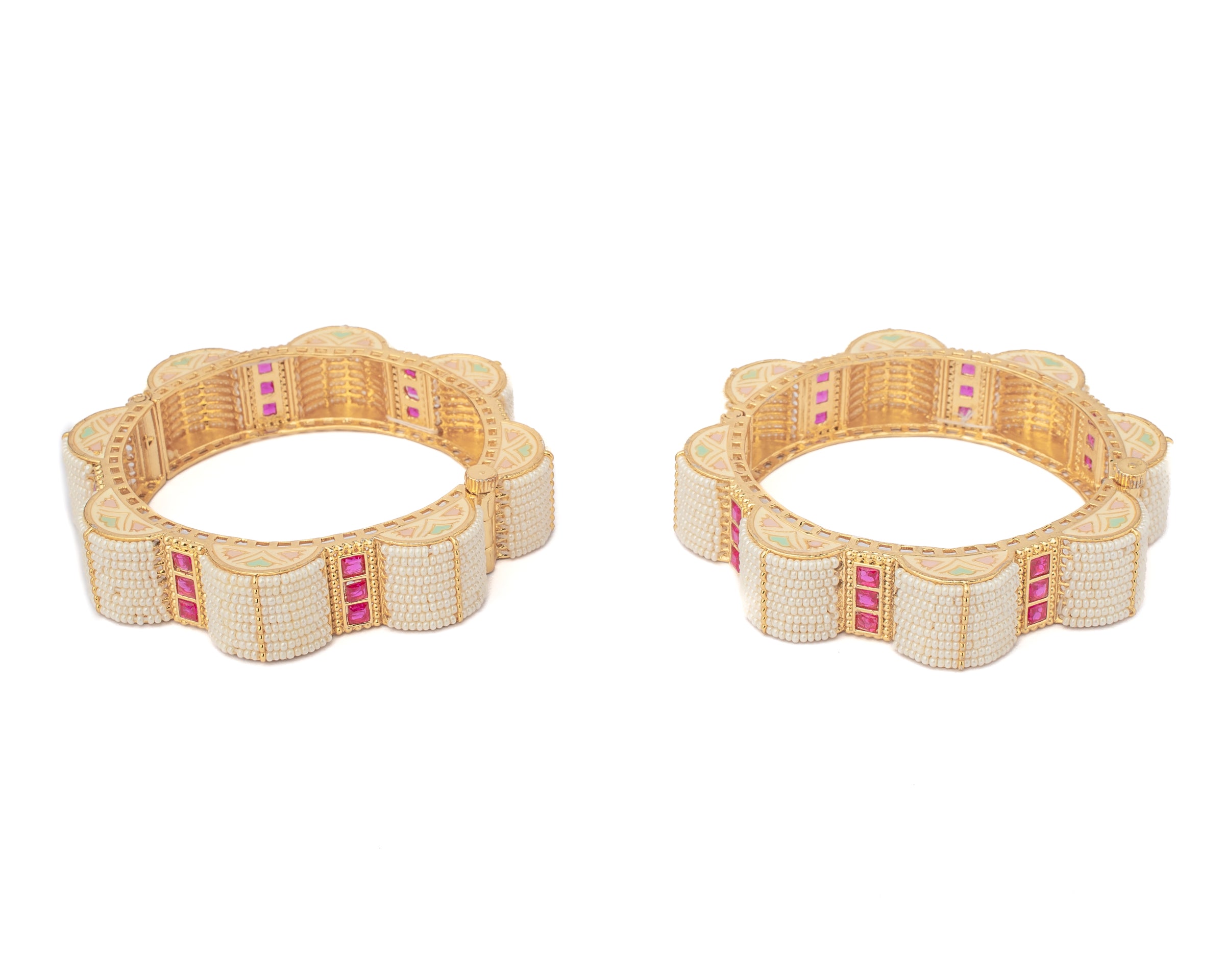 Exquisite scalloped gold bangles embellished with intricate white beadwork & vibrant pink stone. A piece blending modern elegance with traditional charm, ideal for special occasions & festive events.