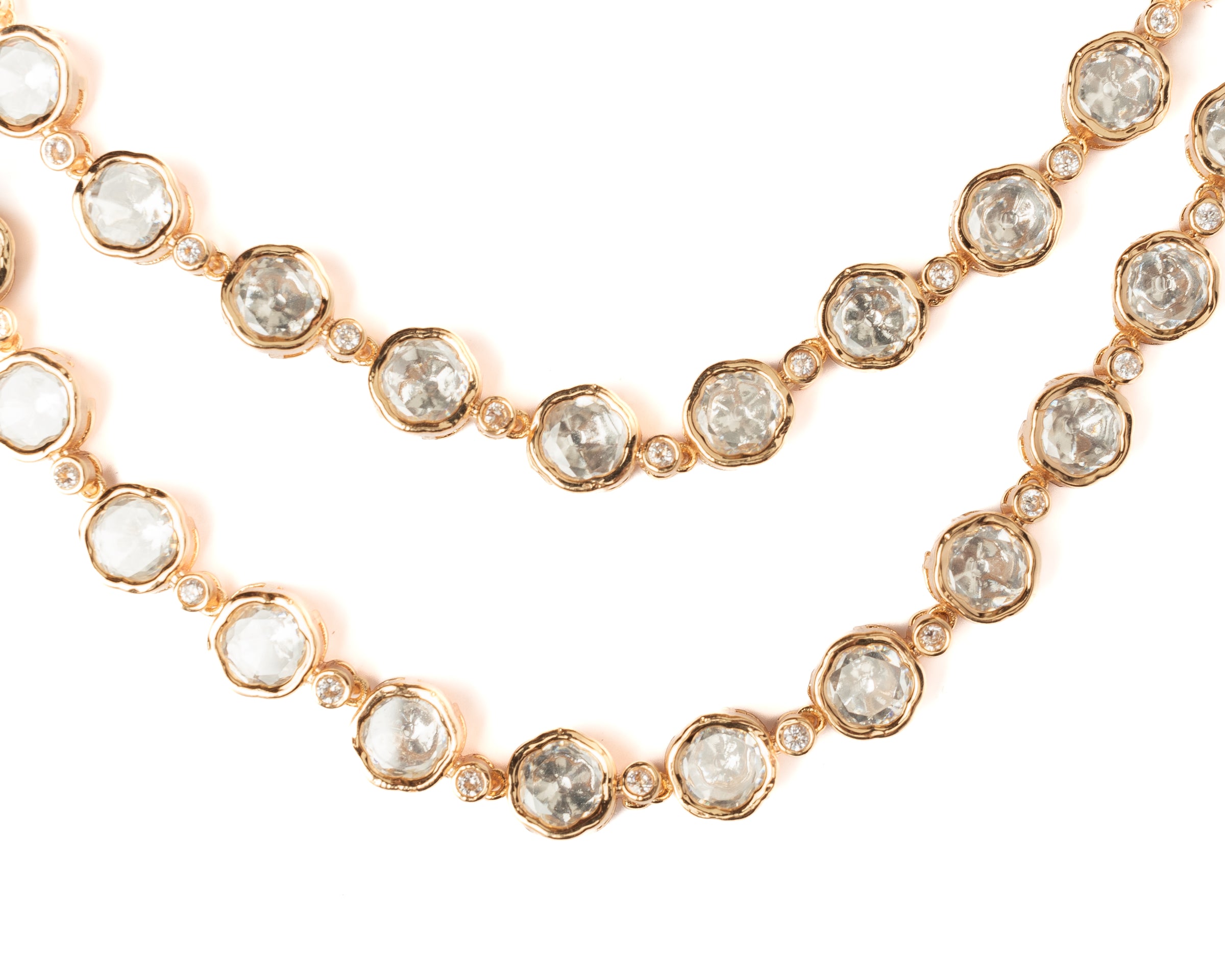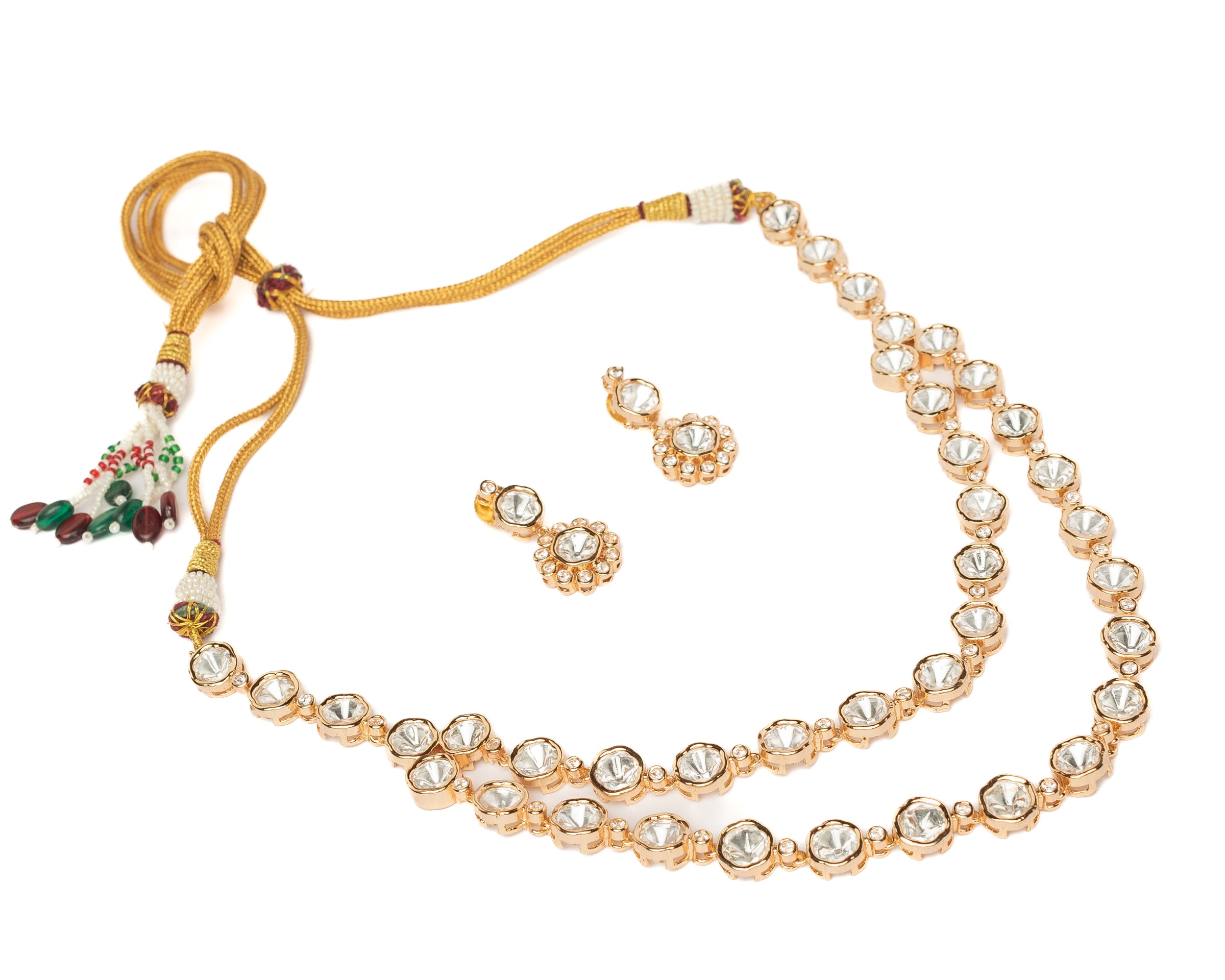 This elegant double-layered necklace set features shimmering white stones and a gold-toned finish.