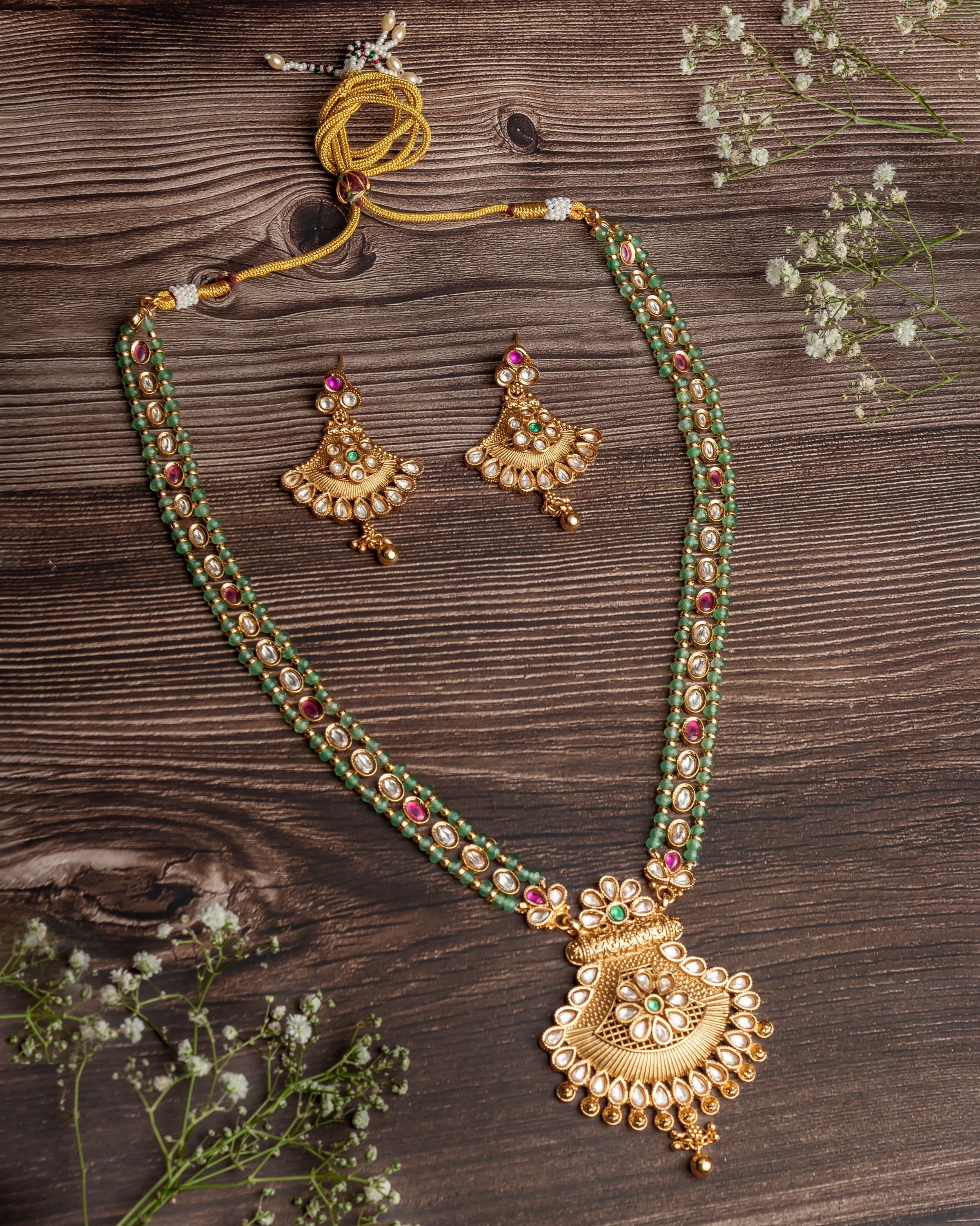 A stunning traditional jewelry set featuring a gold-tone necklace with intricate detailing, green and pink beads, and an ornate pendant,