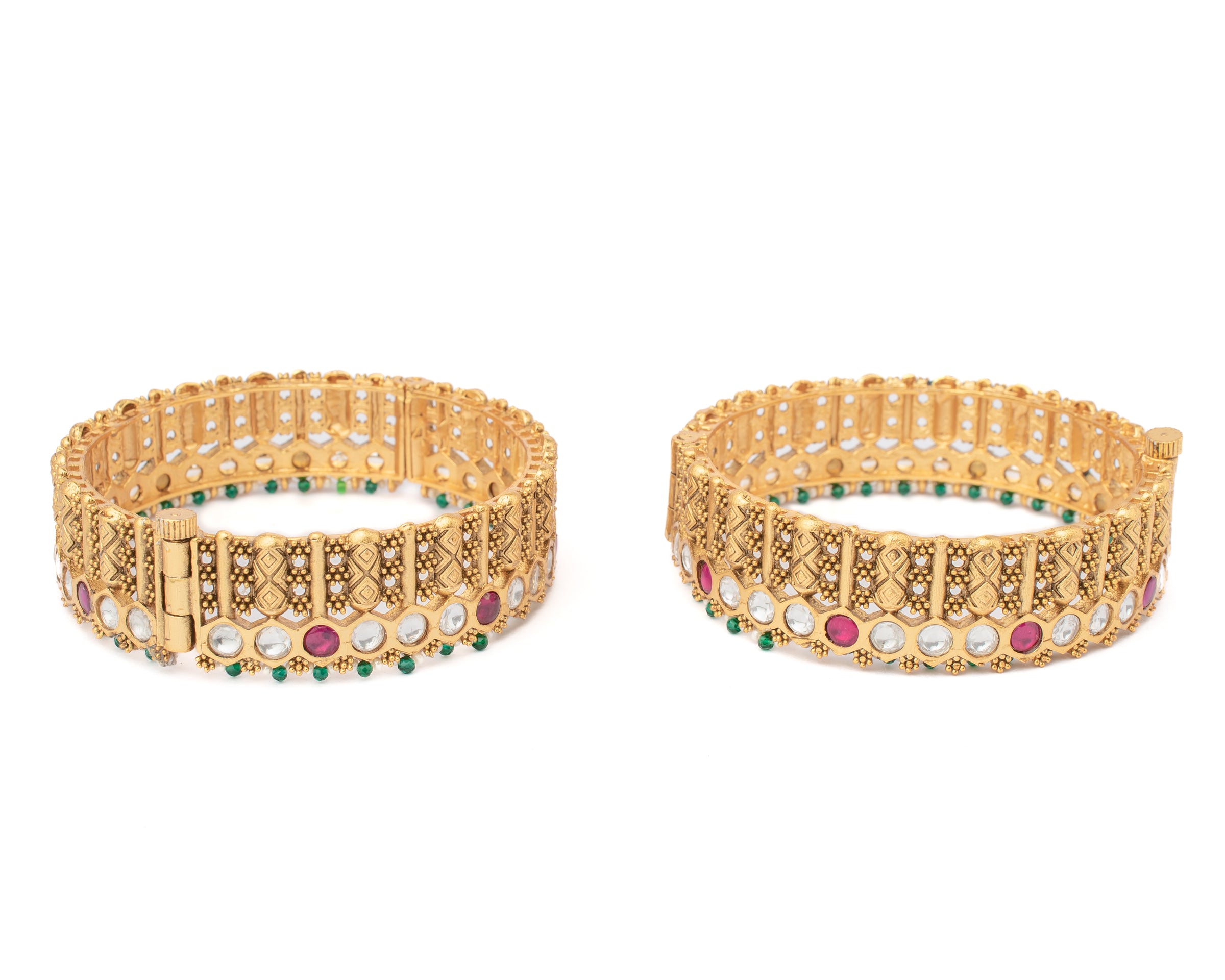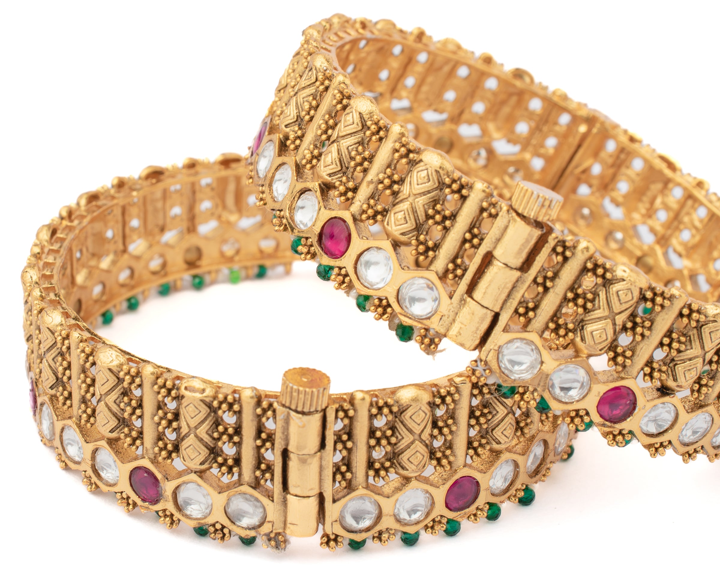 Elegant gold bangles adorned with intricate design, featuring sparkling white stone & vibrant pink & green accent. A perfect blend of tradition, luxury, ideal for weddings, parties & festive celebration.