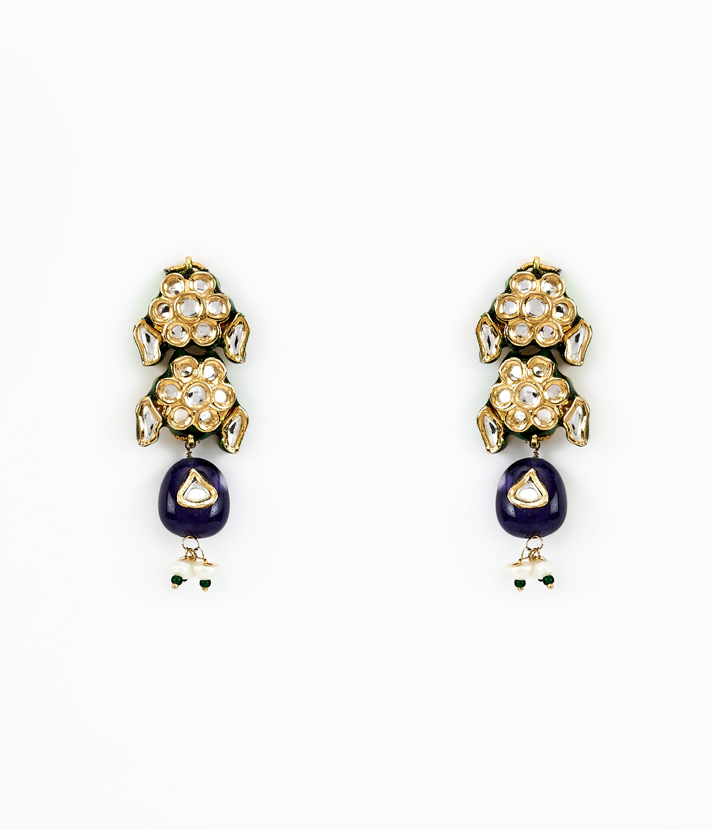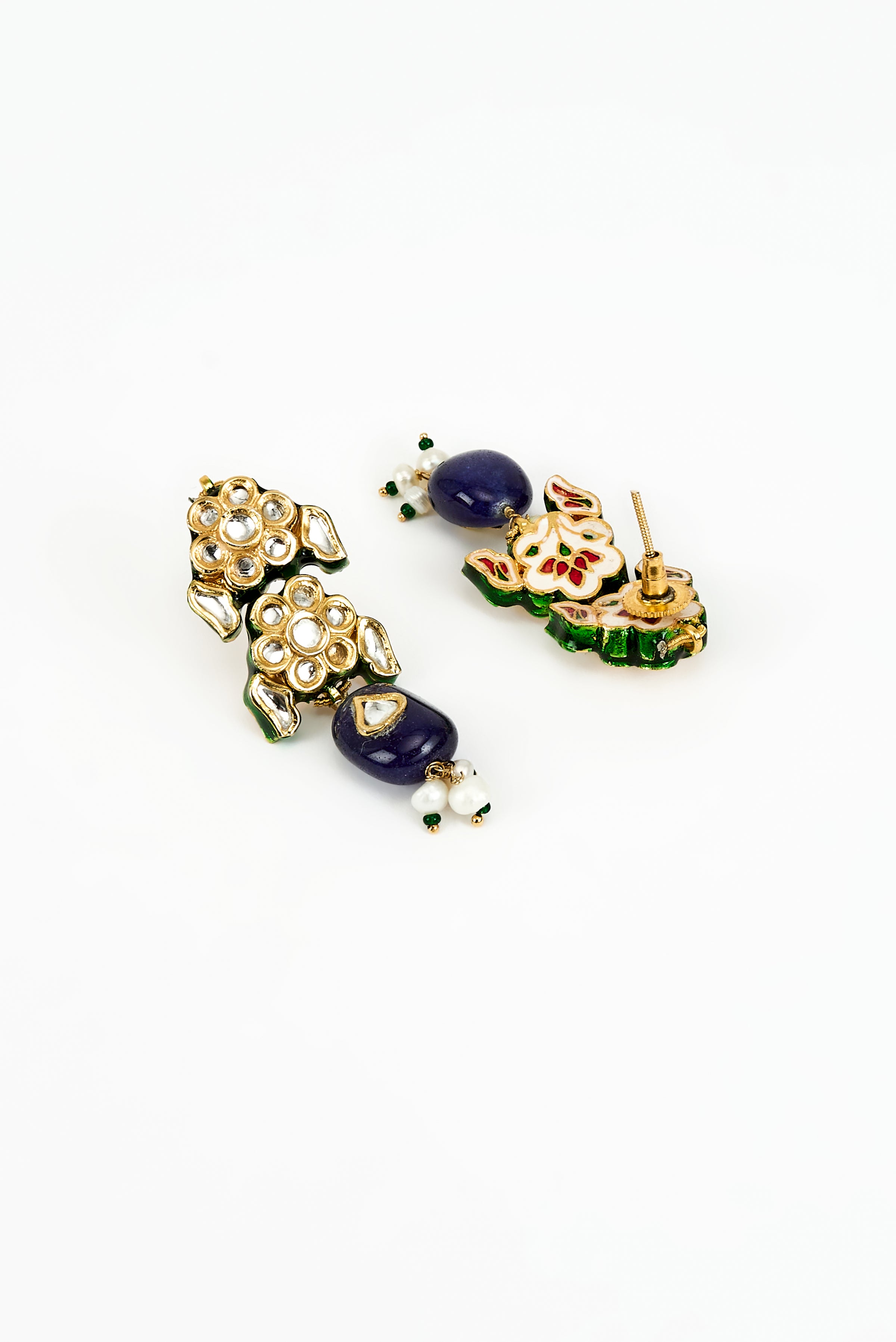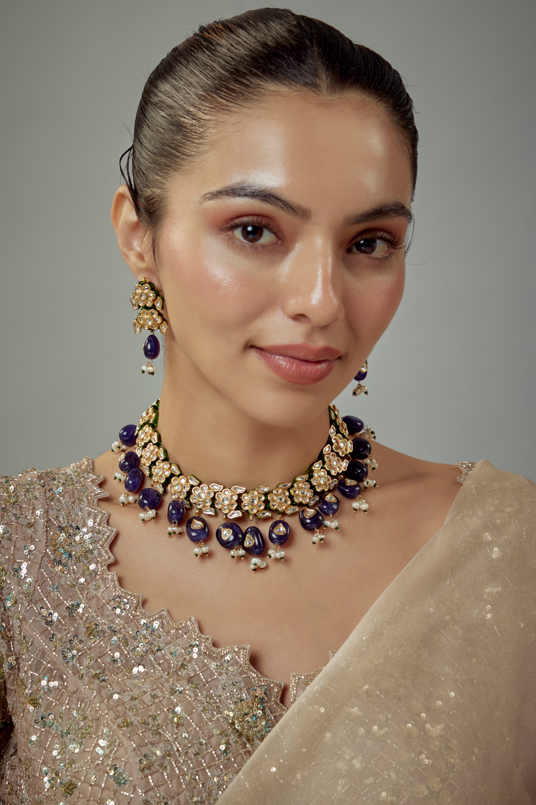 An elegant choker necklace featuring floral kundan work paired with deep blue beads and pearl drops. Perfect for weddings or festive occasions, this design blends tradition with modern sophistication.