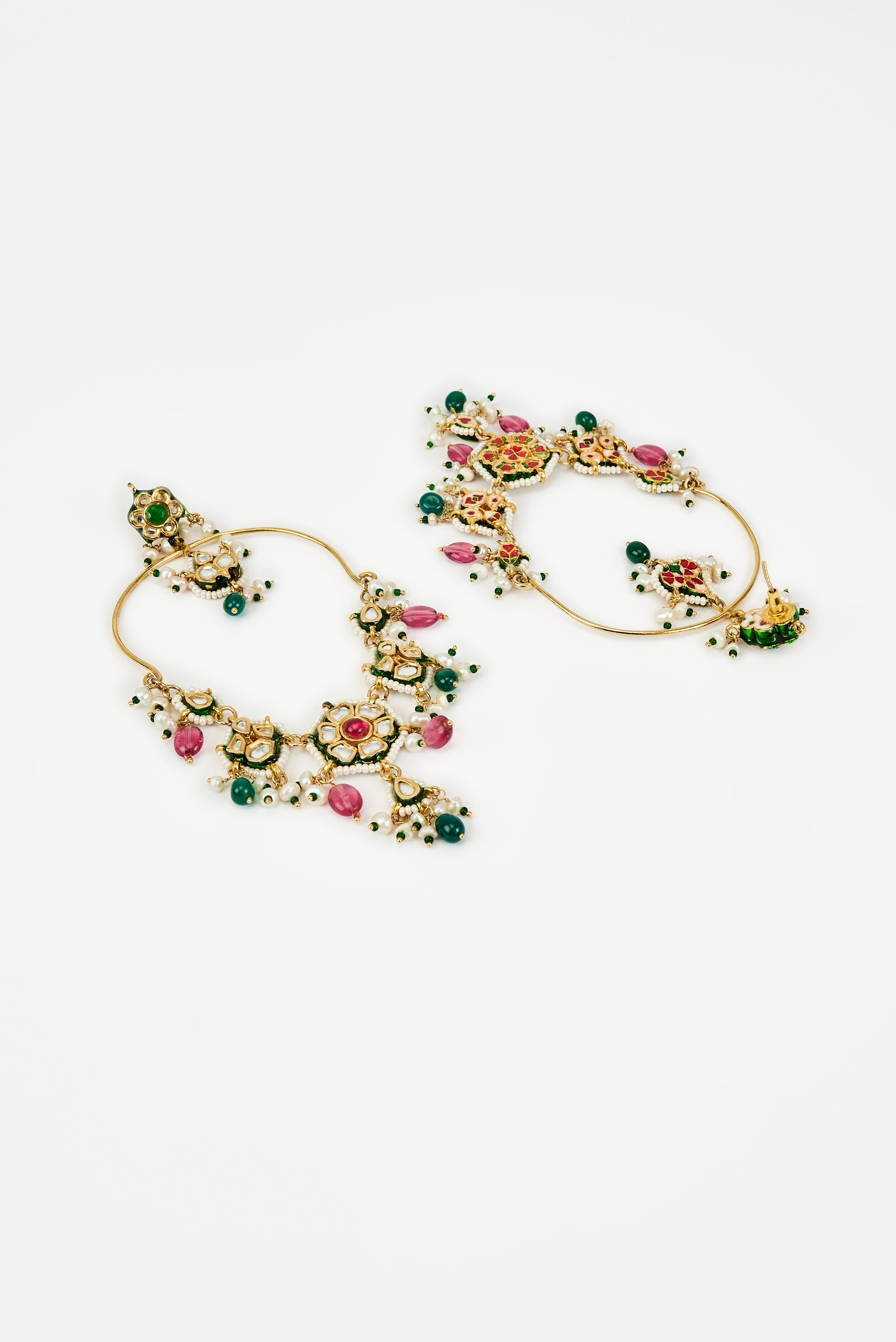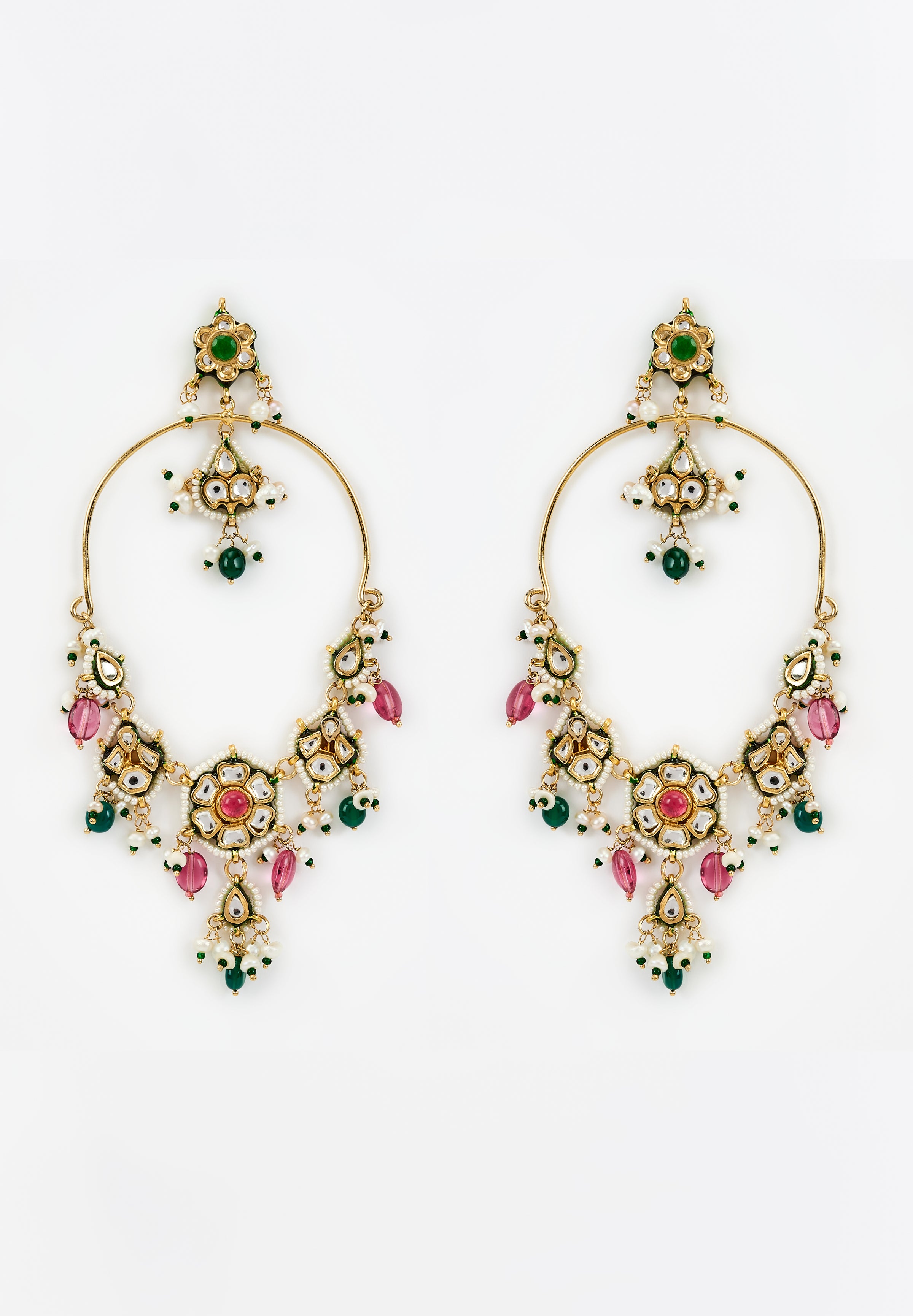 Elegant traditional earrings featuring intricate Kundan work, green & pink beads & pearl embellishments. Perfectly complements festive & bridal outfits with their unique craftsmanship and regal charm.