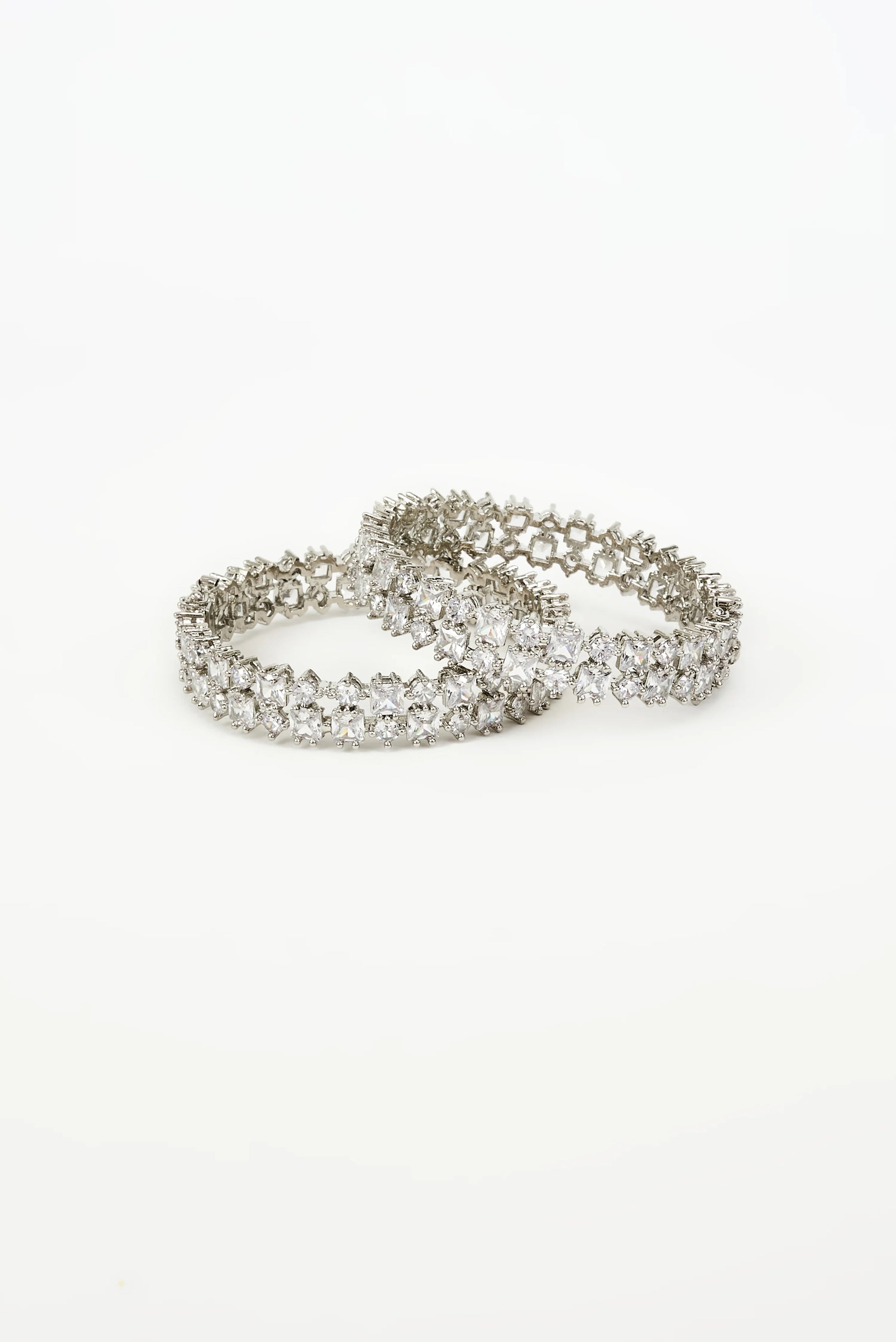 Diamond-encrusted bracelets with radiant-cut stones in a double-row design exude elegance. Paired with a pastel embellished outfit, they add timeless sophistication and glamour to any formal occasion.