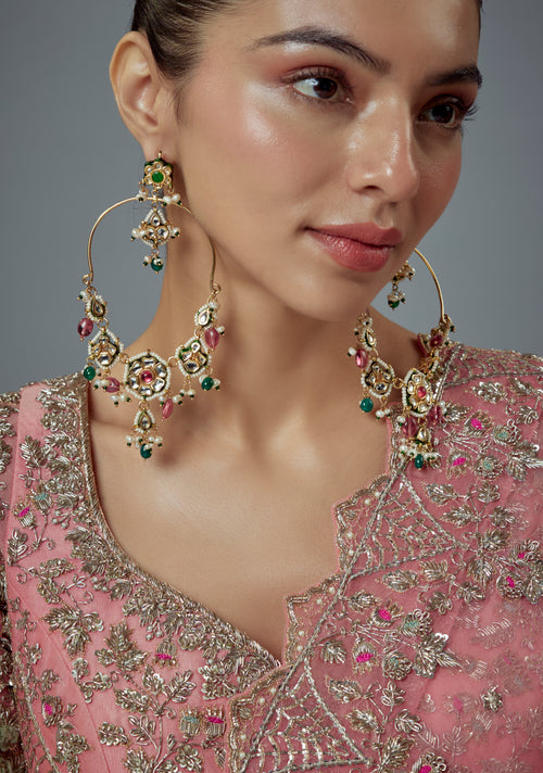 Gold Plated Kundan Studded With Multi Colour Beads Drop Layered Chandbali Earrings