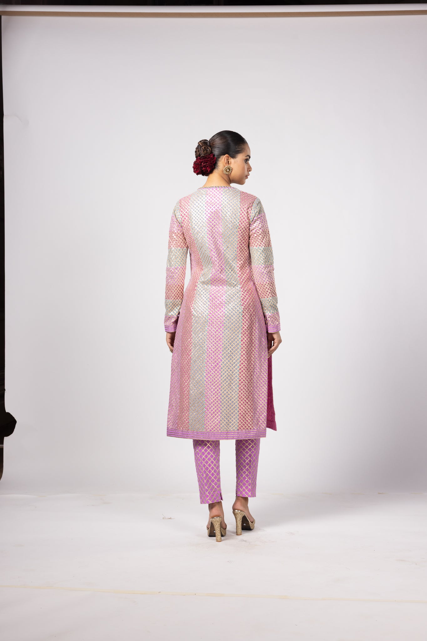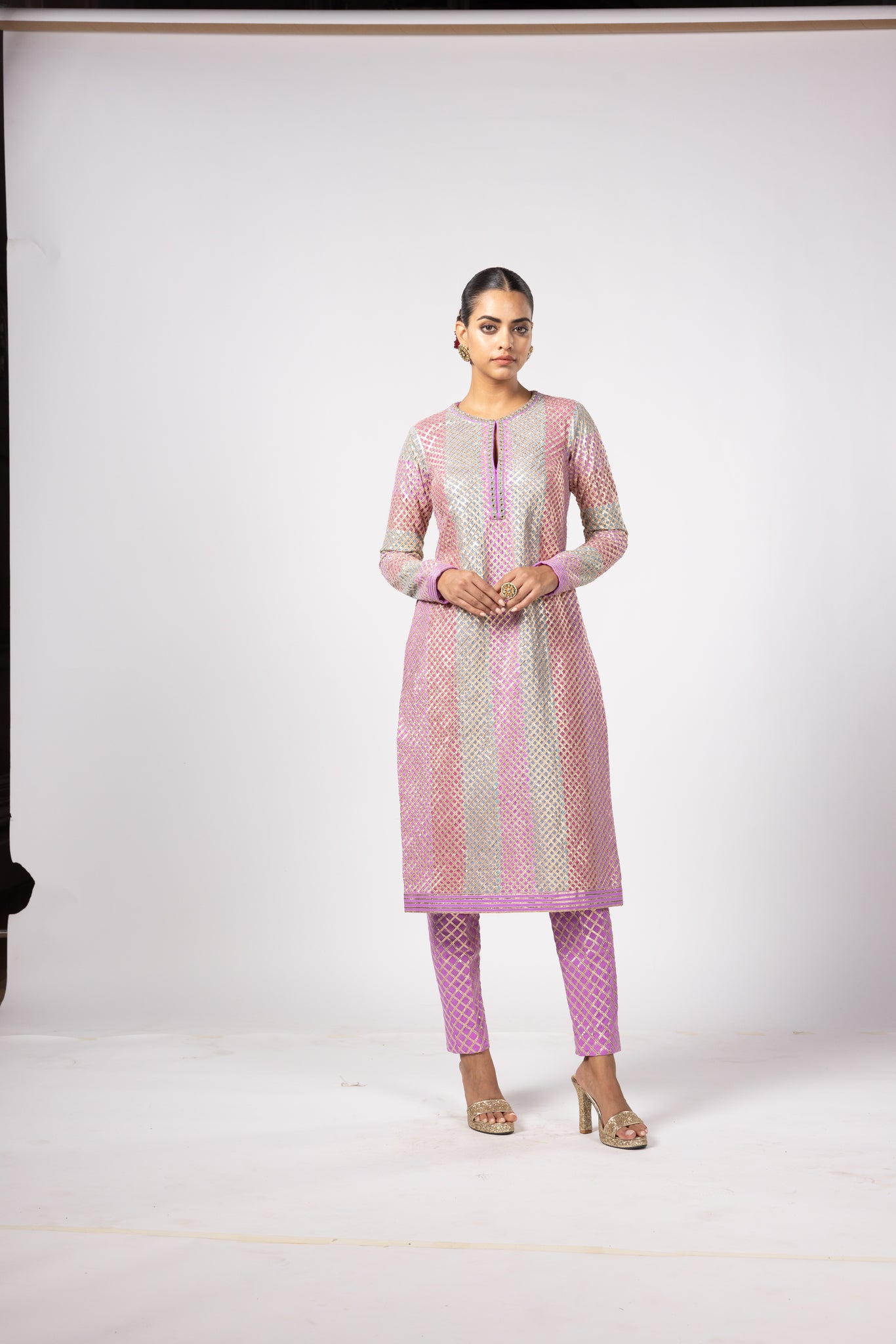 A vibrant multicolor kurta in aqua, mauve, dark blush tones, adorned with golden gota embroidery, paired with a straight pants set.