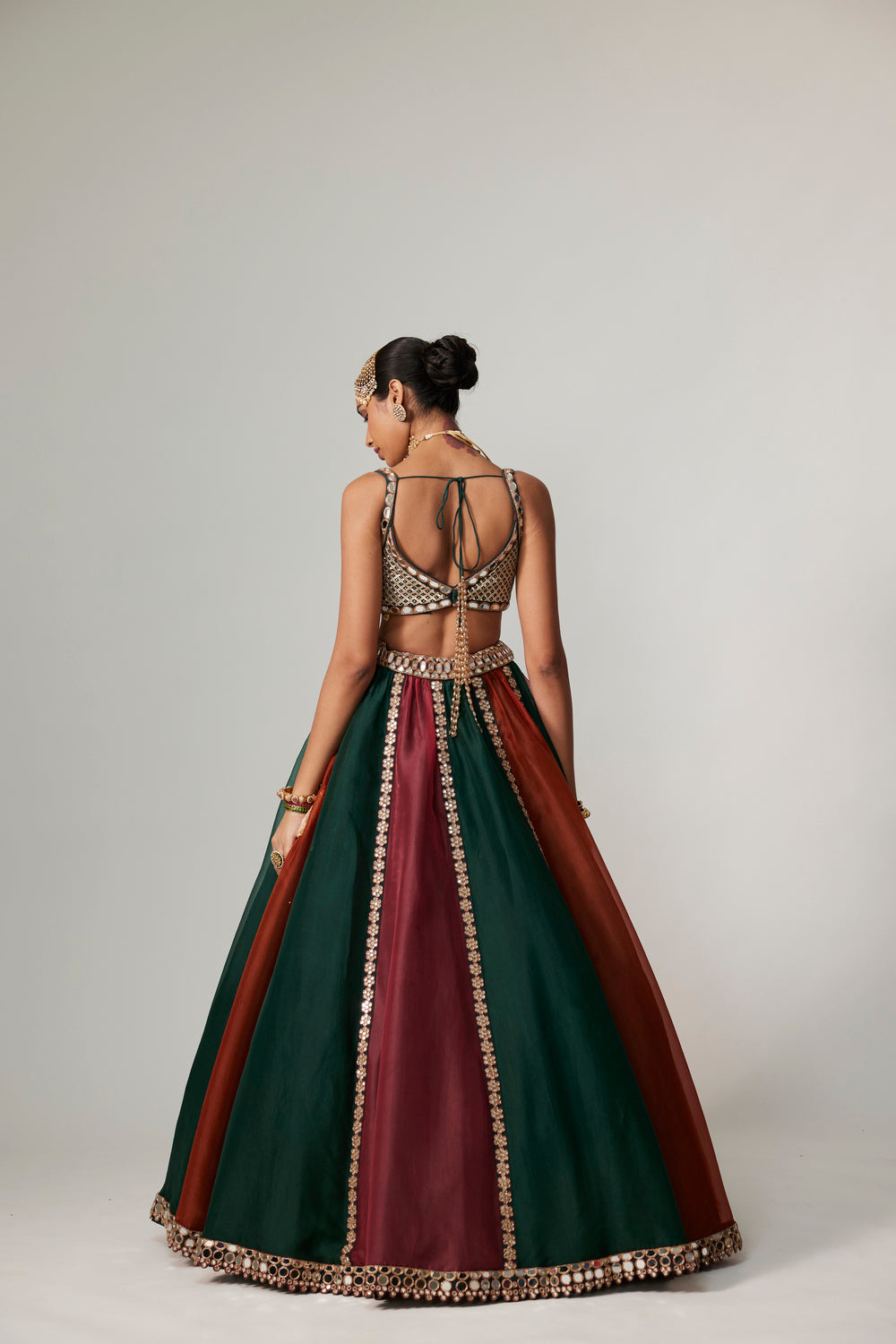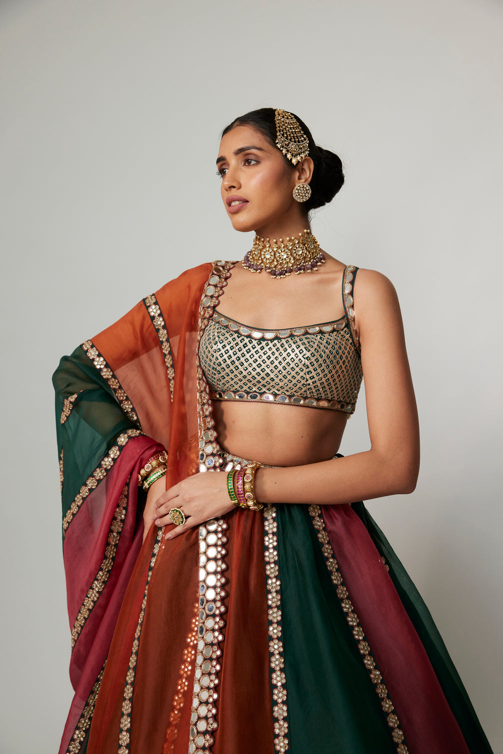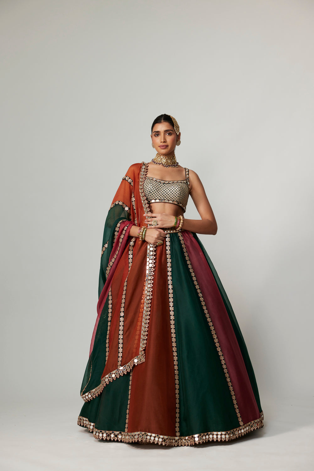 A vibrant multicolor organza lehenga in jade green, rust, and cranberry tones, adorned with golden gota embroidery. It is paired with a square neck georgette blouse and a matching organza dupatta.
