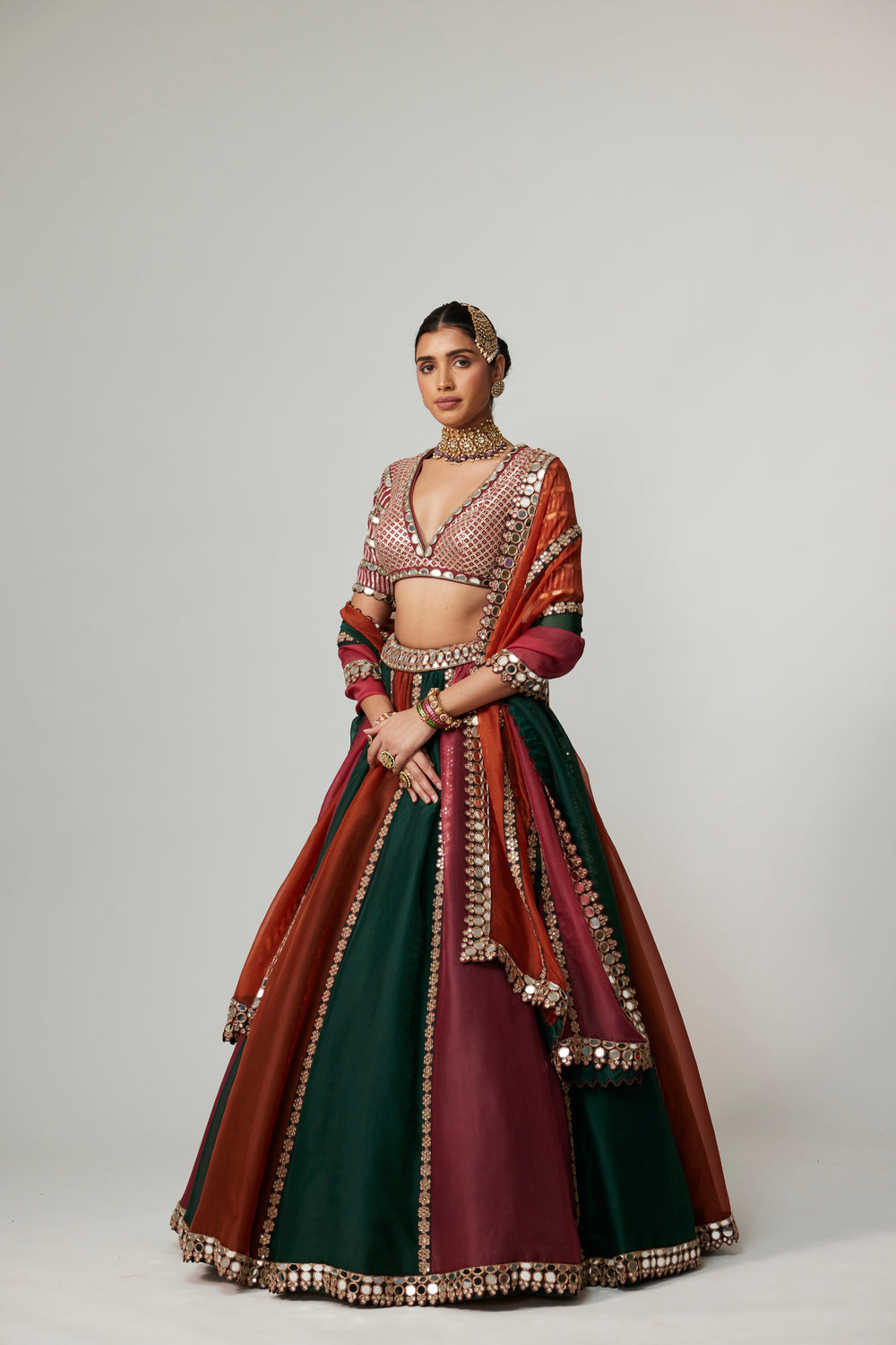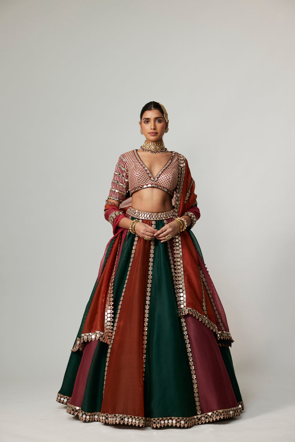 A vibrant multicolor organza lehenga in jade green, rust, and cranberry tones, adorned with golden gota embroidery, paired with a v neck georgette blouse and a matching organza dupatta.