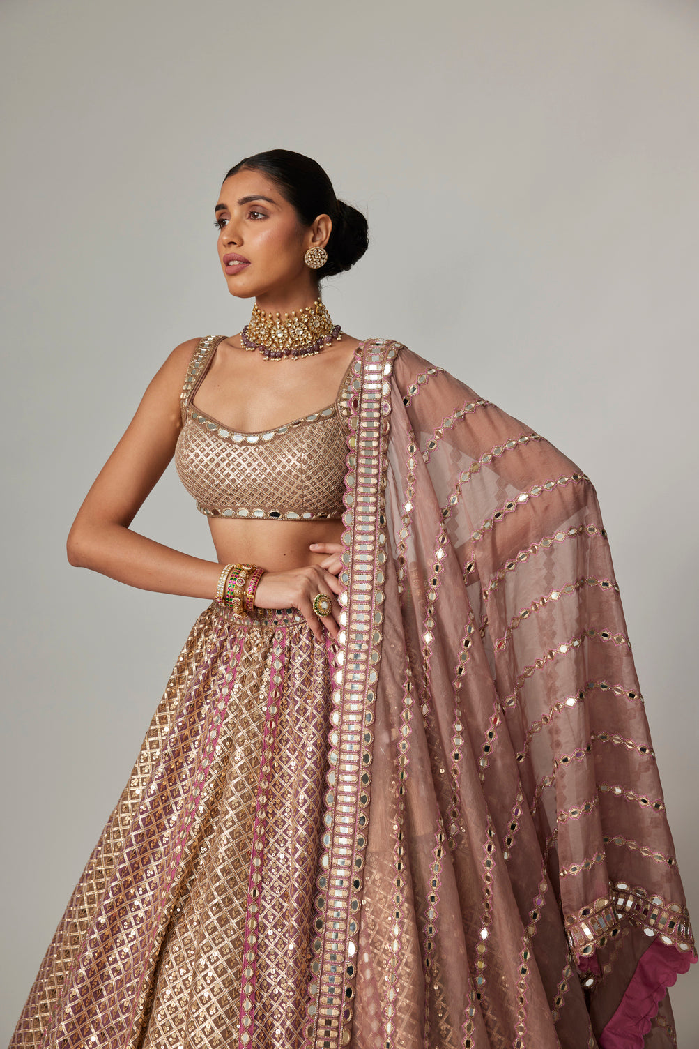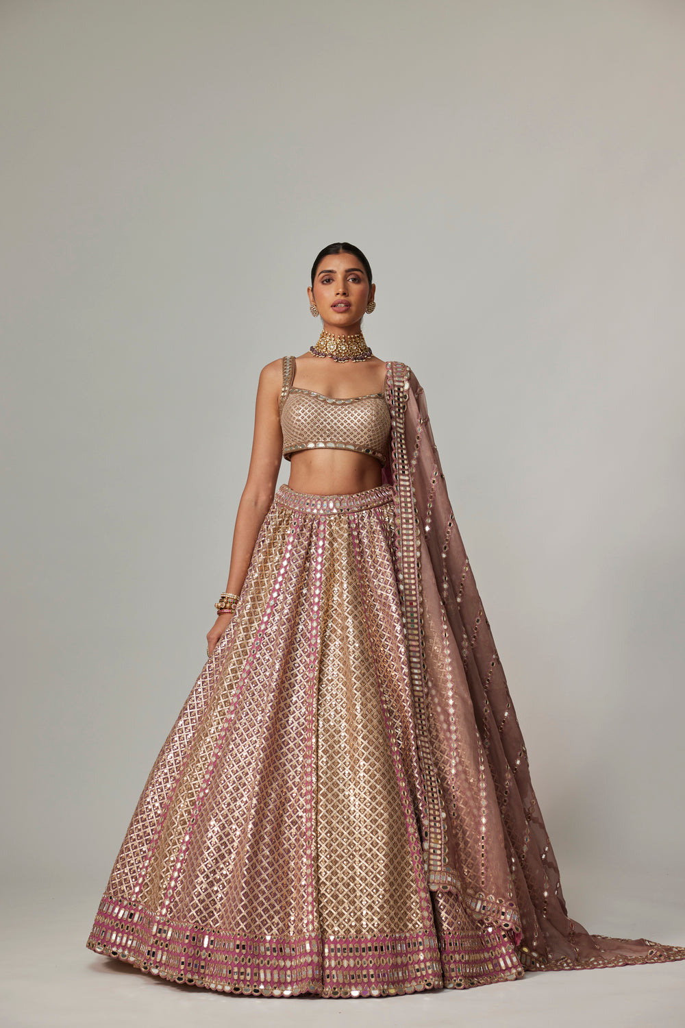 Color – Blouse-Deep Beige; Lehenga-Mud Mauve, Deep Beige; Dupatta-Deep Beige