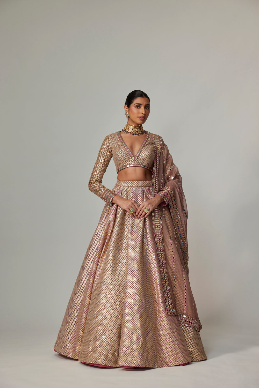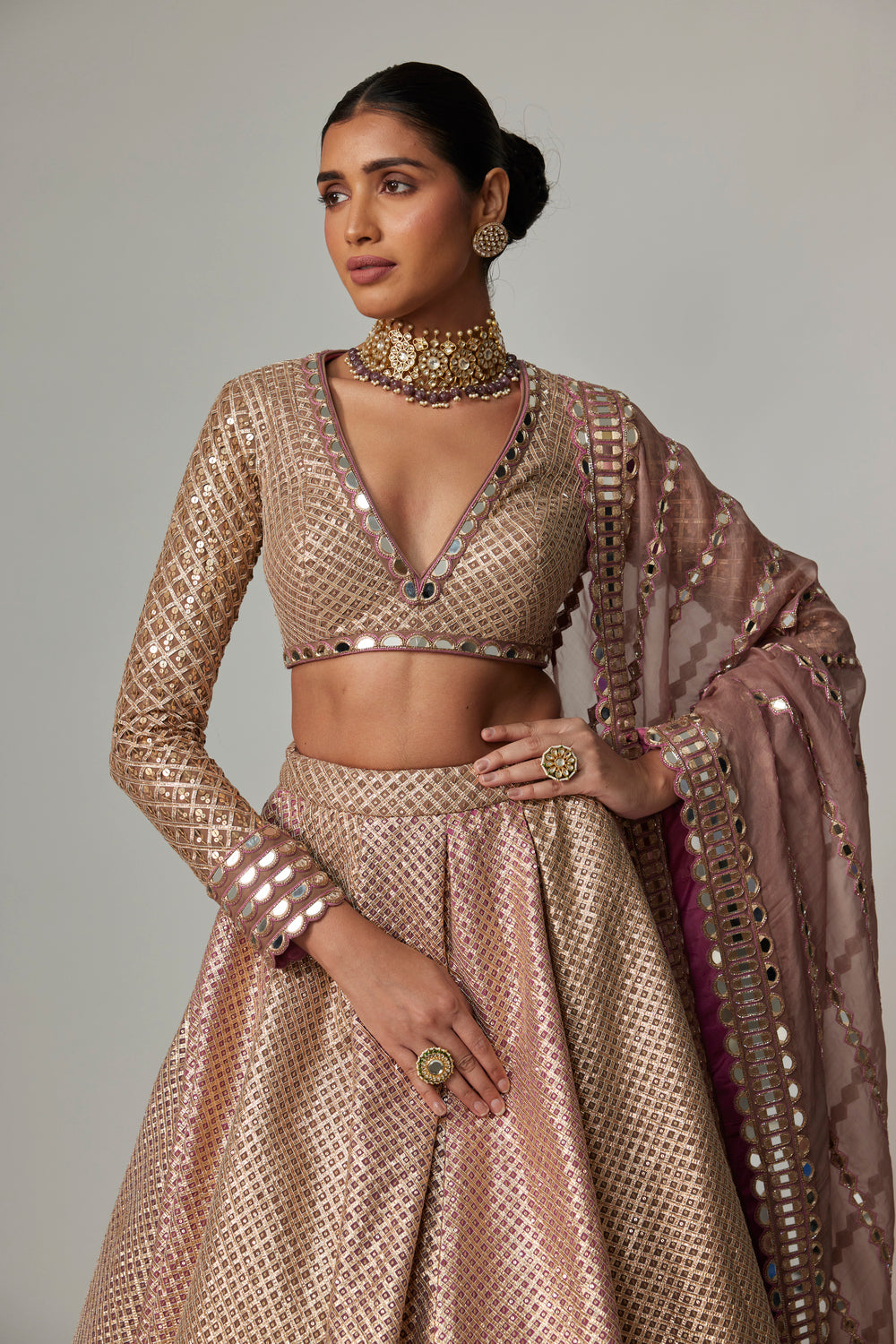 Color – Blouse-Deep Beige; Lehenga-Mud Mauve, Deep Beige, Dark Blush; Dupatta-Deep Beige