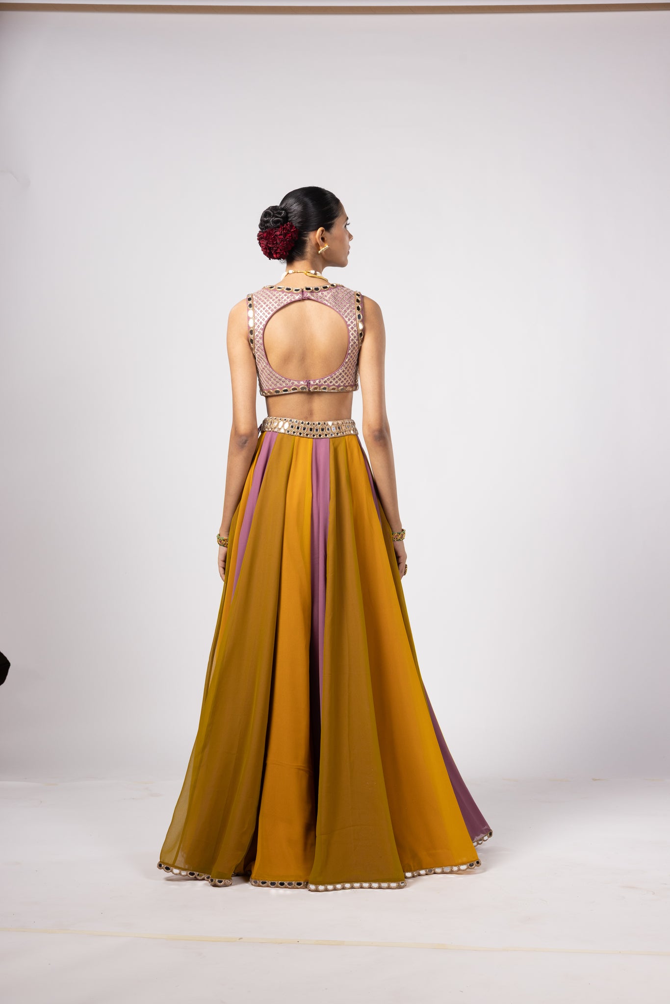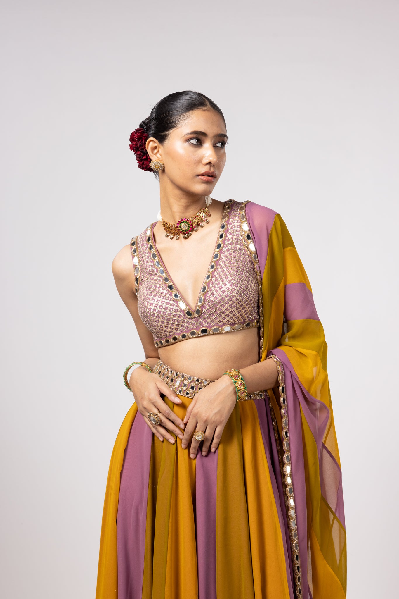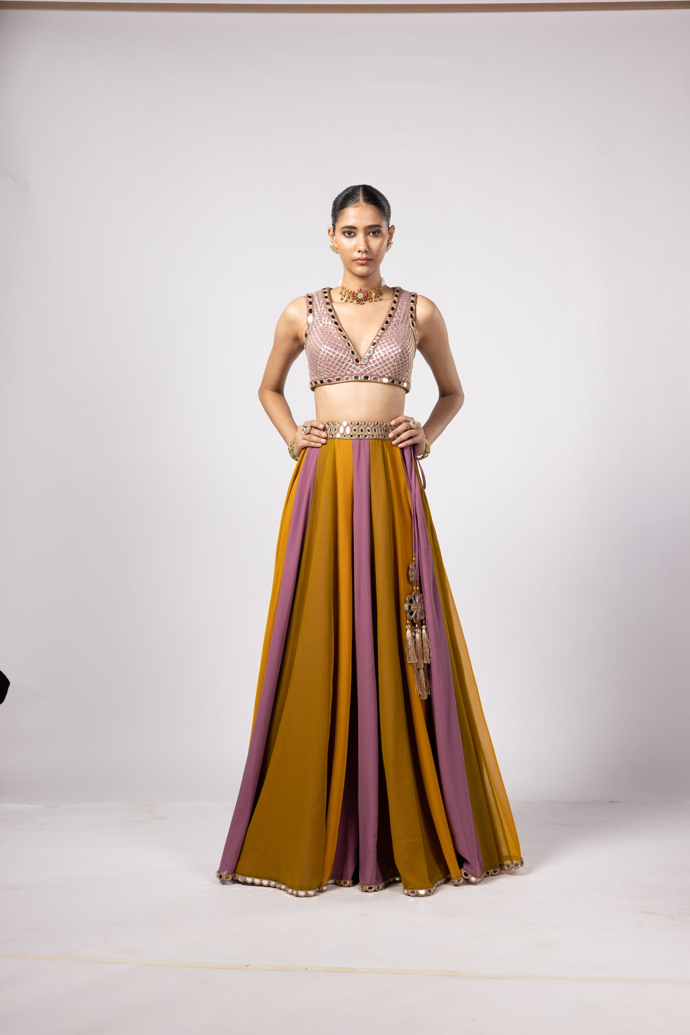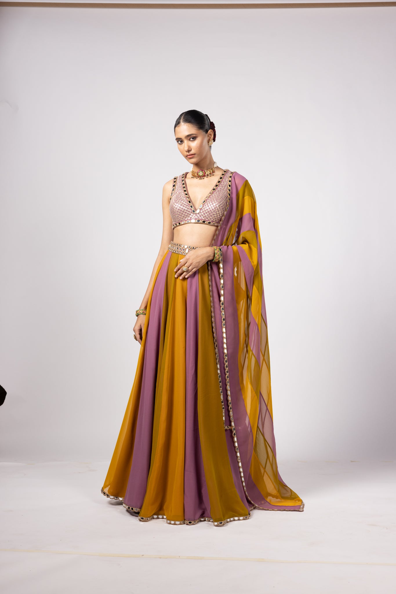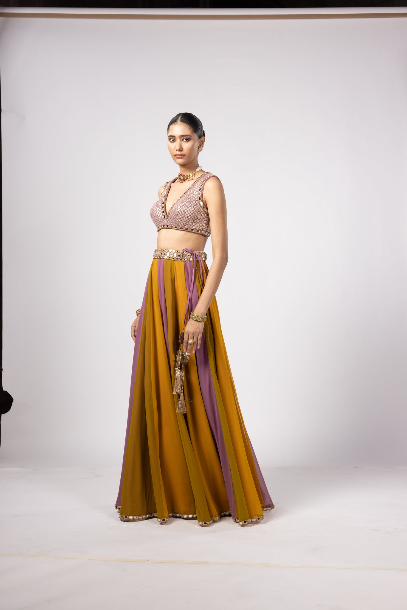 Color - Blouse-mud mauve; Lehenga pants-green, mustard, mud mauve; Dupatta-green, mud mauve, mustard