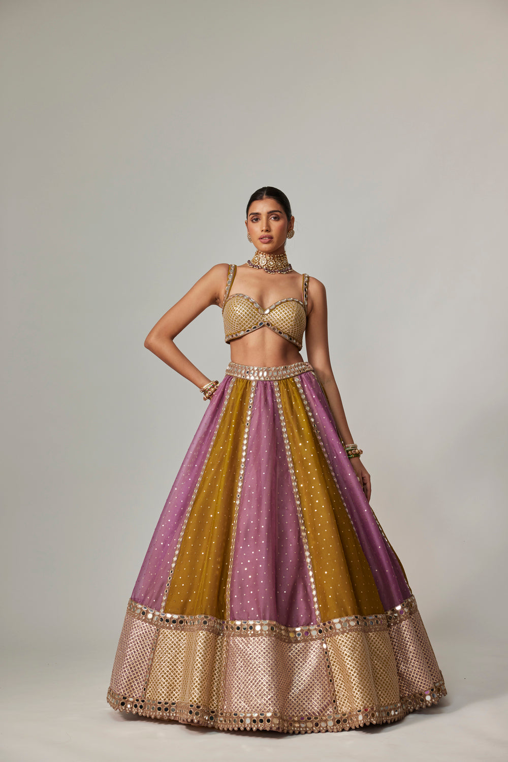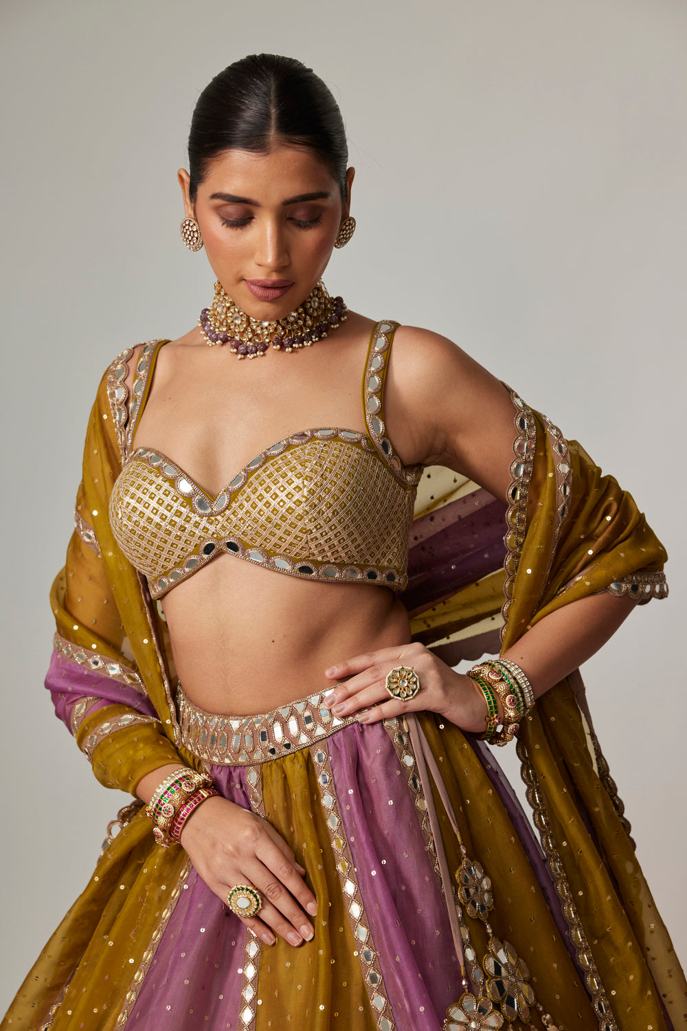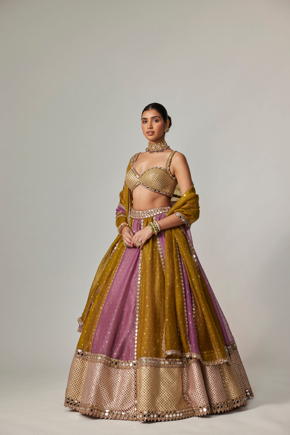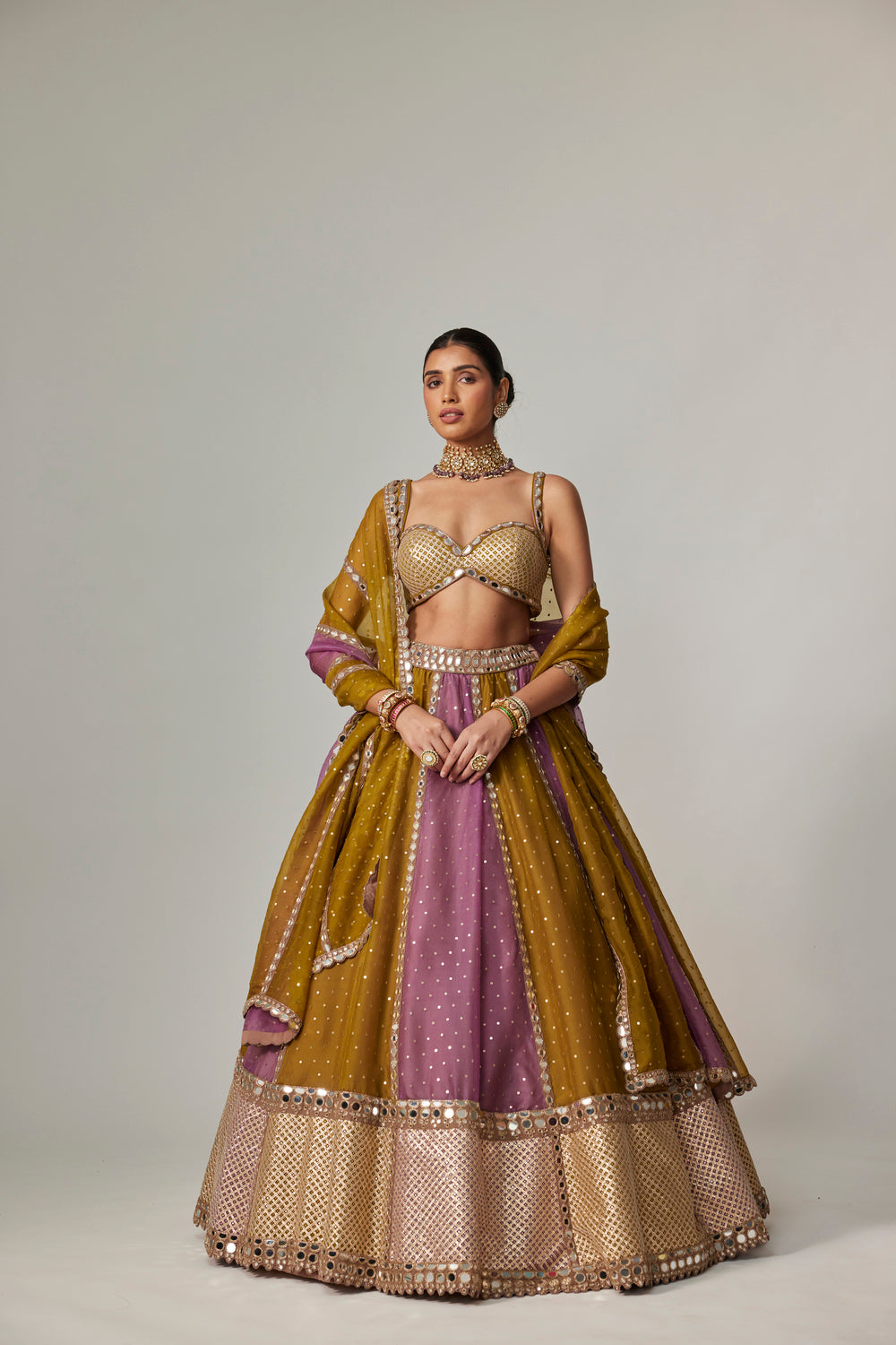 A lively and elegant multicolor lehenga crafted in rich tones of mustard, mauve, and green, detailed with exquisite golden gota embroidery. The outfit includes a sweetheart neck blouse in green and a complementing dupatta, designed to bring a perfect blend of traditional detail and festive charm.