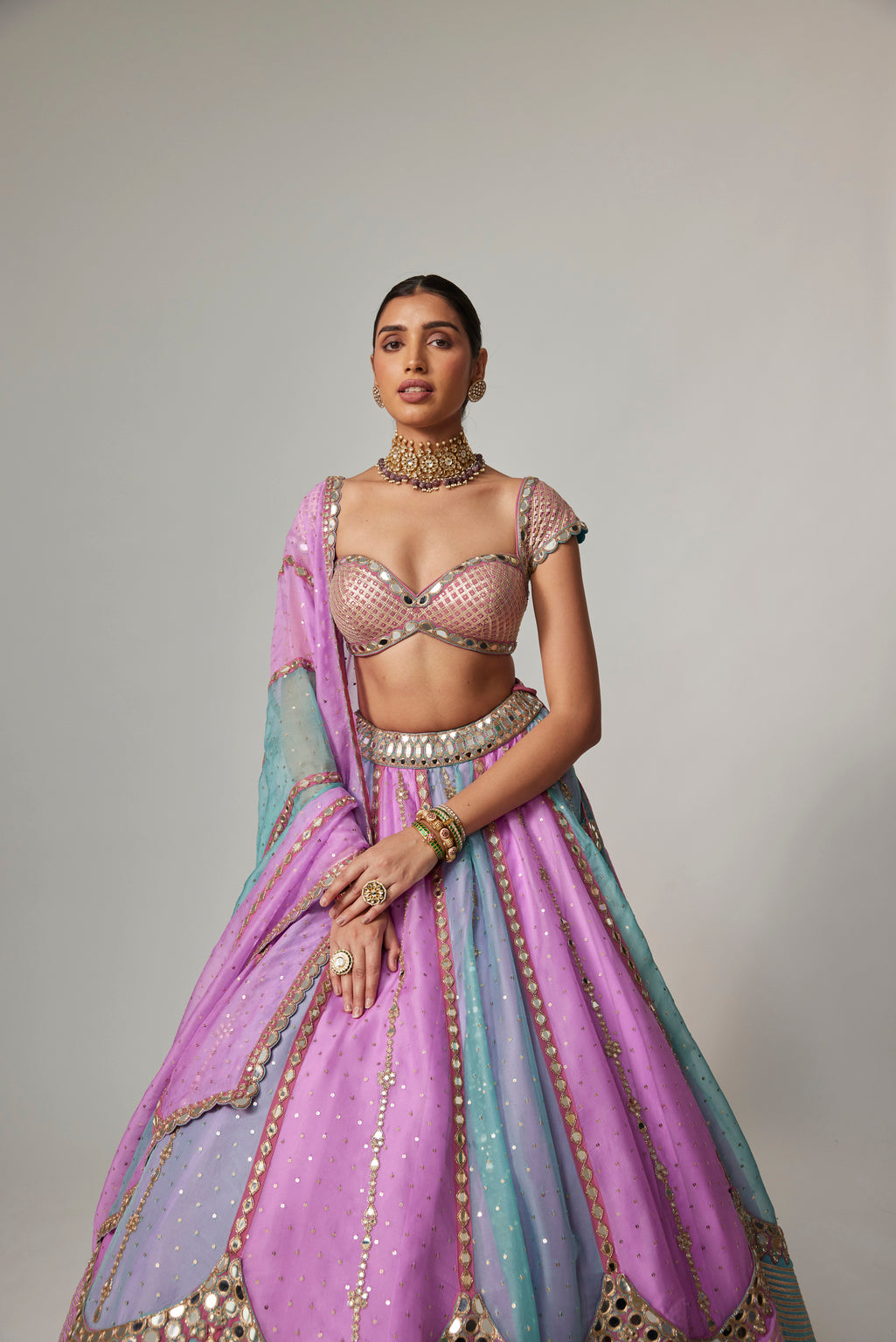 A vibrant multicolor organza lehenga in mauve, aqua, and dark blush tones, adorned with golden gota embroidery. This stunning piece is paired with a cap sleeve blouse, creating a sophisticated look.