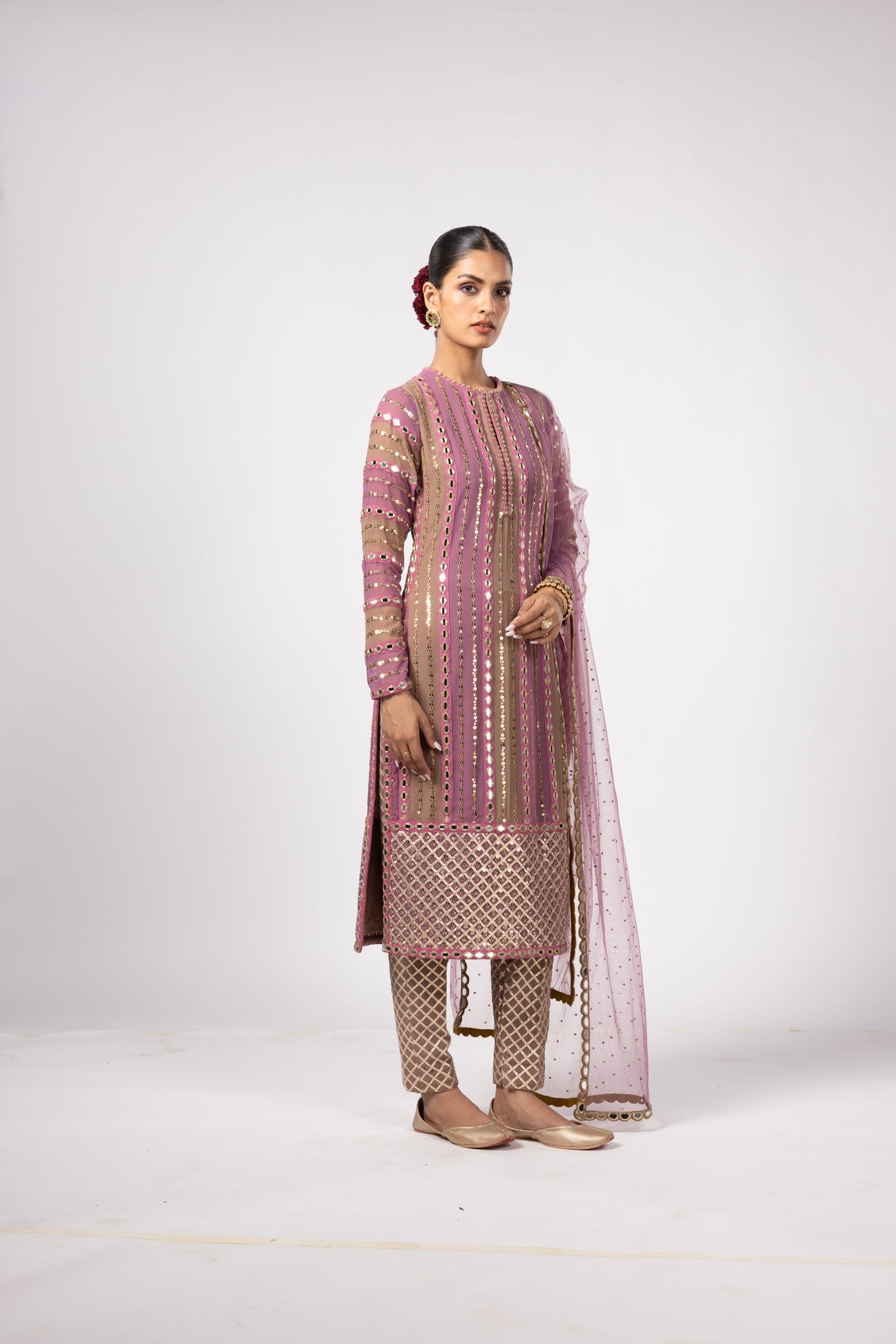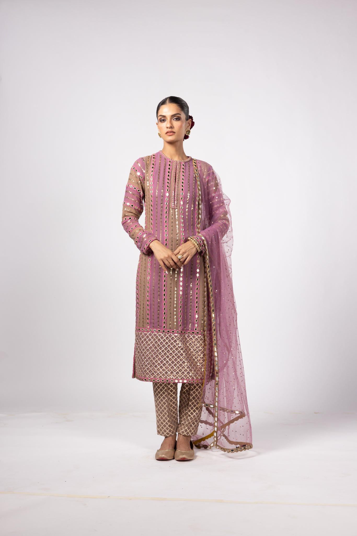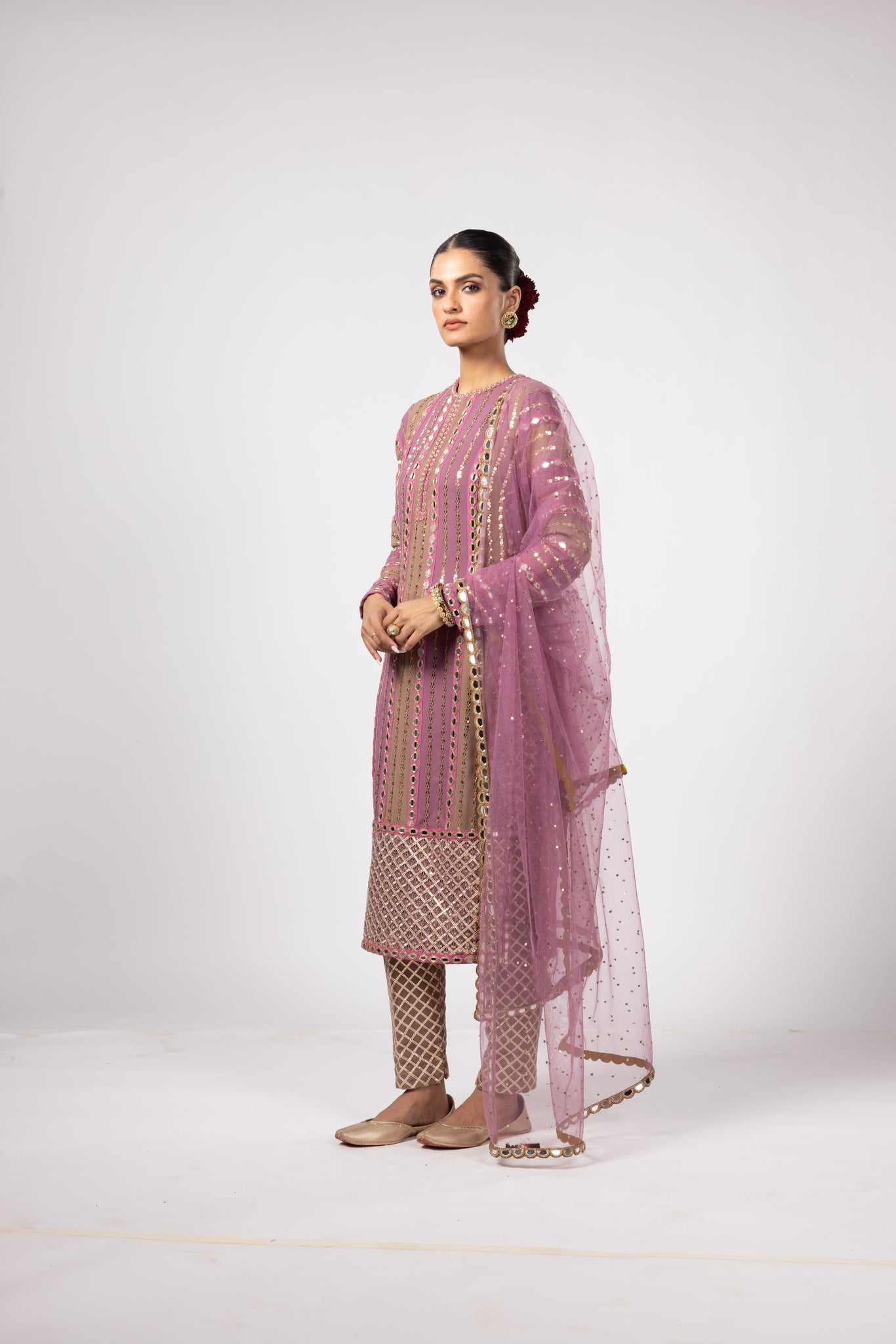 Color – Kurta-deep beige, mud mauve; Pant-deep beige; Dupatta-mud mauve
