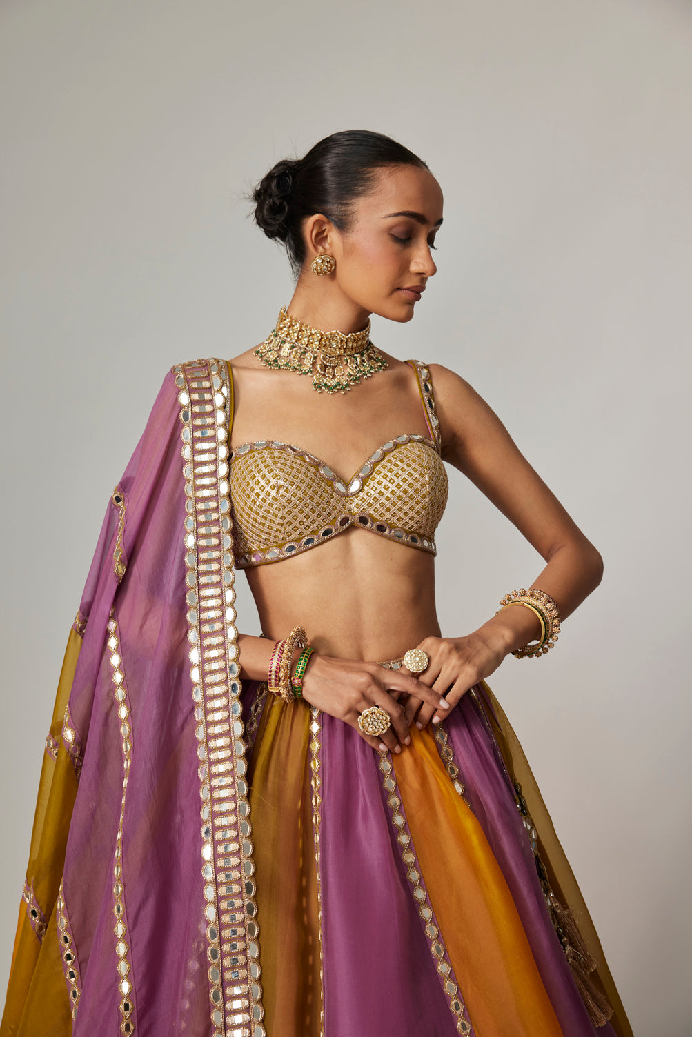 A stunning multicolor lehenga featuring a rich blend of mustard, mauve, and green hues, highlighted with intricate golden gota embroidery. This ensemble is paired with a sweetheart neck blouse in green and a matching organza dupatta, offering an elegant fusion of traditional craftsmanship and contemporary design.