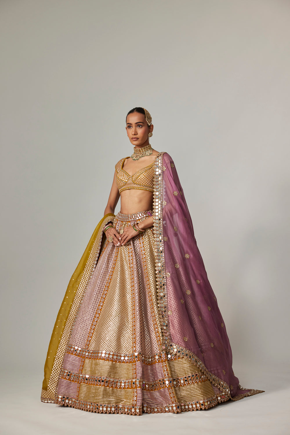 A vibrant multicolor lehenga in mustard, mauve, and green tones, adorned with golden gota embroidery, paired with a cap sleeve blouse and double dupatta for a dramatic flair.