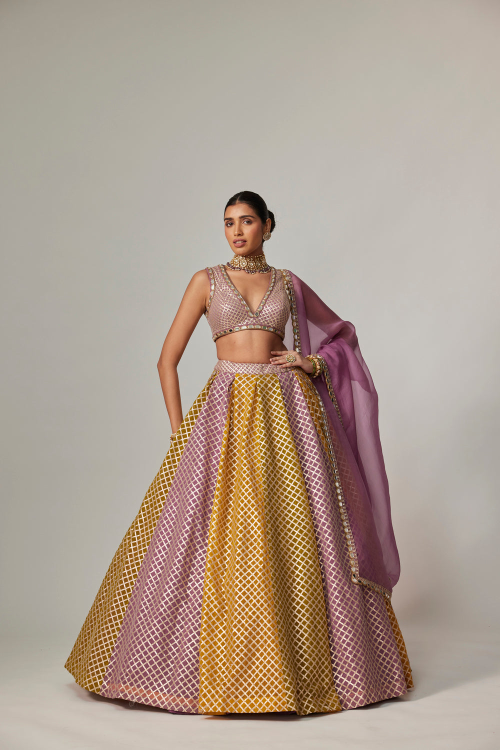A vibrant multicolor lehenga in mustard, mauve, and green hues, enhanced with golden gota embroidery. This ensemble features a stylish V-neck crop top and a flowing organza dupatta, ideal for festive gatherings and celebrations.