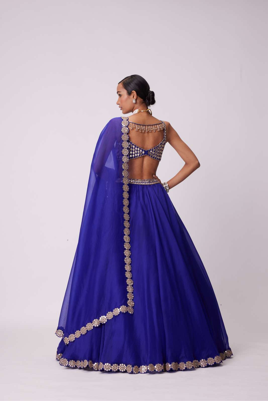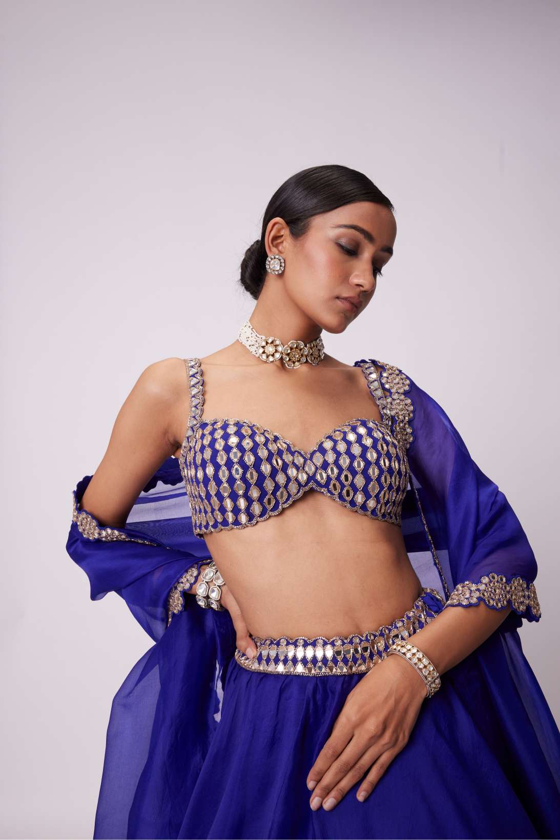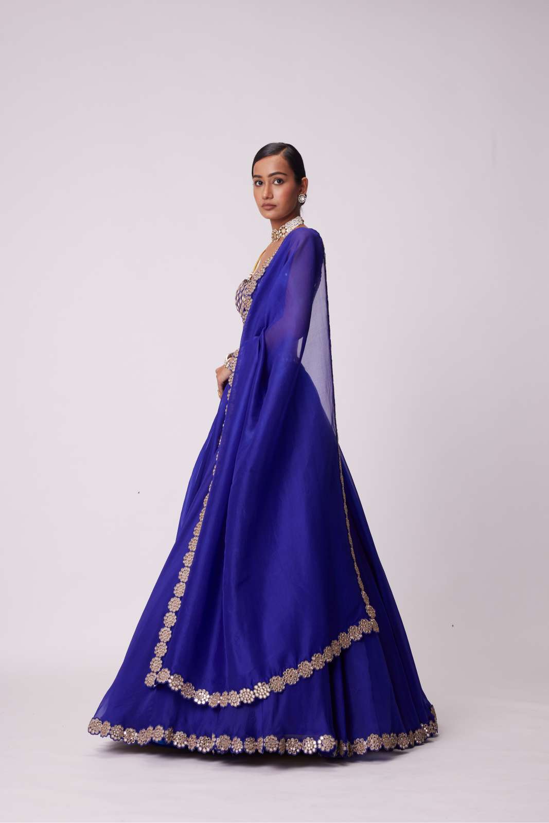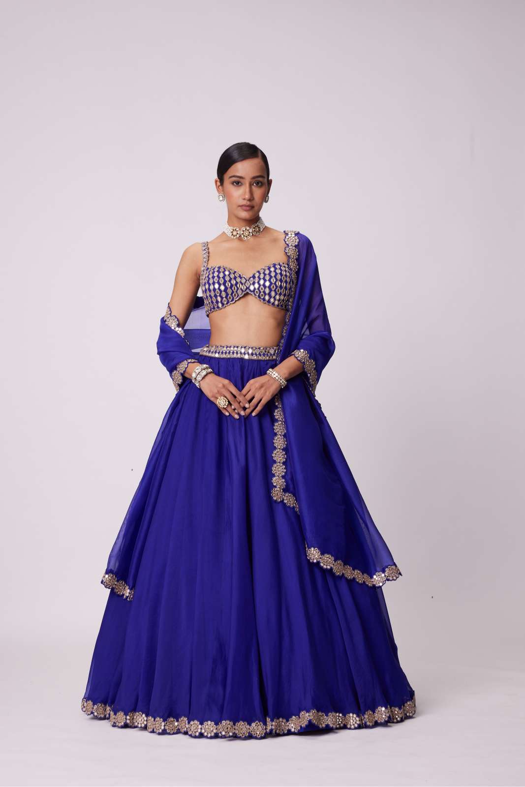 Persian Blue Organza Hand Embroidered Lehenga And Dupatta Clubbed with Real Hand Cut Mirror Embroidered Sleeveless Blouse.