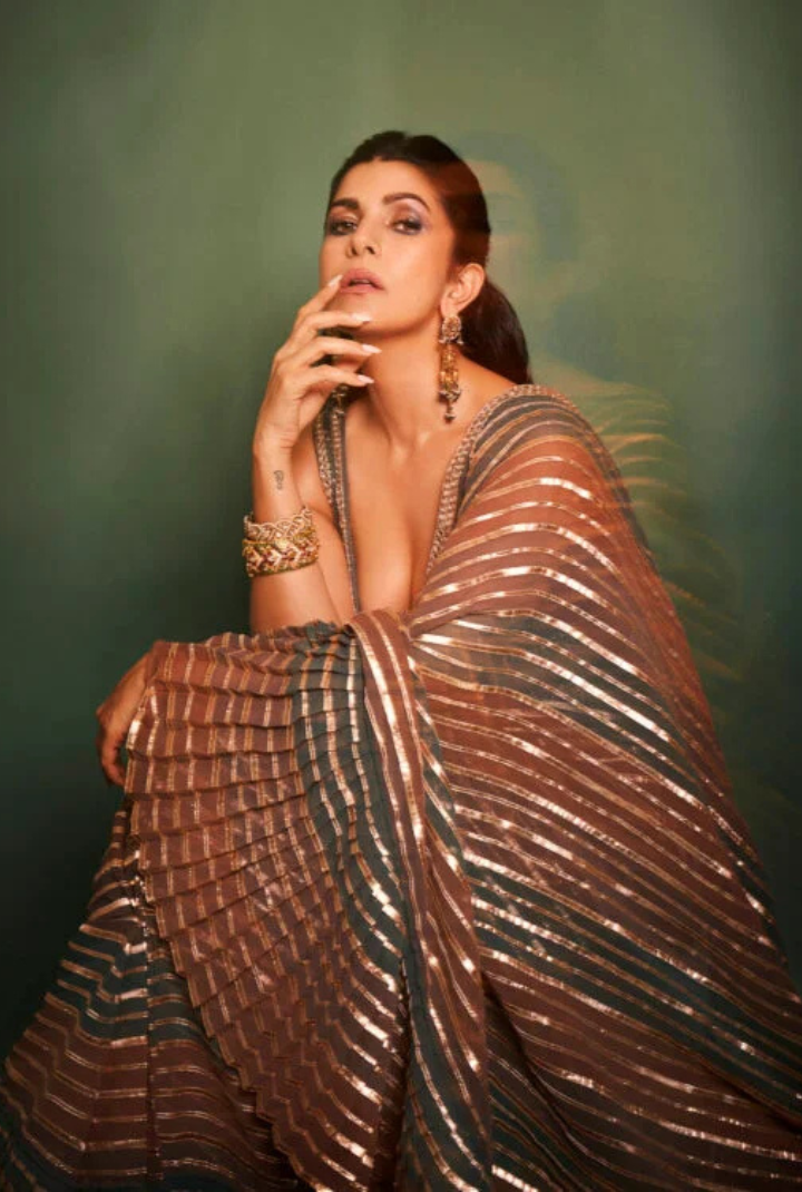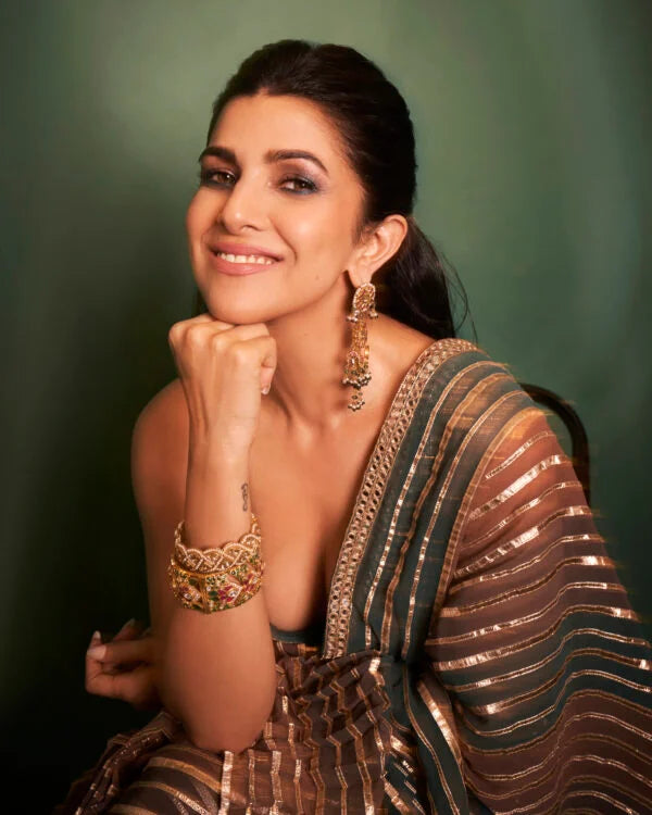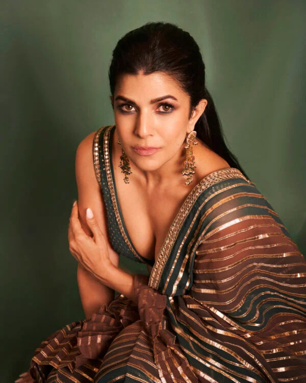 Pre Draped Mud Green Multi Color Saree Set (NIMRAT KAUR)